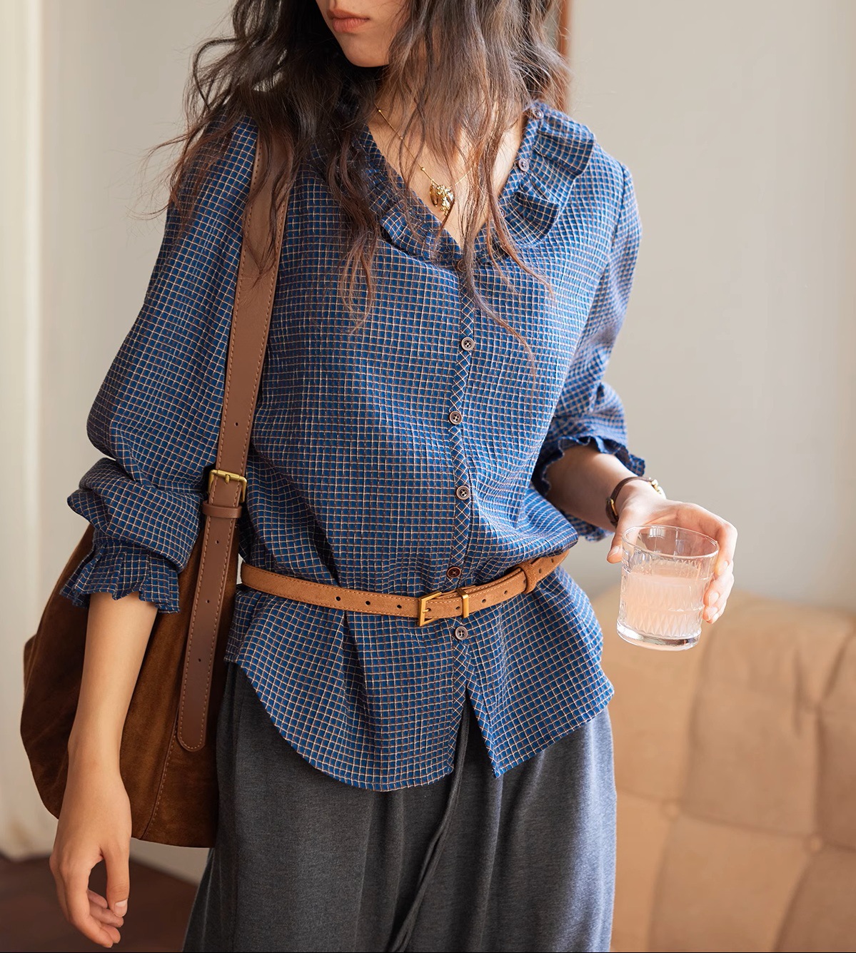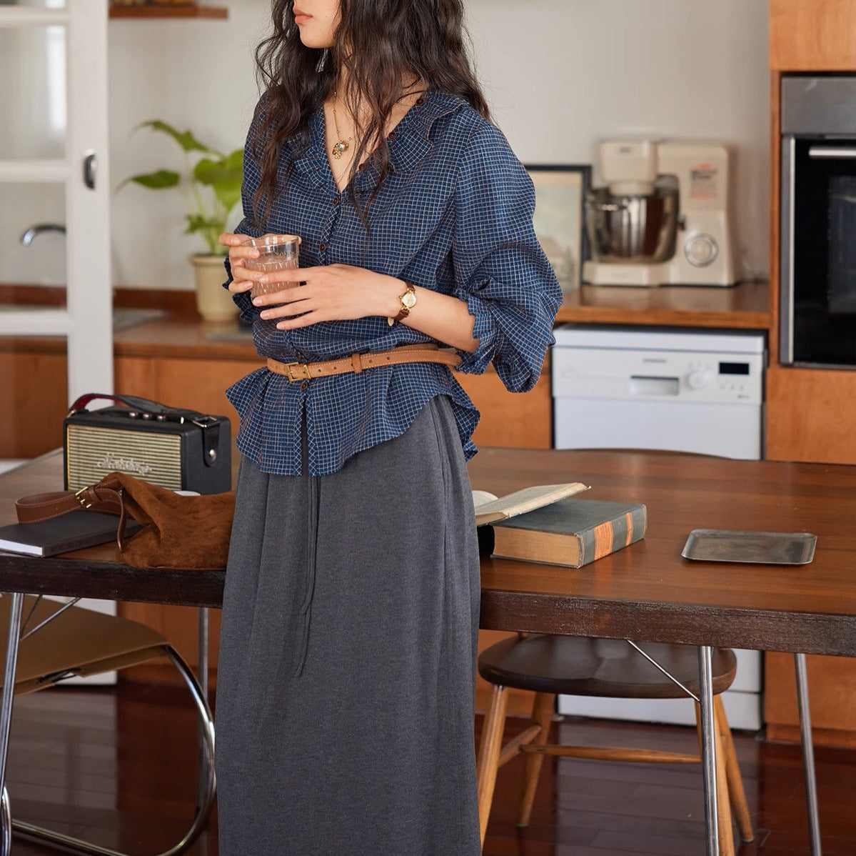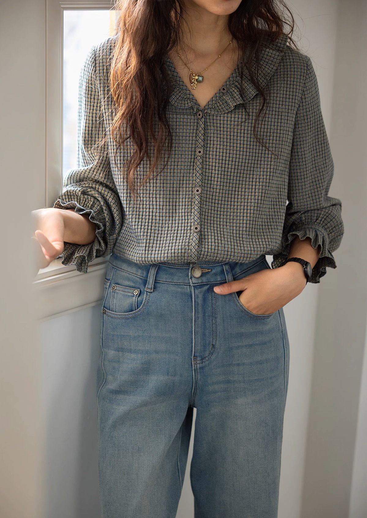 Solighter French Vintage V-Neck Checked Shirt Women's Autumn