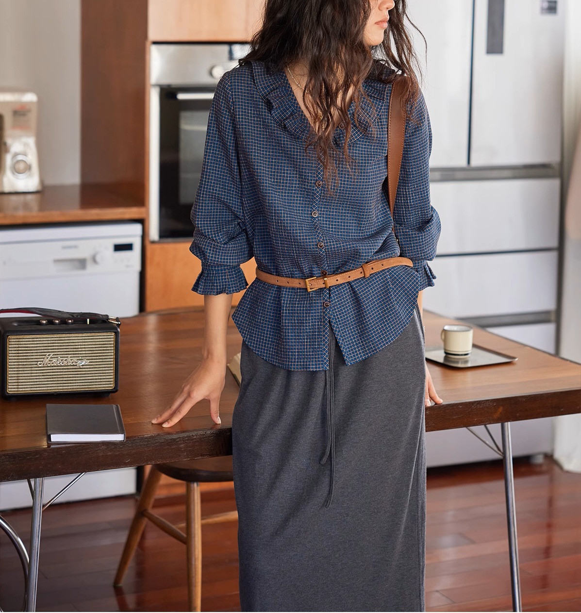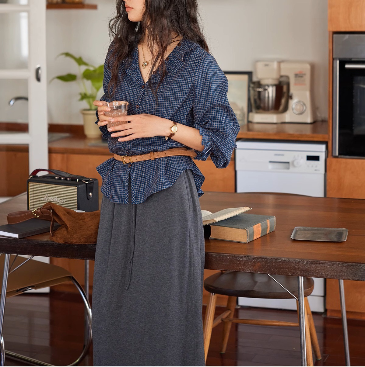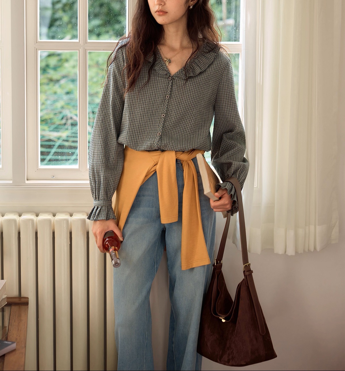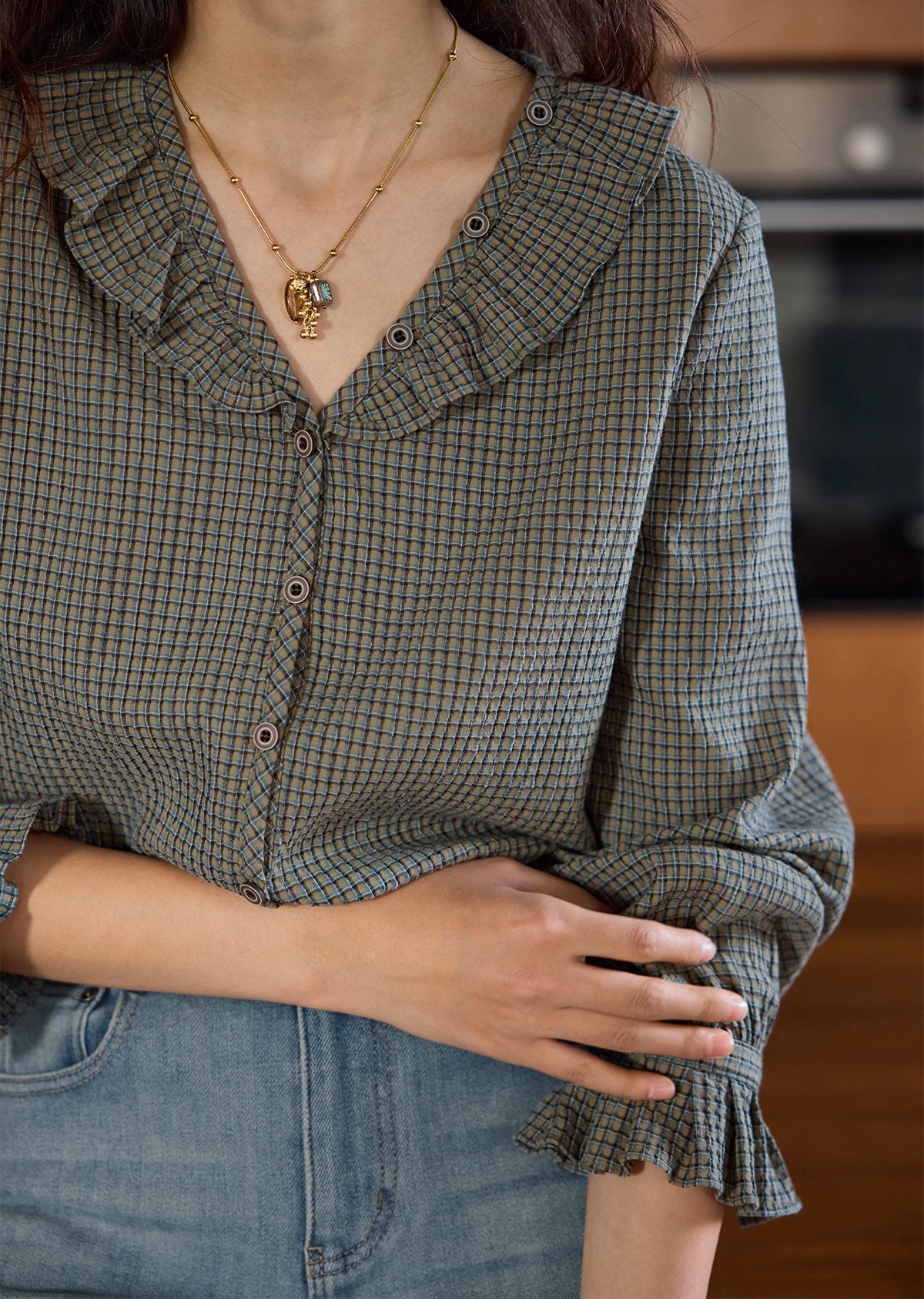 Solighter French Vintage V-Neck Checked Shirt Women's Autumn