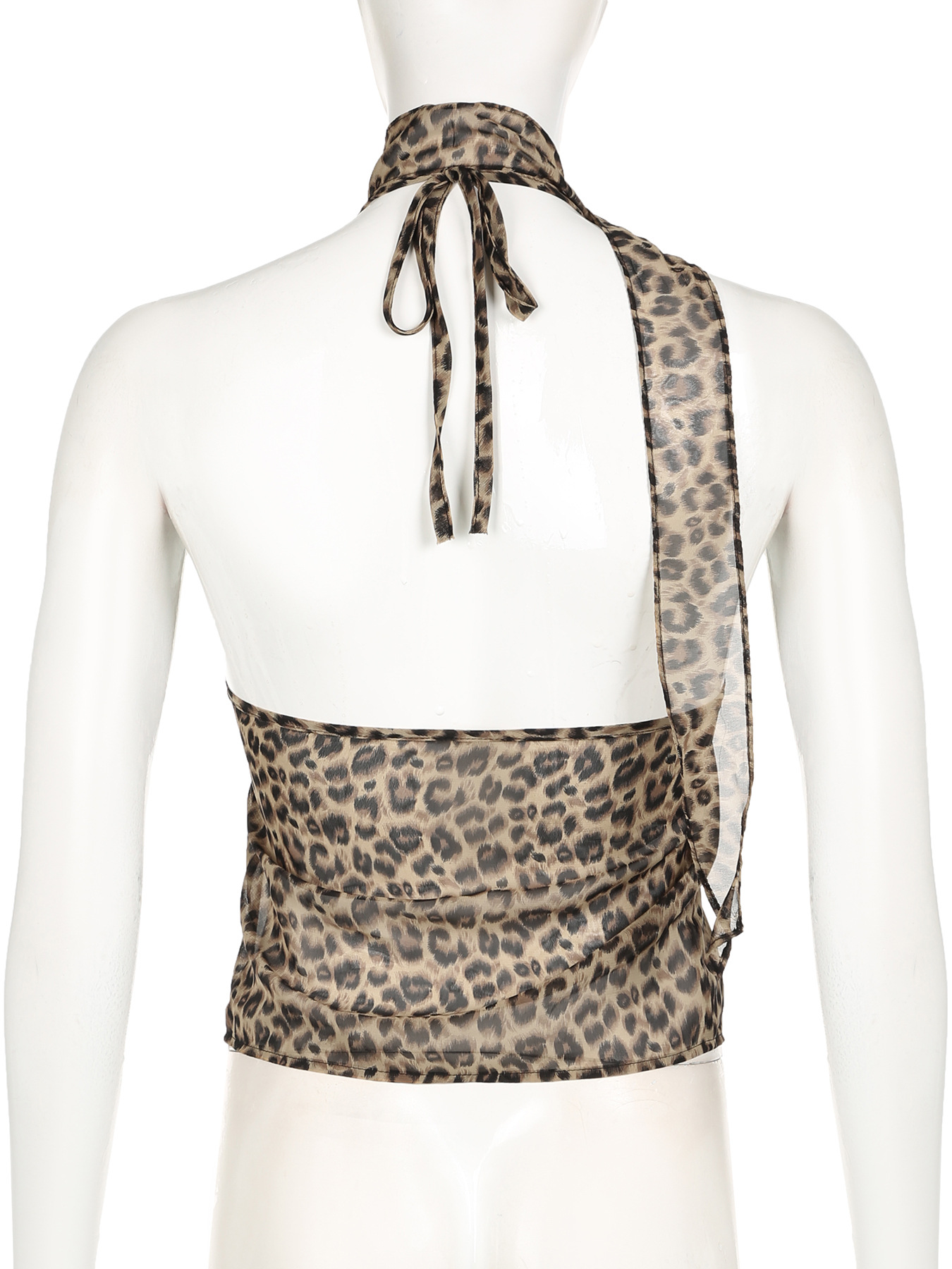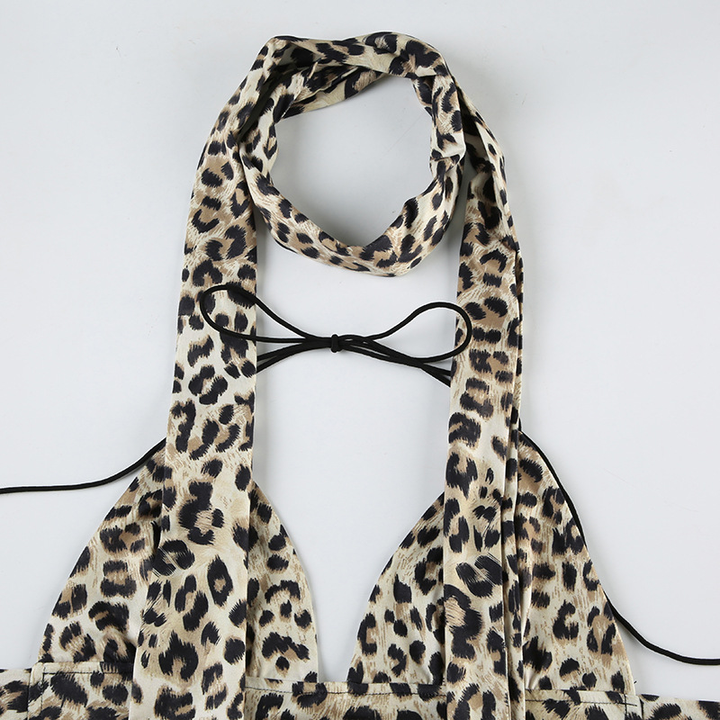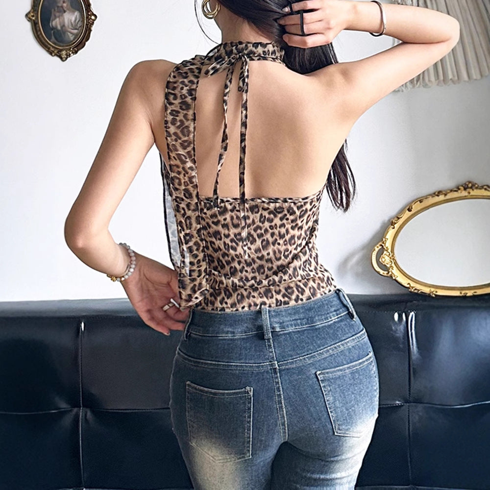Spice girl sexy leopard print scarf ruffle edge sling vest vacation style low cut backless versatile top