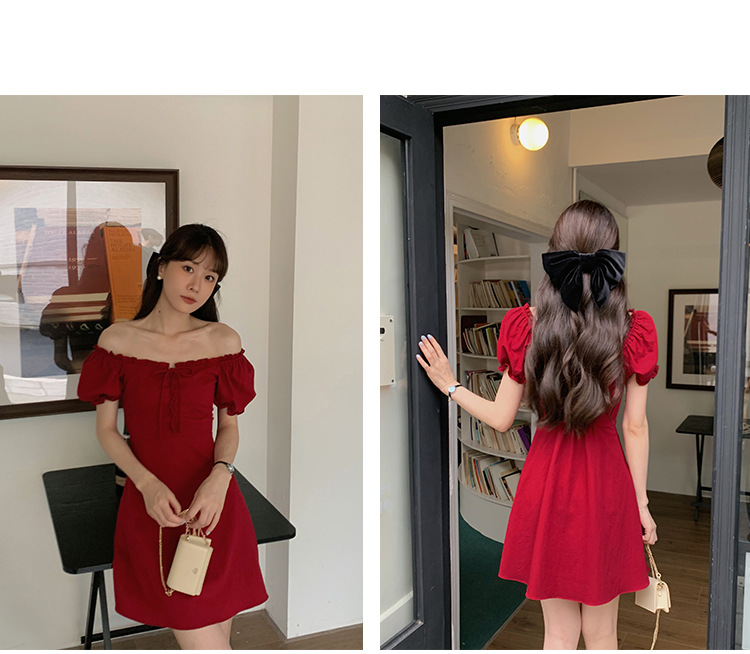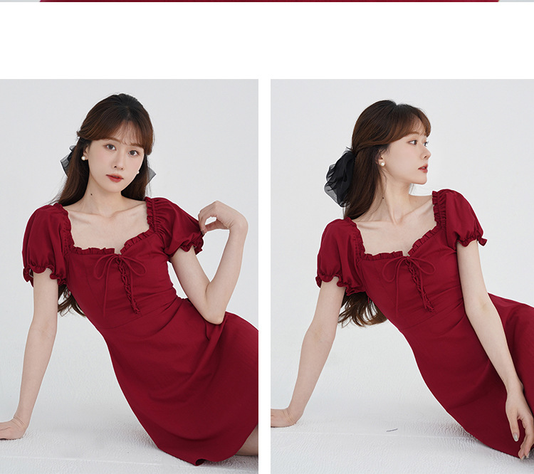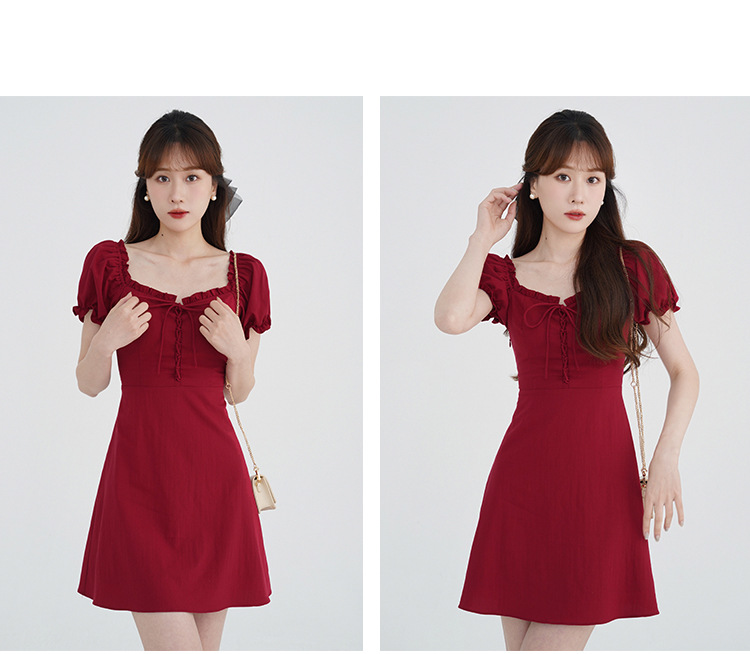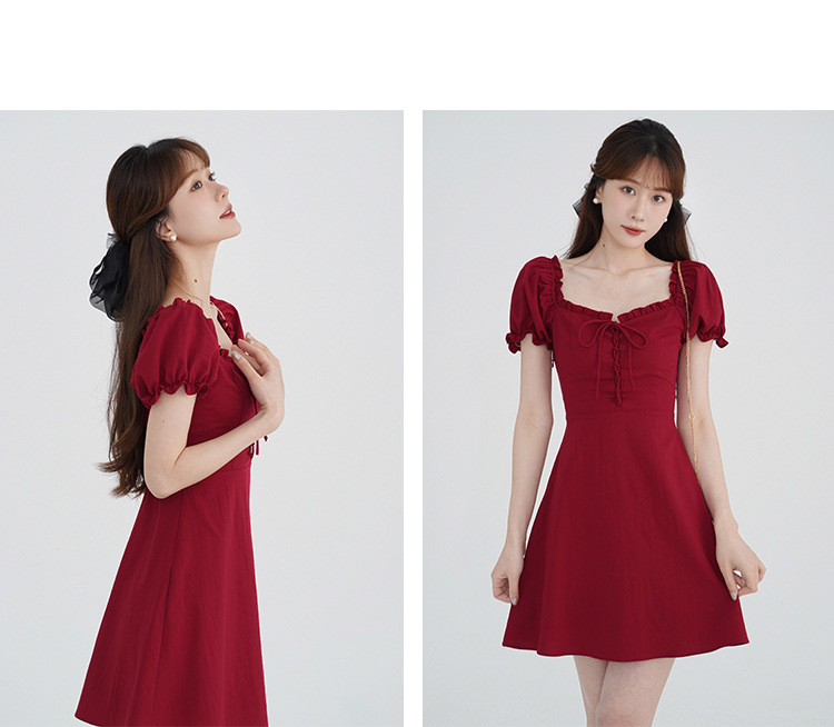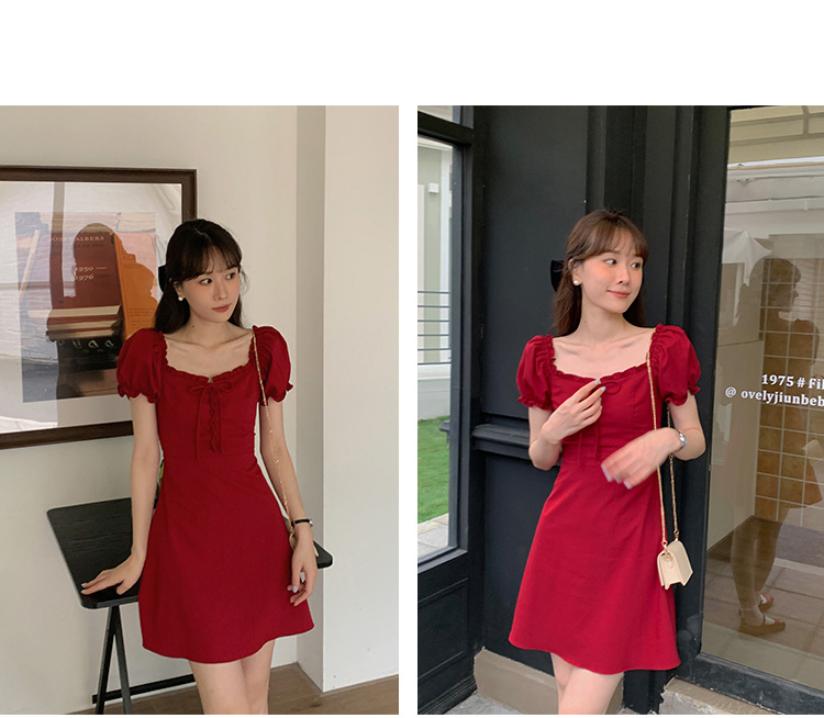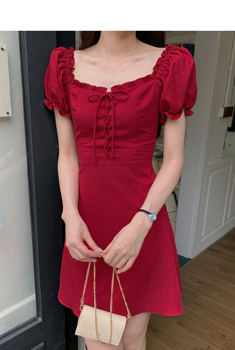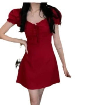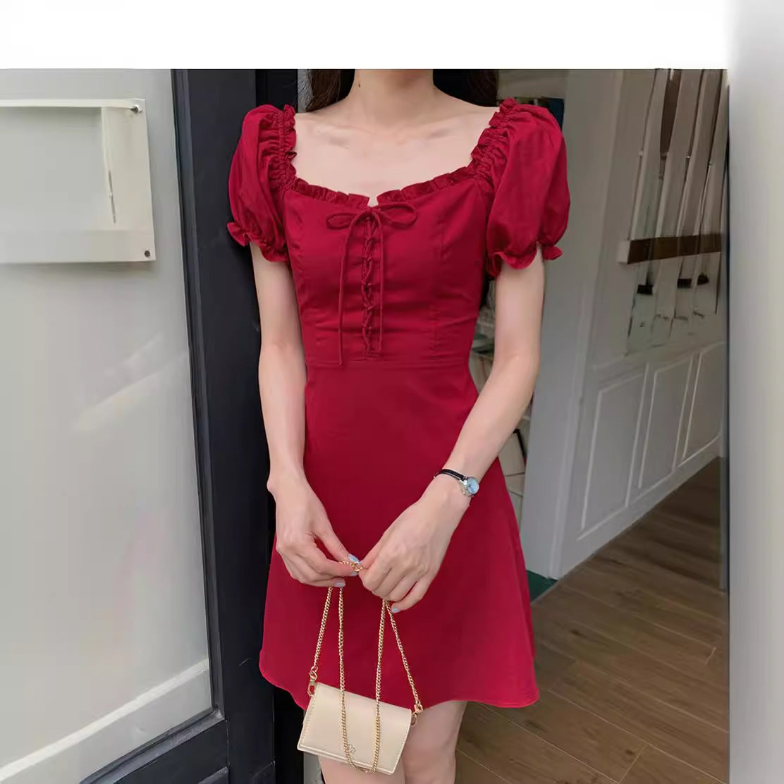 Square neck bubble sleeve dress women's summer Platycodon French design feeling waist thin red a-word short skirt