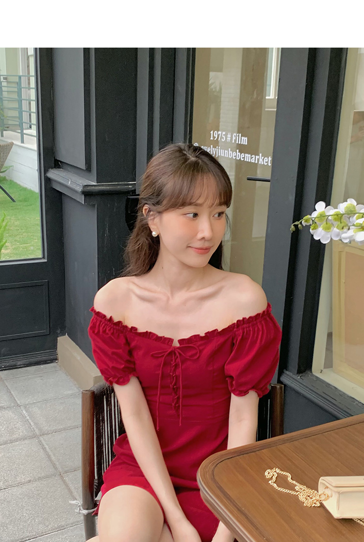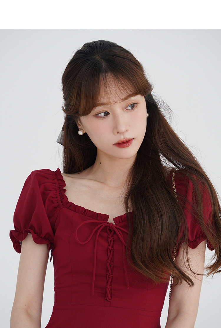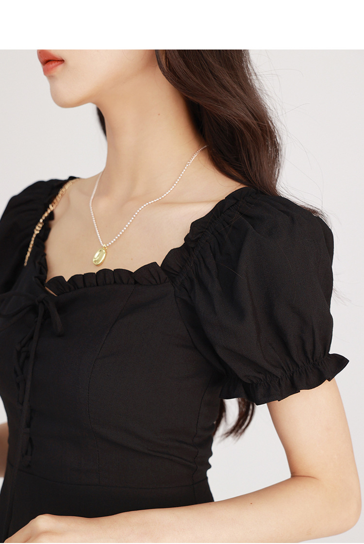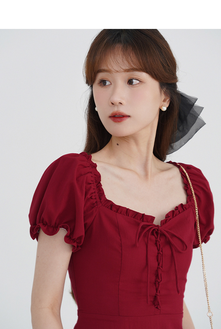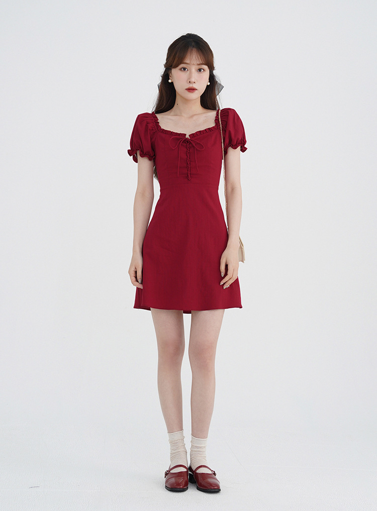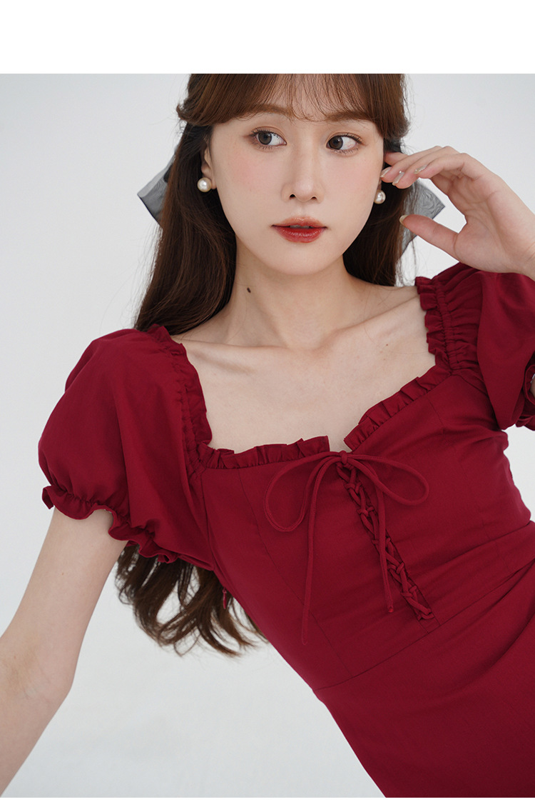 Square neck bubble sleeve dress women's summer Platycodon French design feeling waist thin red a-word short skirt