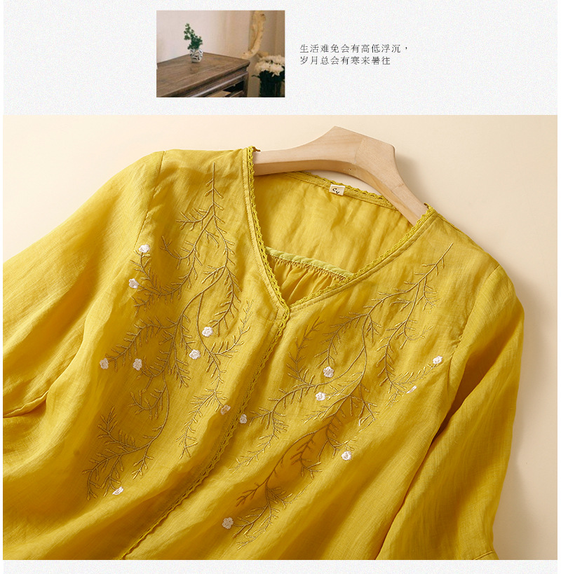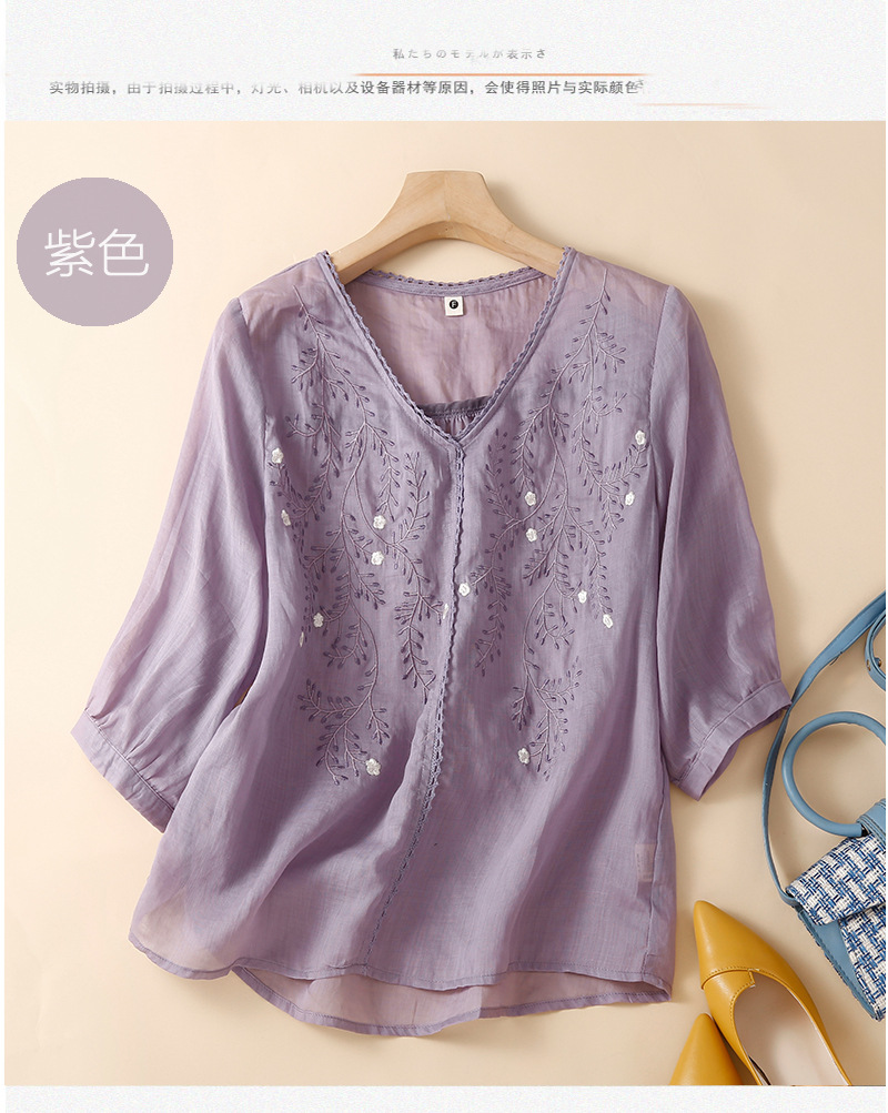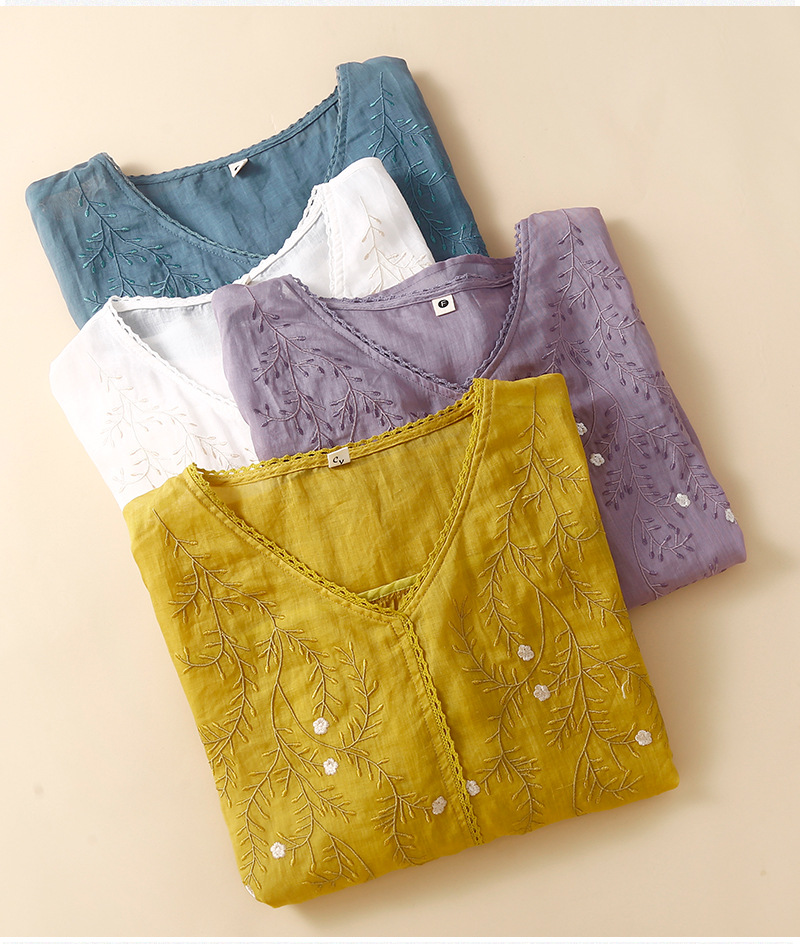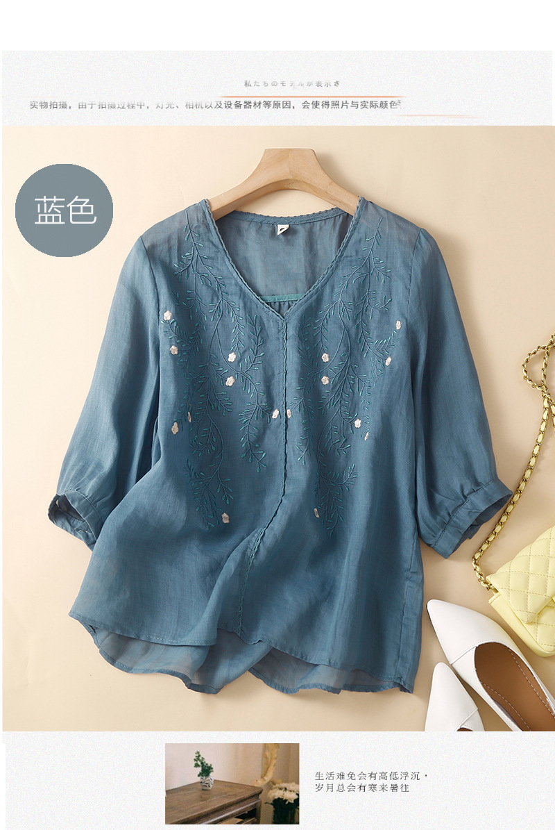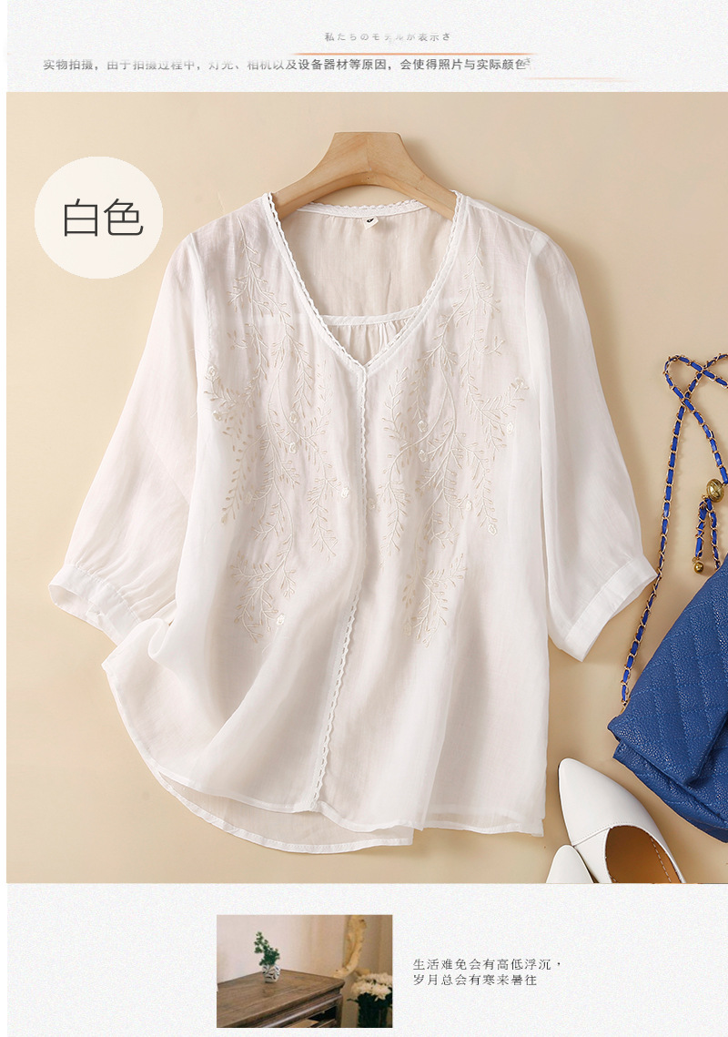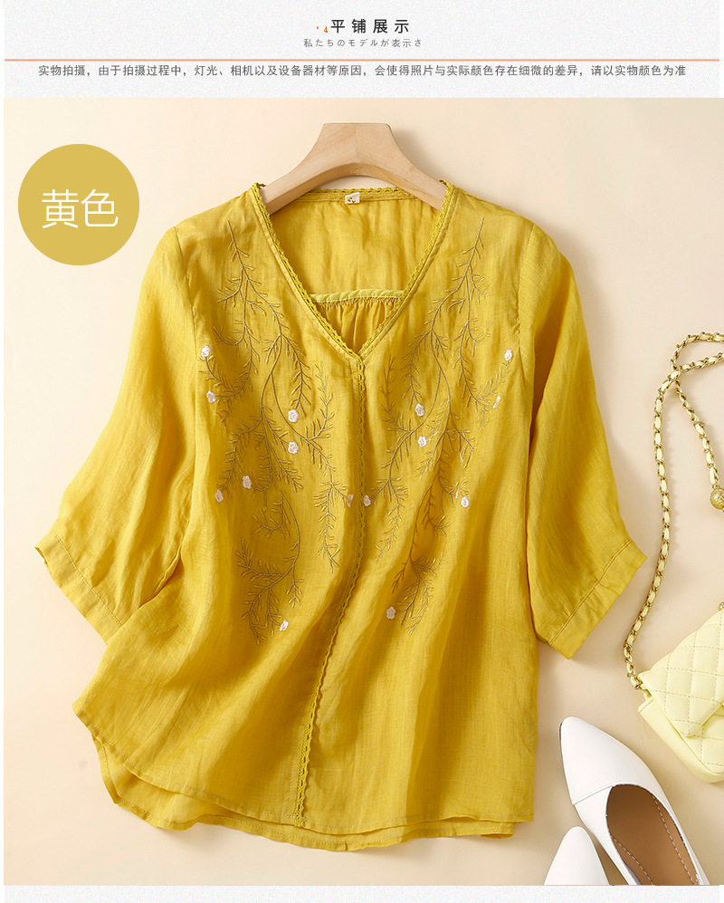 Summer 2024 new literary loose thin cotton and linen embroidered flower V-neck five-quarter sleeve T-shirt women's shirt top