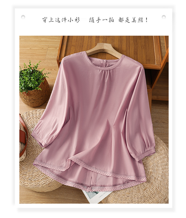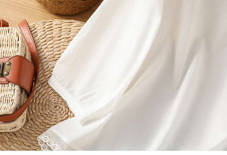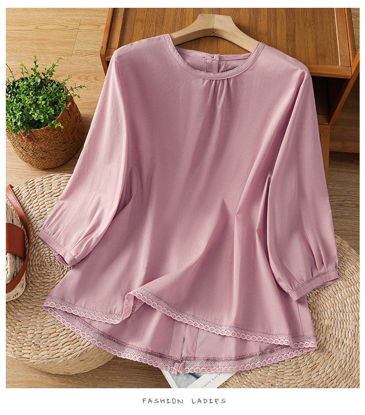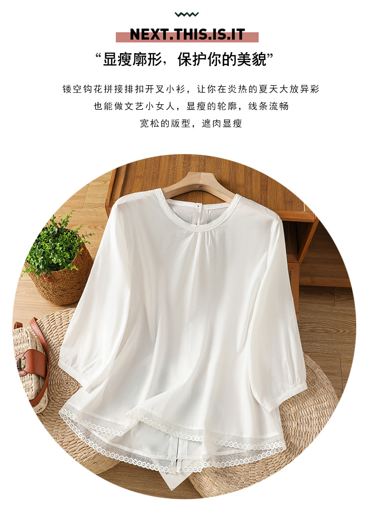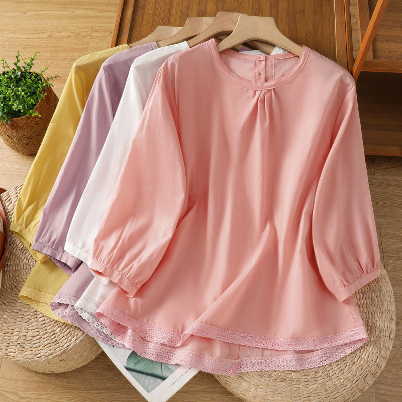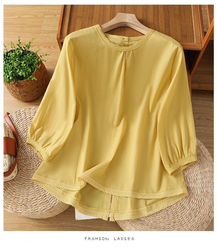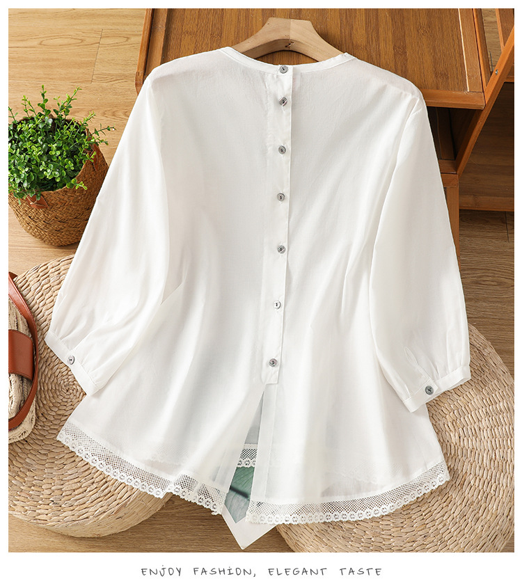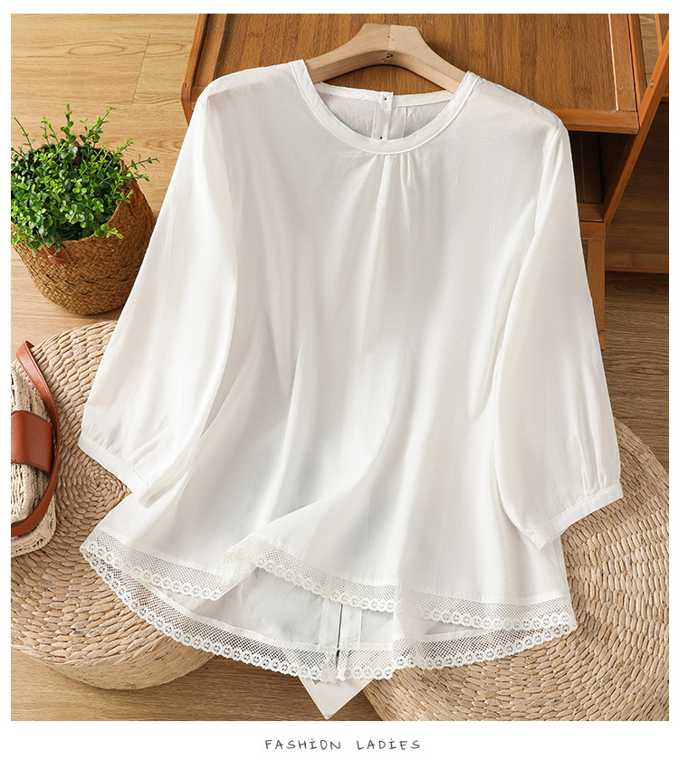 Summer 2025 new cotton and linen literary and retro splicing lace hem shirt top women