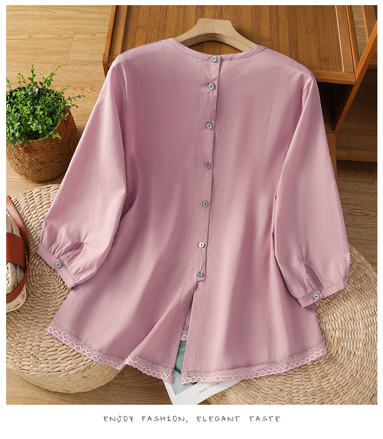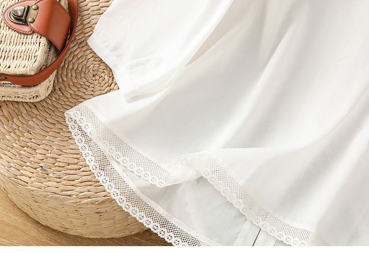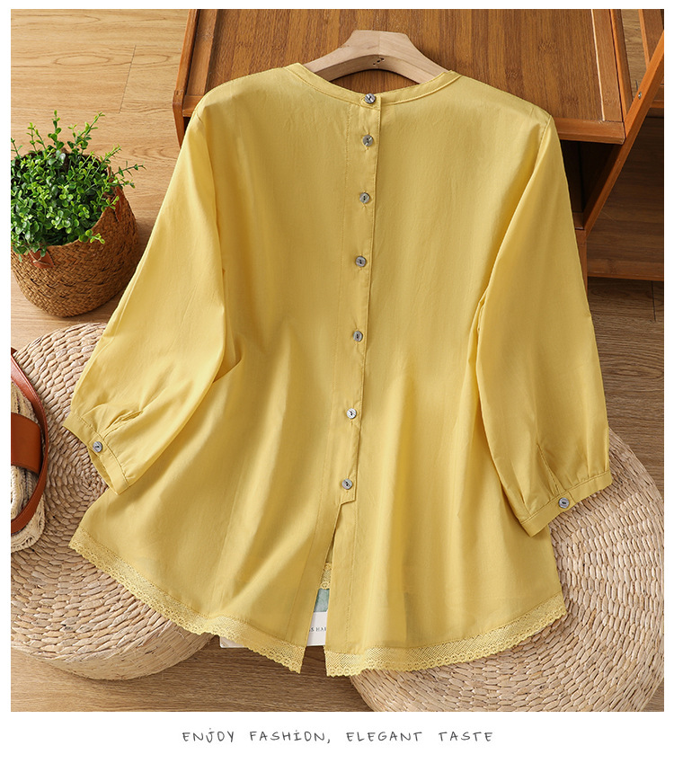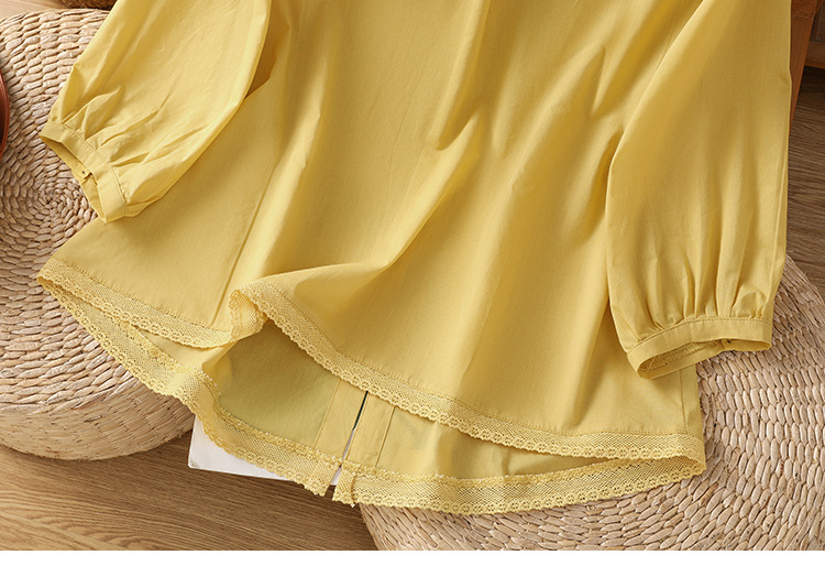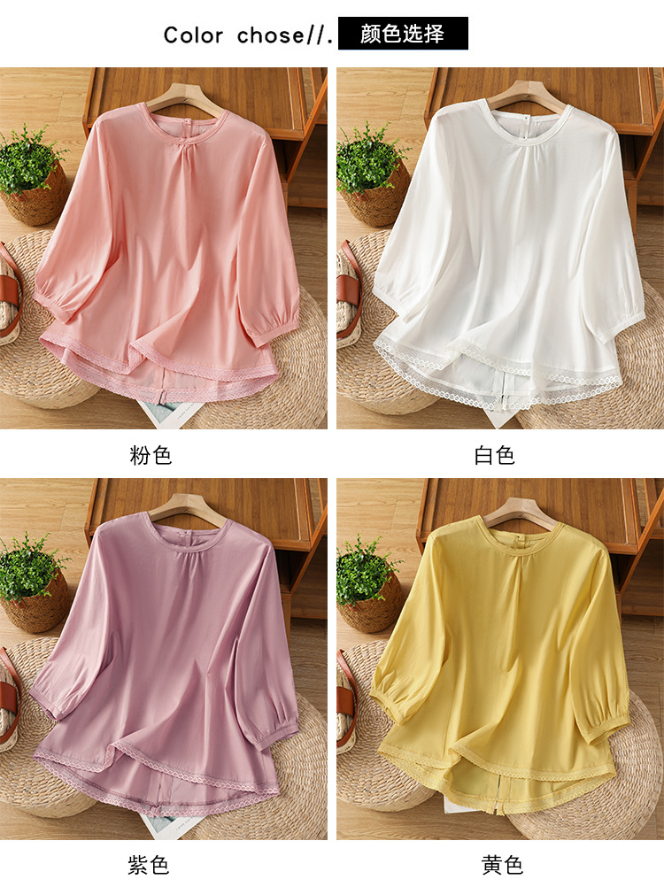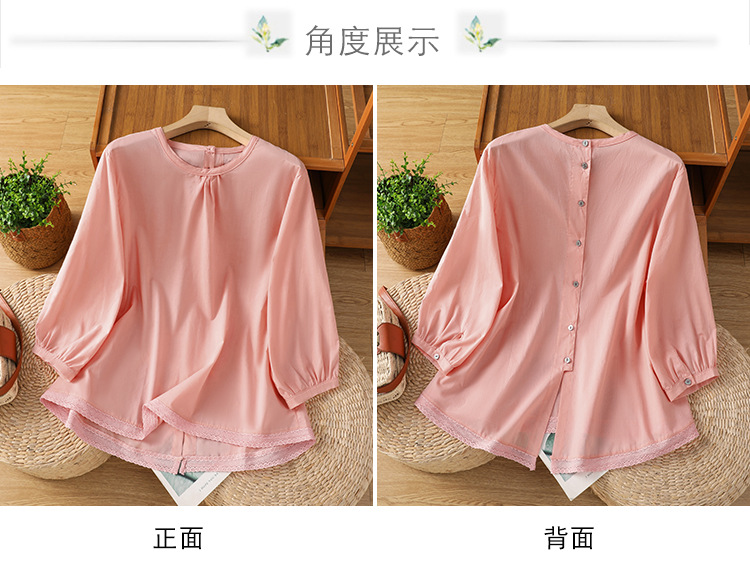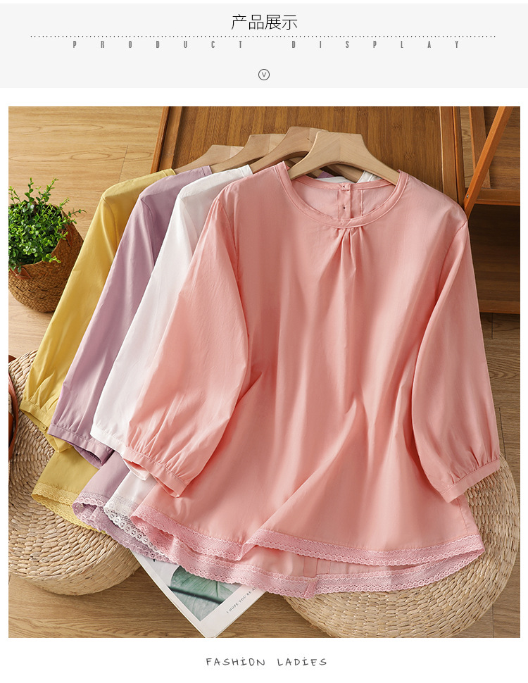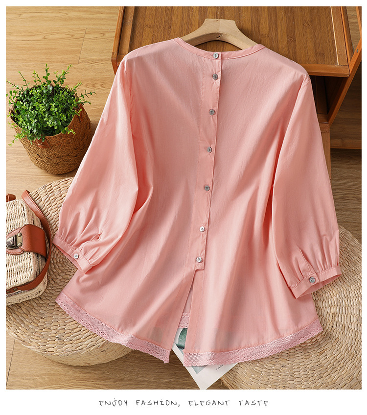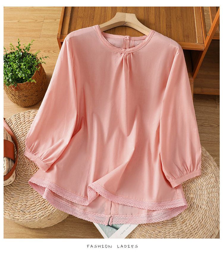 Summer 2025 new cotton and linen literary and retro splicing lace hem shirt top women
