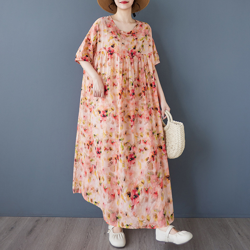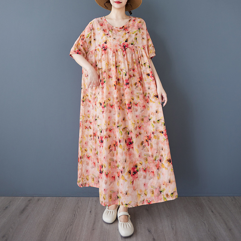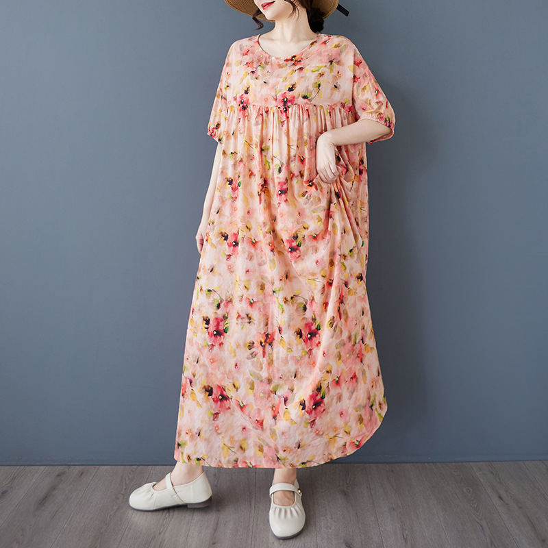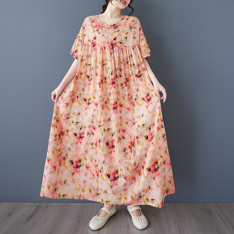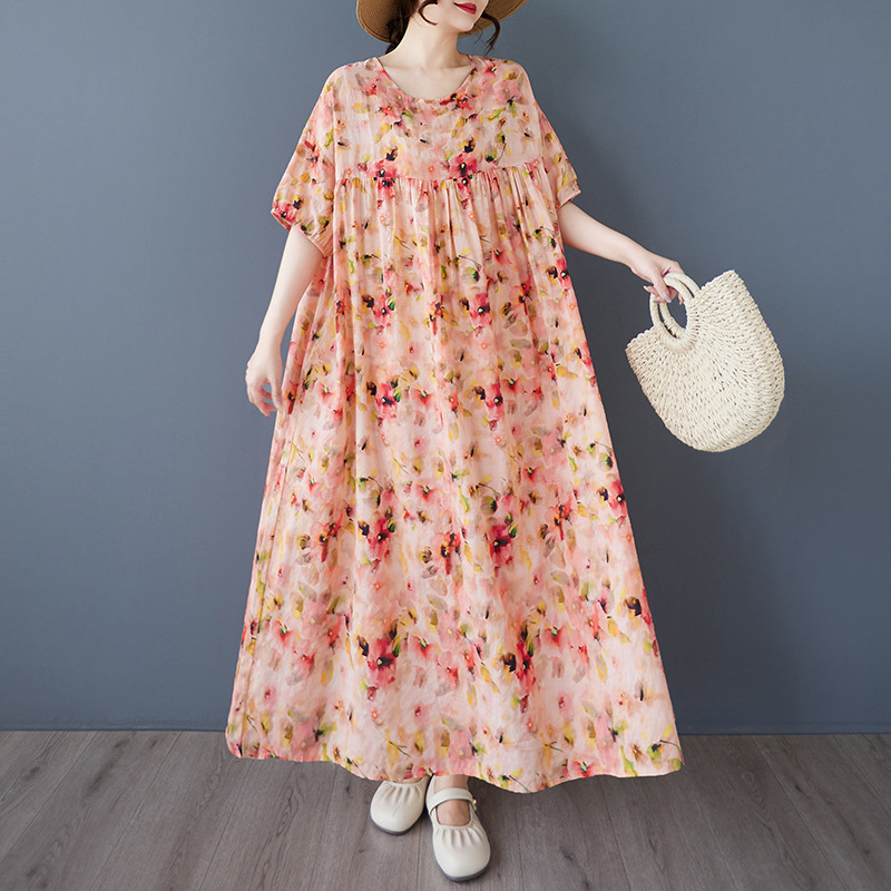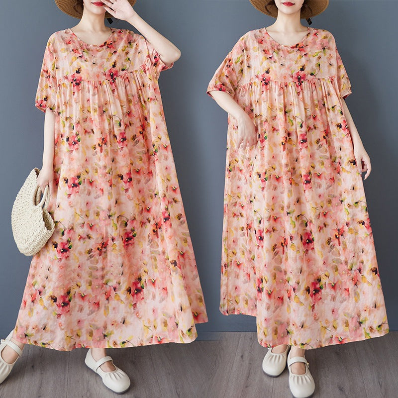 Summer 2025 New Simple Bohemian Fattened Large Short Sleeve Crew Neck Printed Medium and Long Dress Women