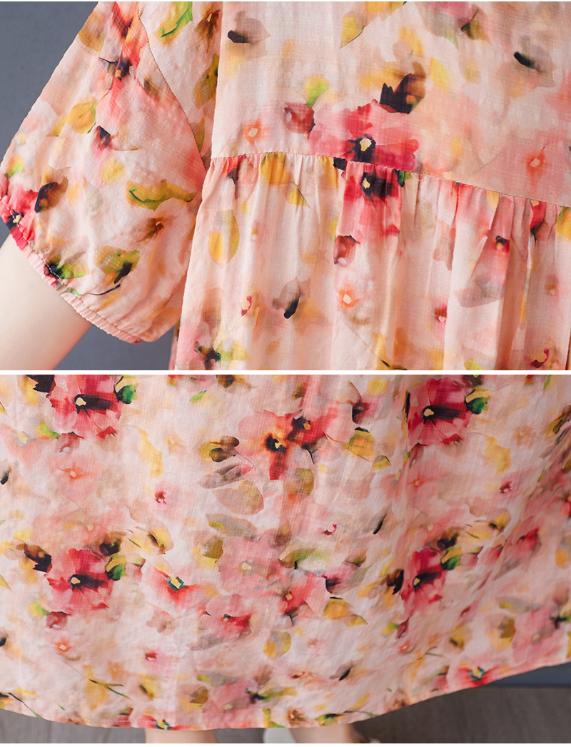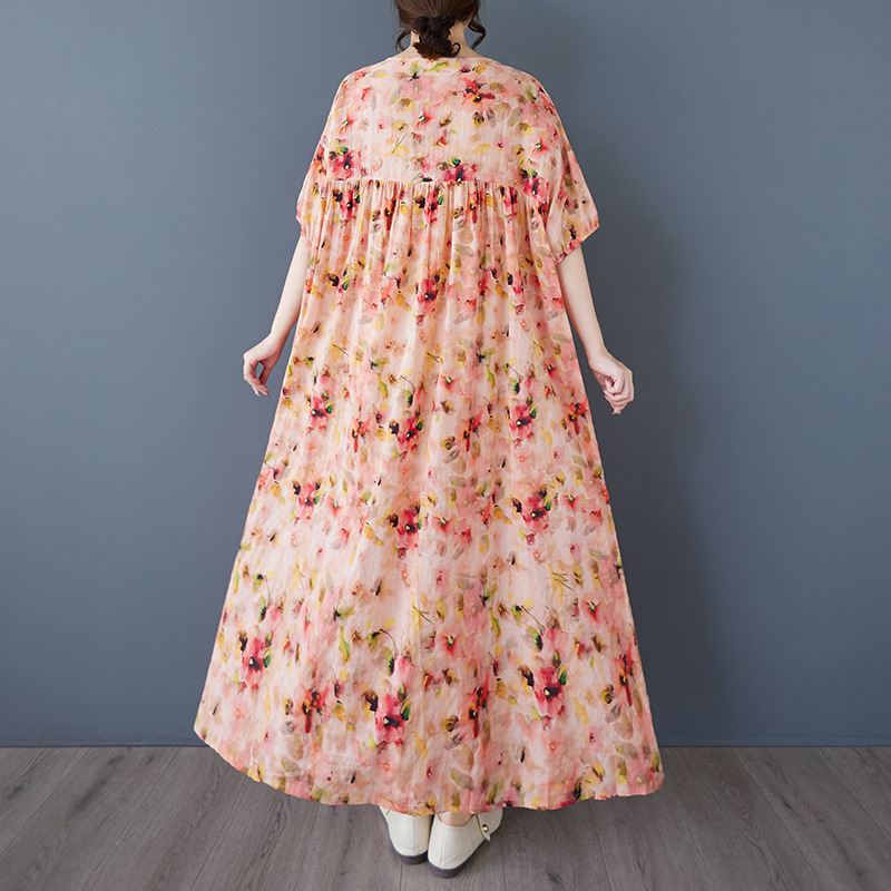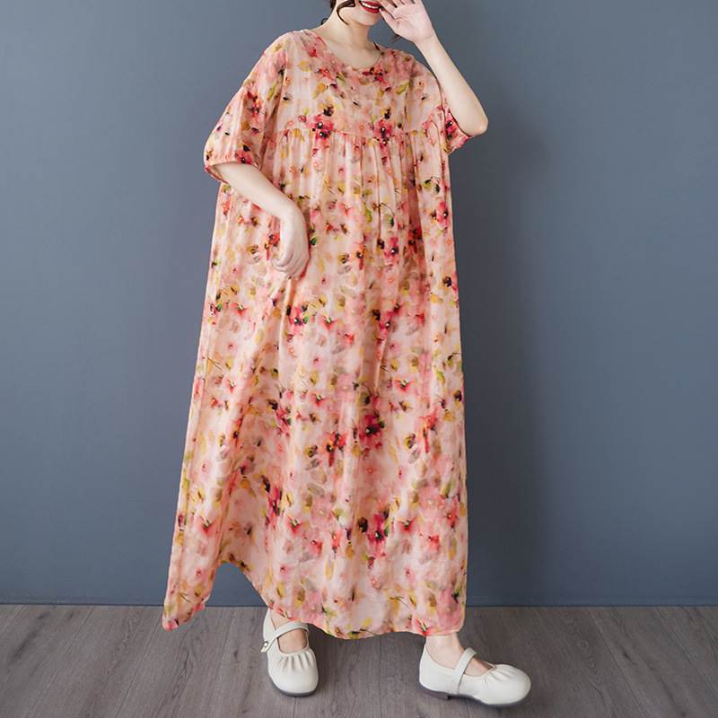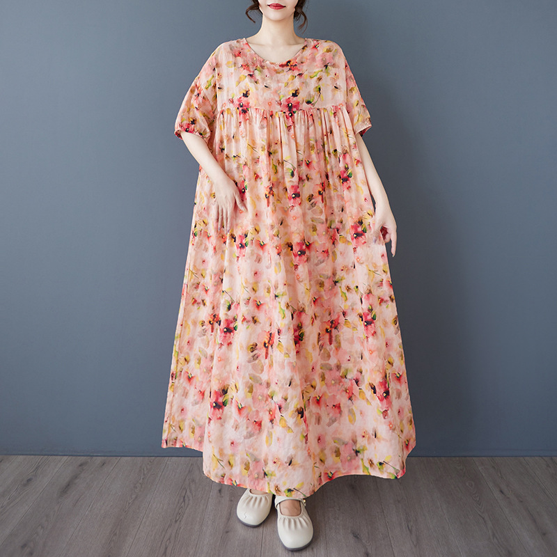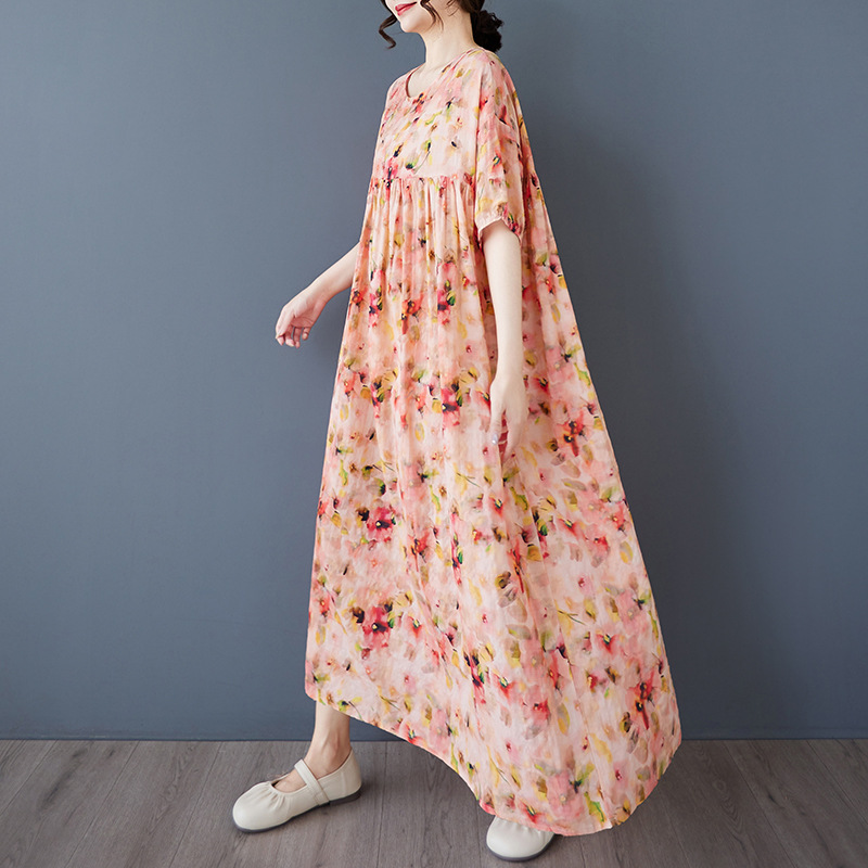 Summer 2025 New Simple Bohemian Fattened Large Short Sleeve Crew Neck Printed Medium and Long Dress Women