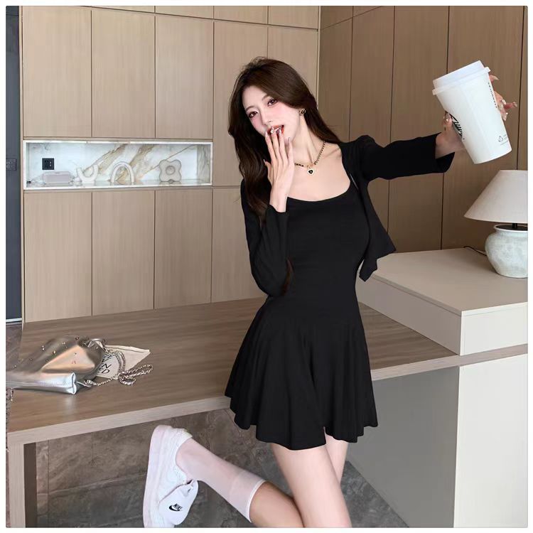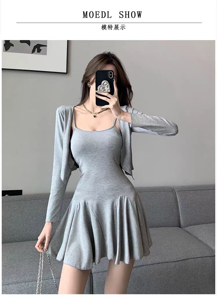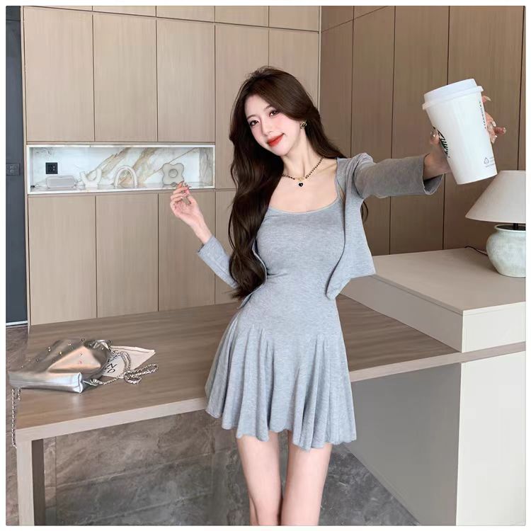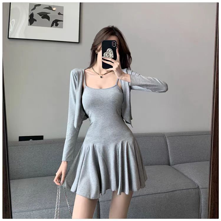 Suspender dress, a complete set in autumn, pear-shaped body, slightly fat girls, thin wear skirt cardigan two-piece set