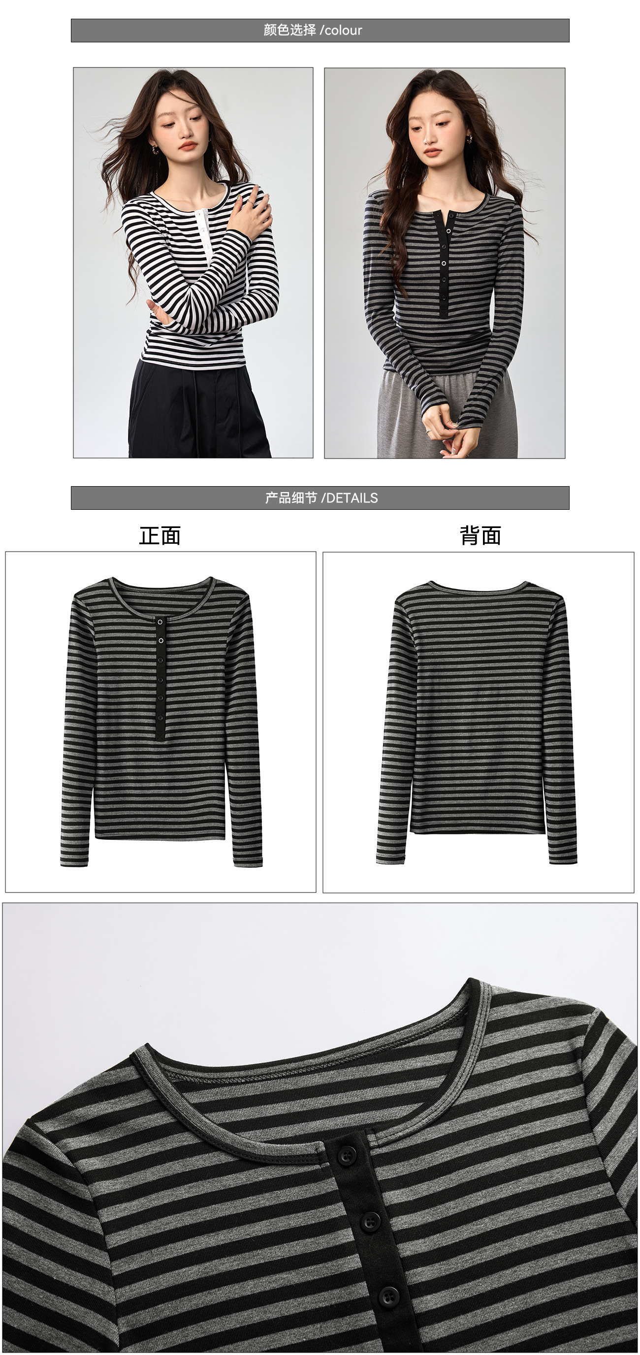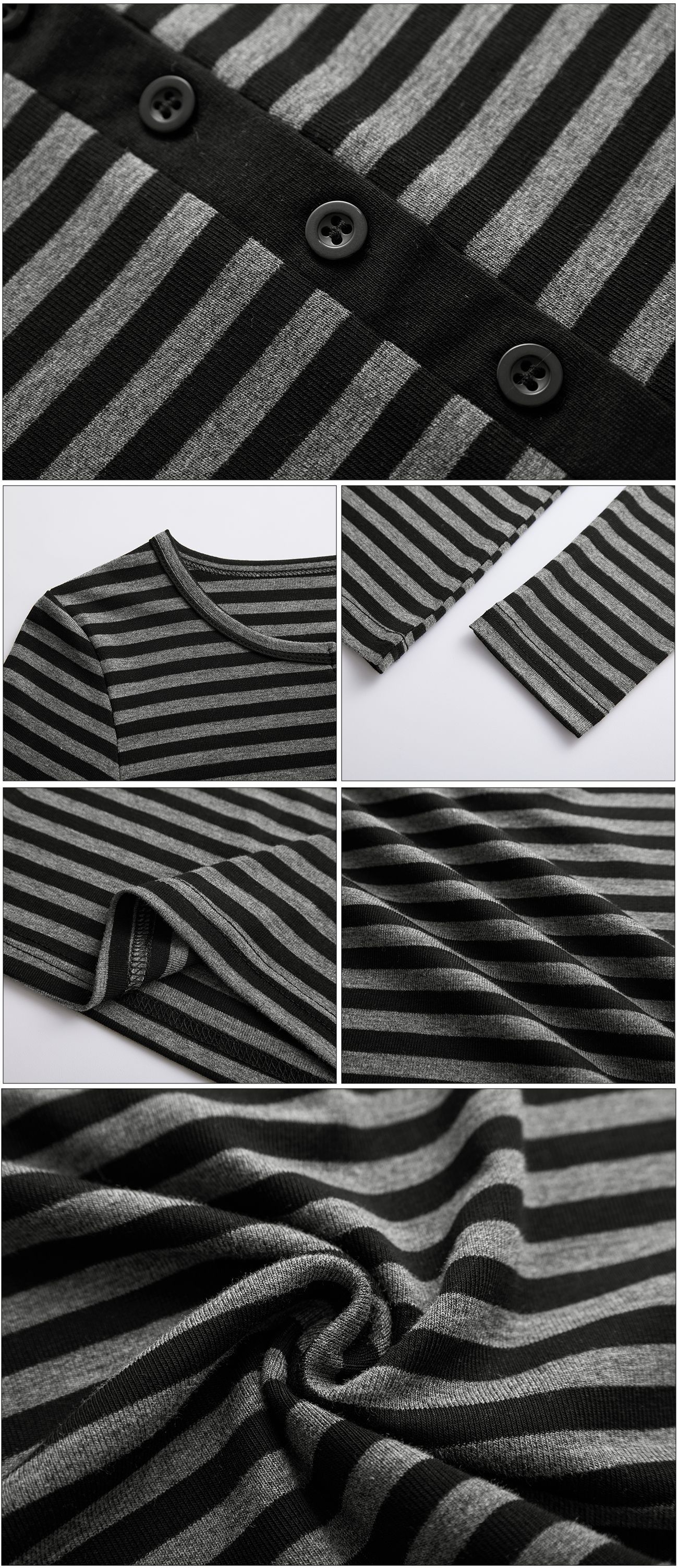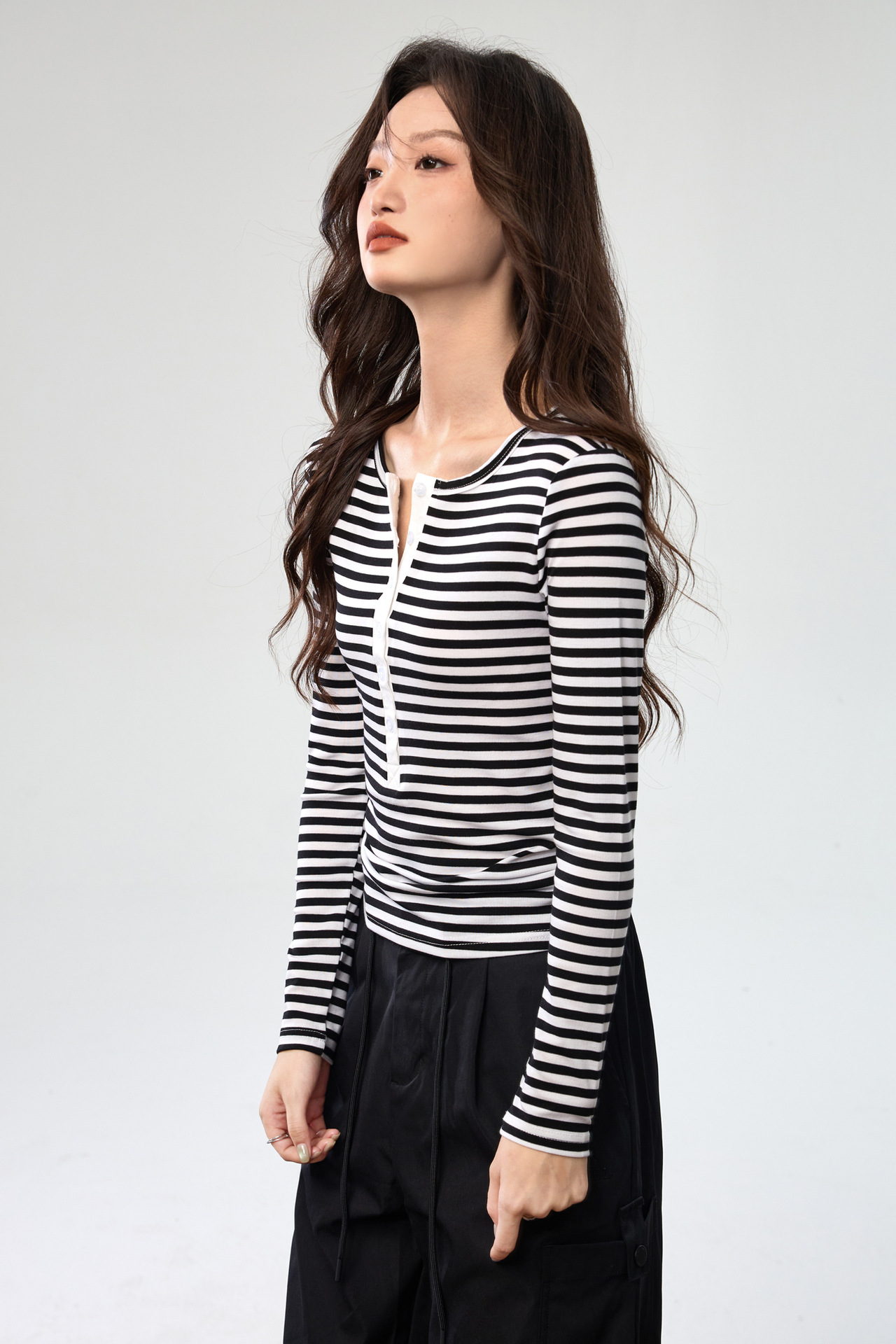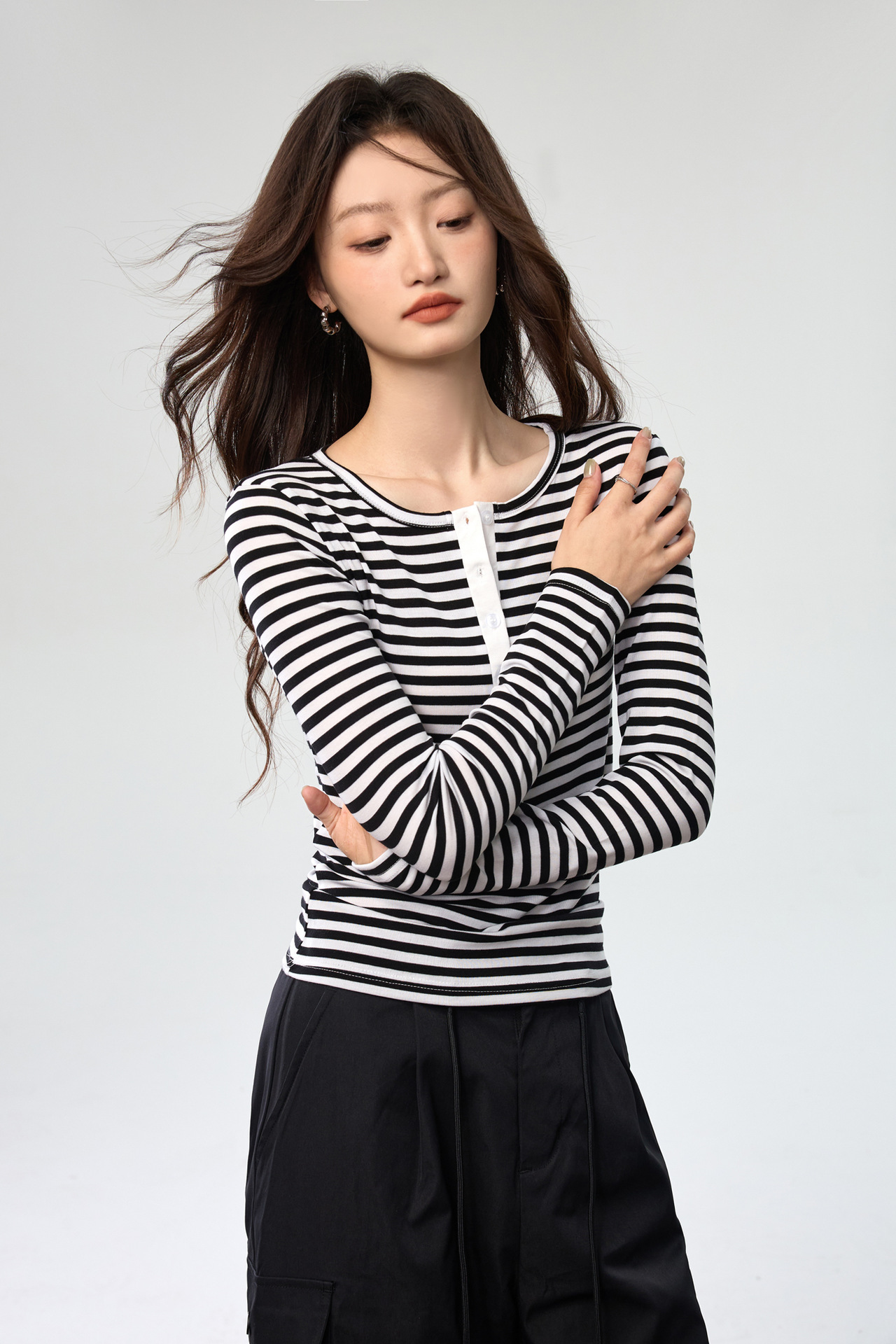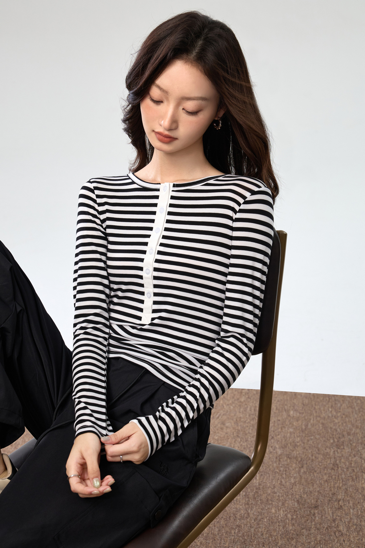 #Tencel Lyocell #Temperament High Sense Black and White Striped Long Sleeve T-Shirt Women's Autumn New Crew Neck Button Top