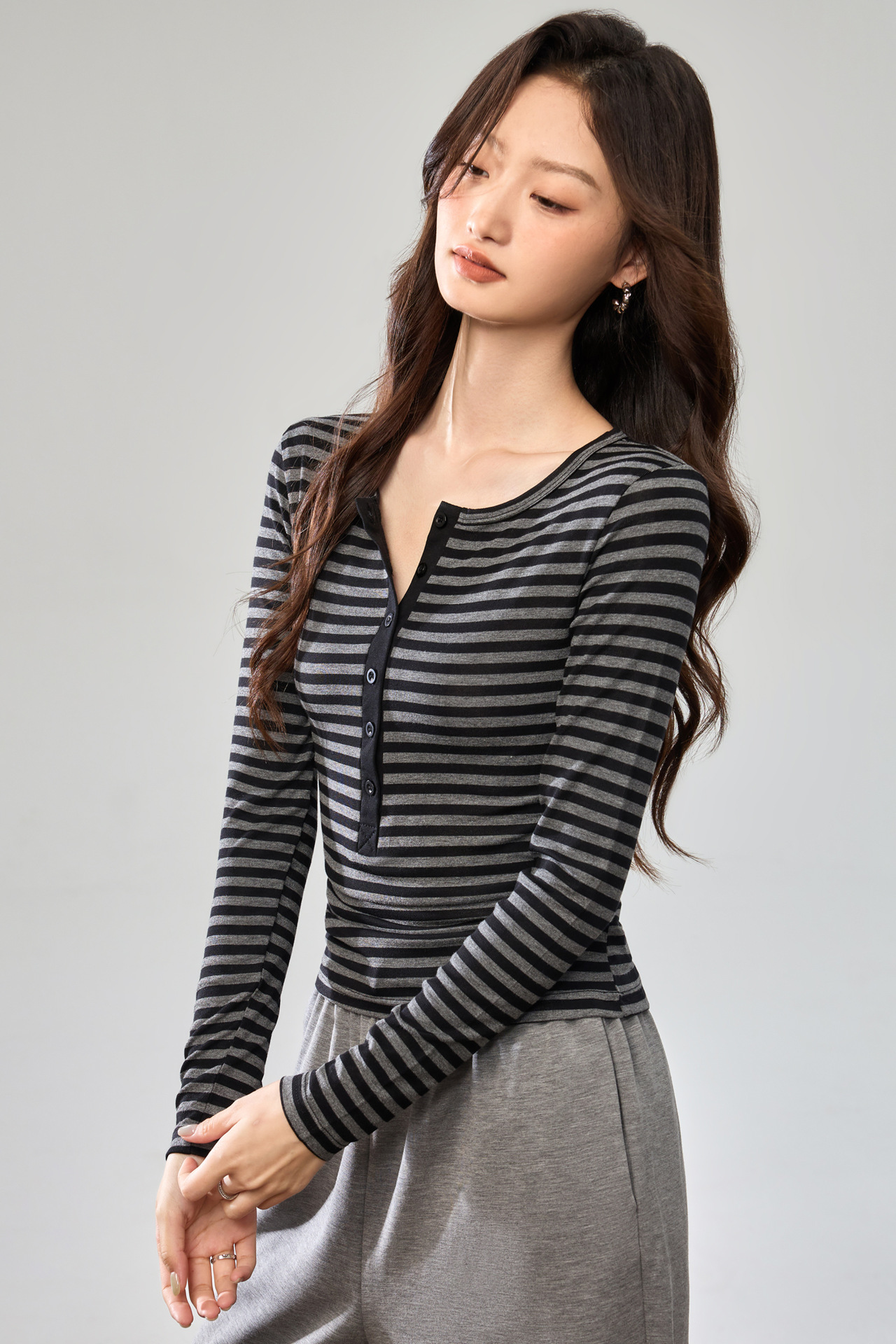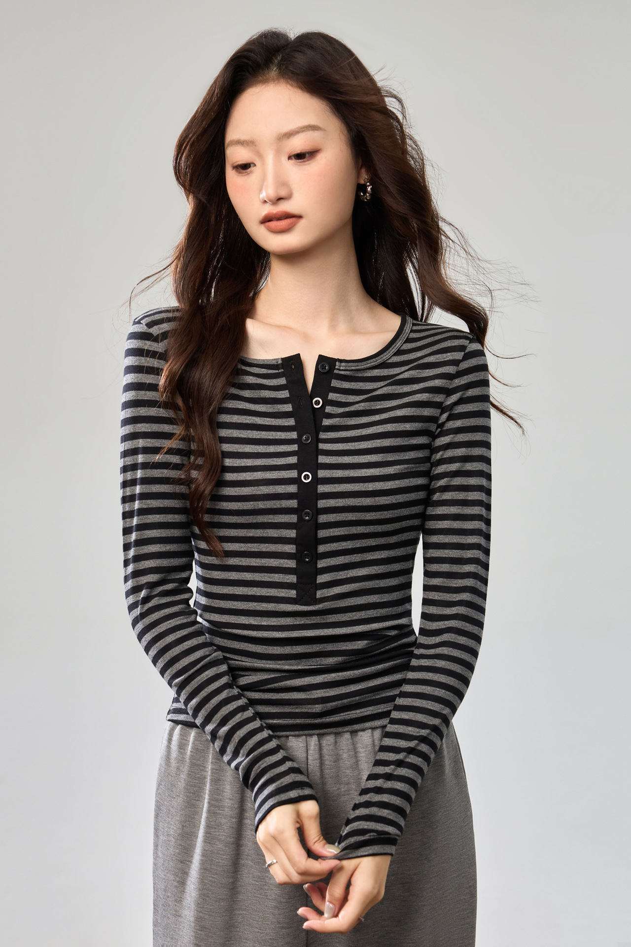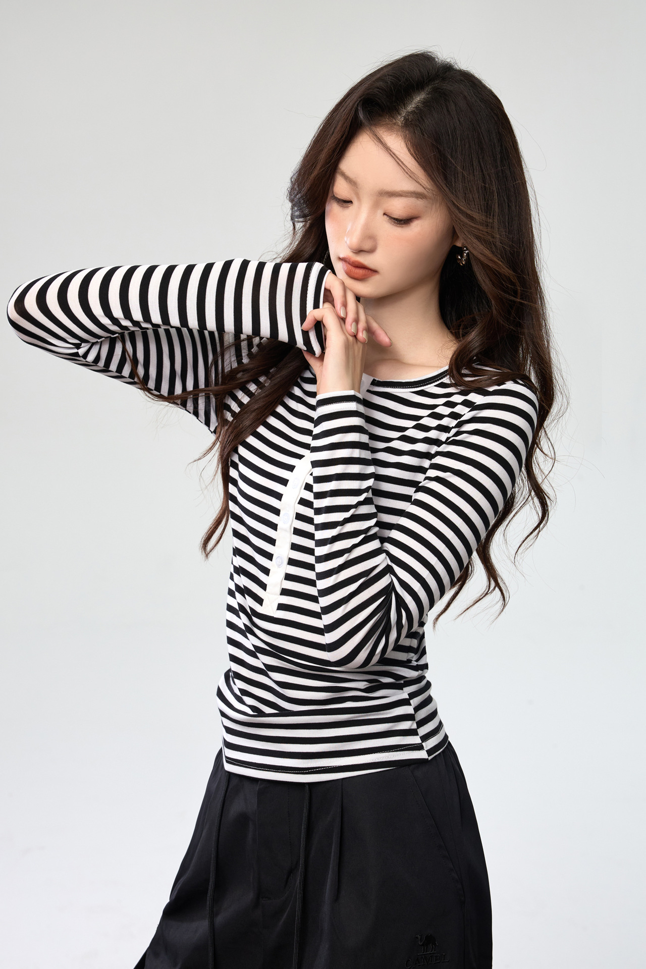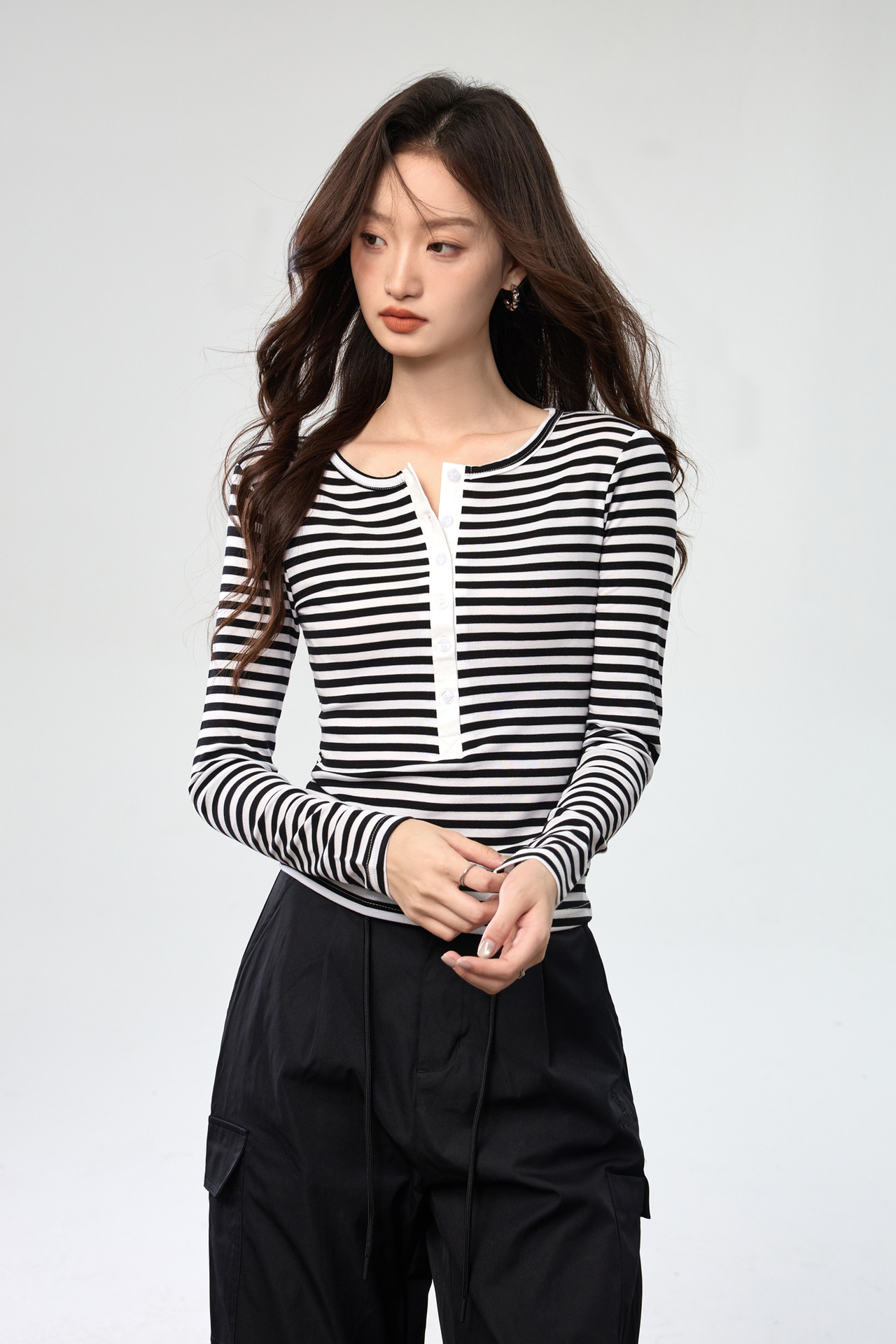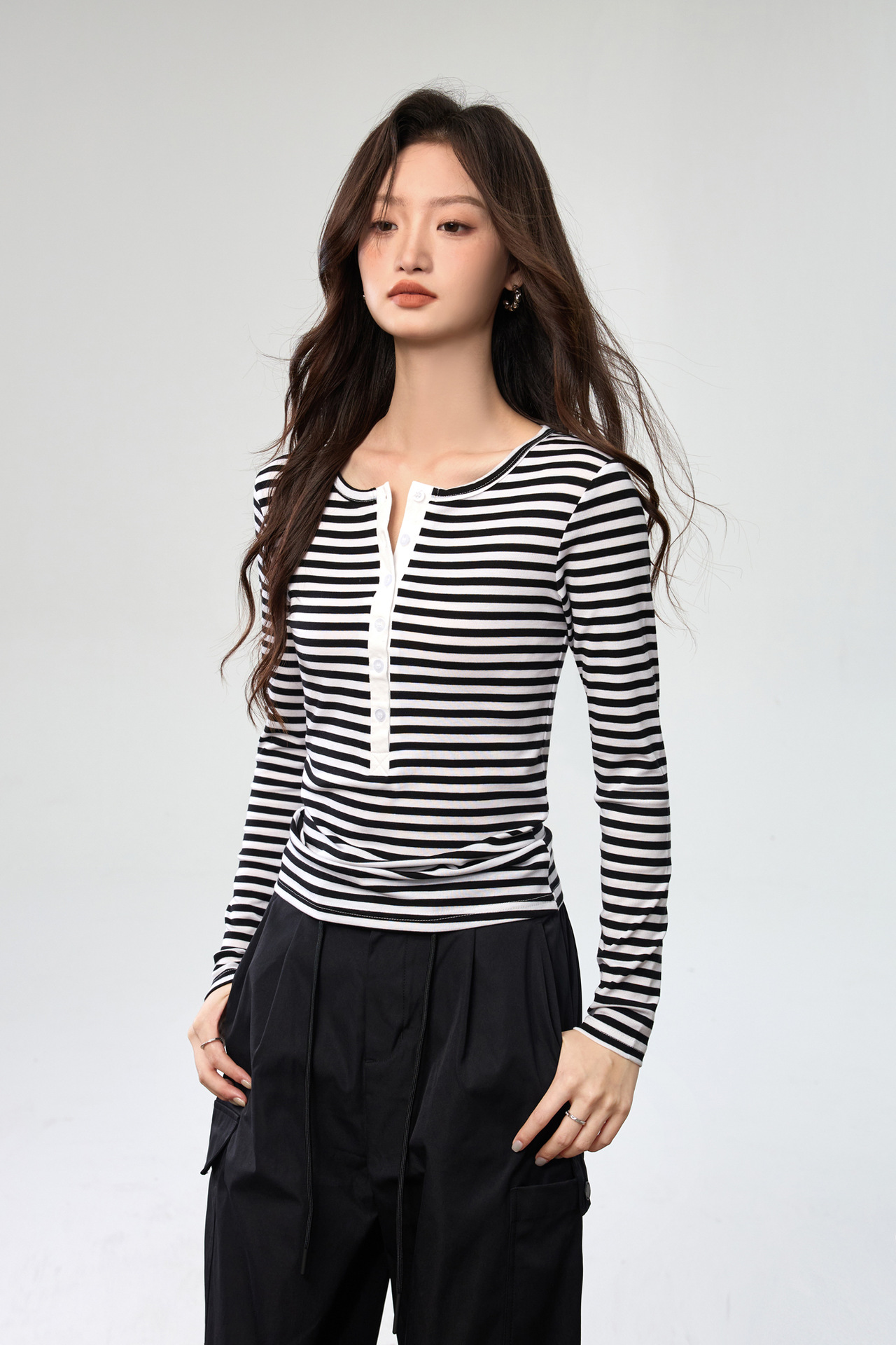 #Tencel Lyocell #Temperament High Sense Black and White Striped Long Sleeve T-Shirt Women's Autumn New Crew Neck Button Top