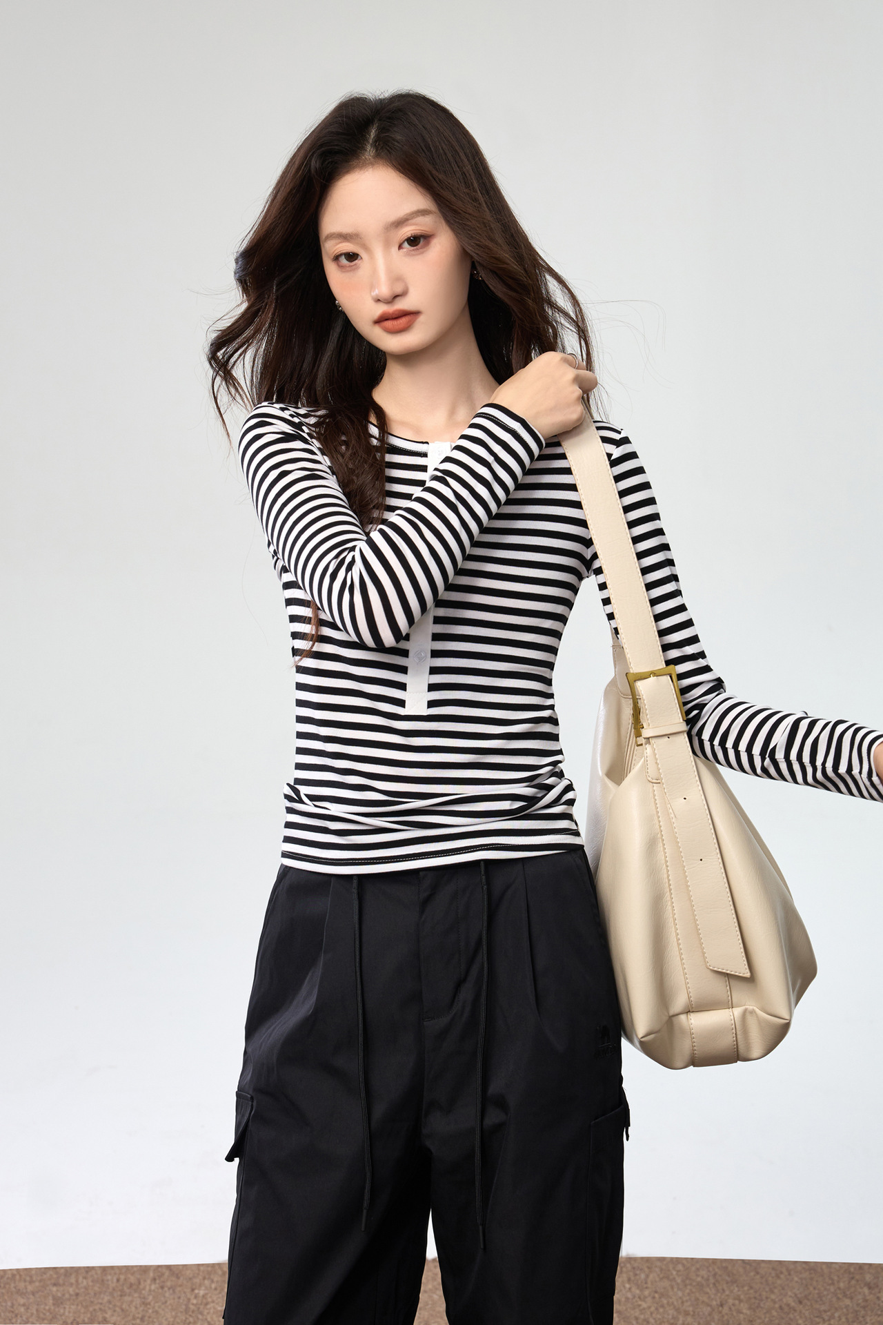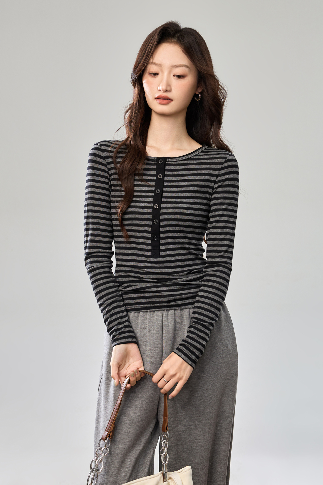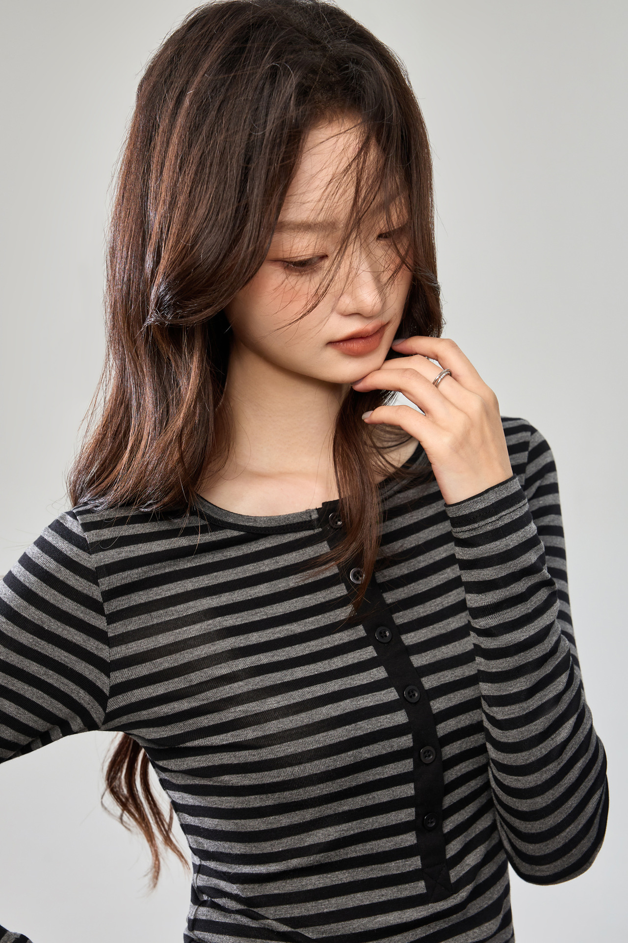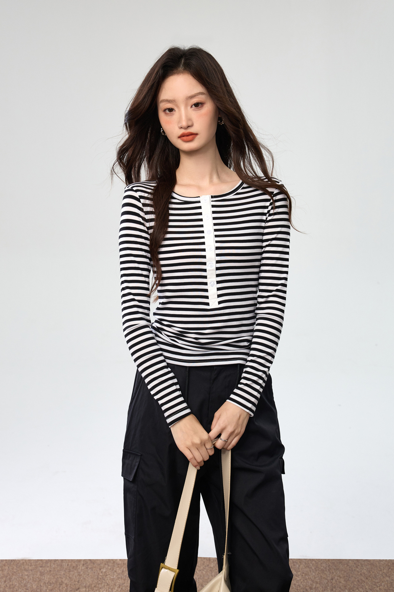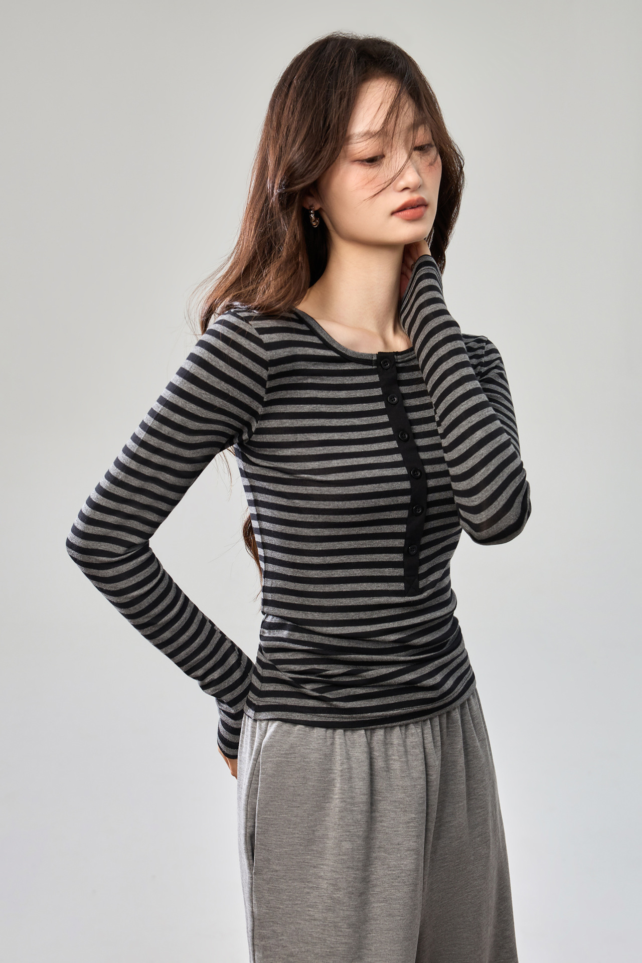 #Tencel Lyocell #Temperament High Sense Black and White Striped Long Sleeve T-Shirt Women's Autumn New Crew Neck Button Top