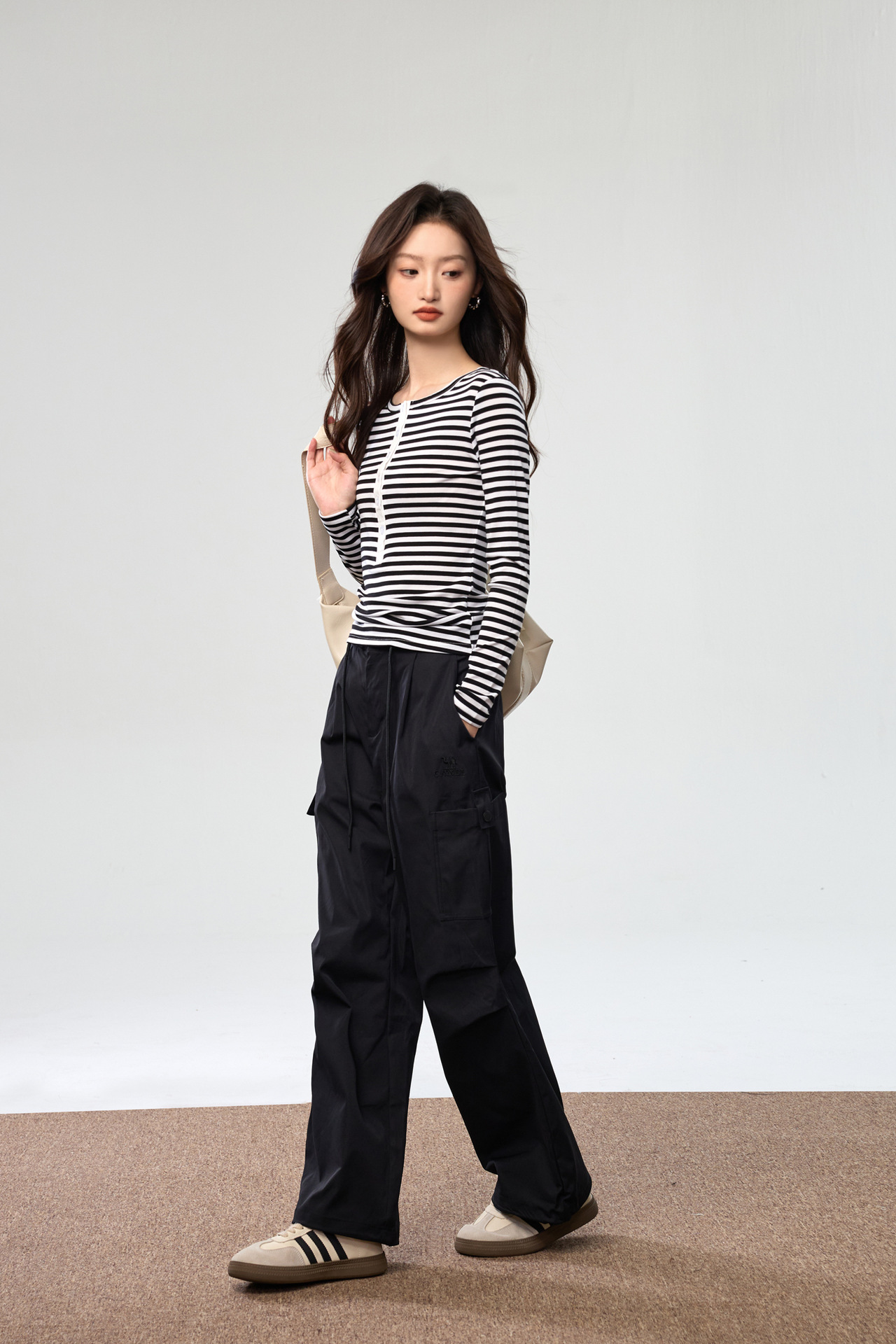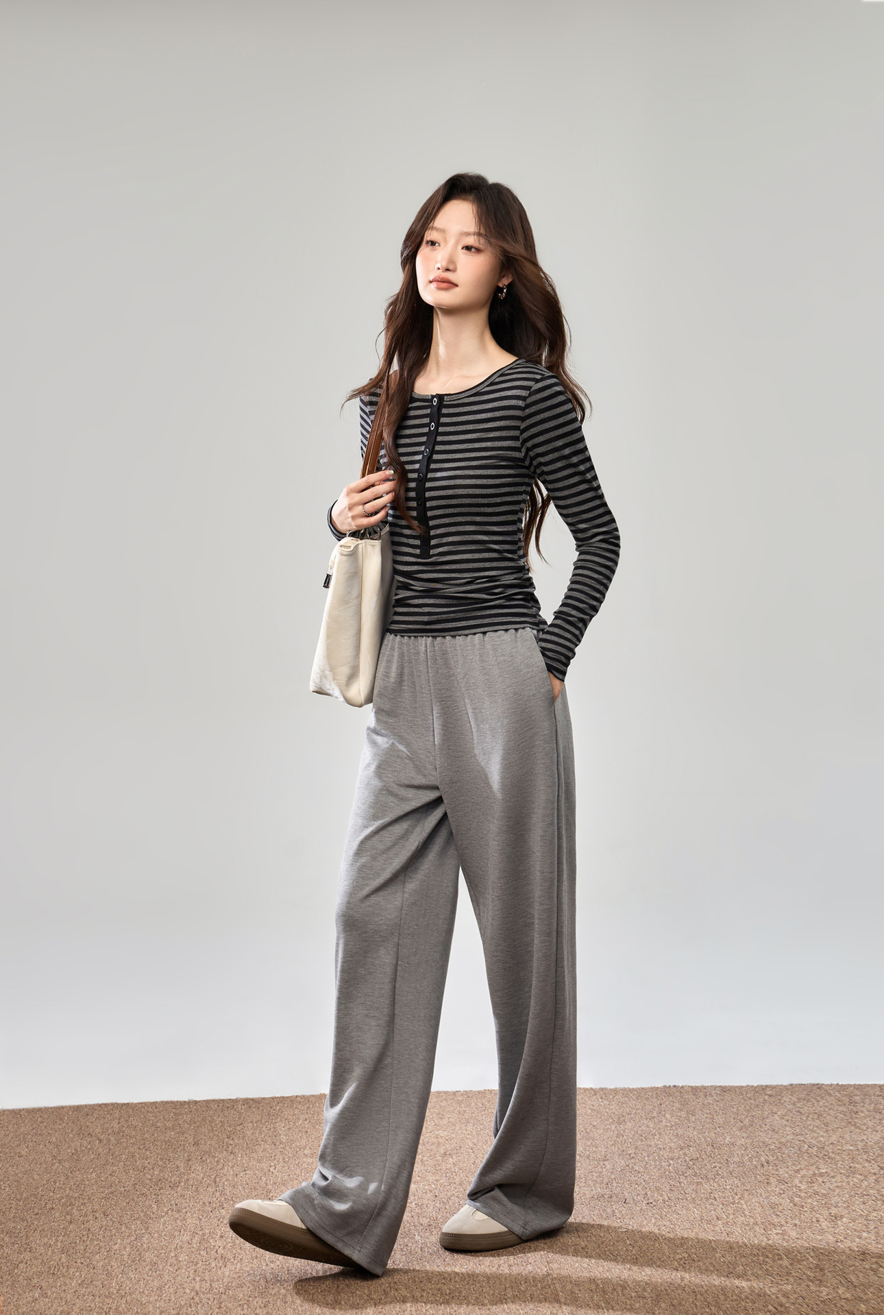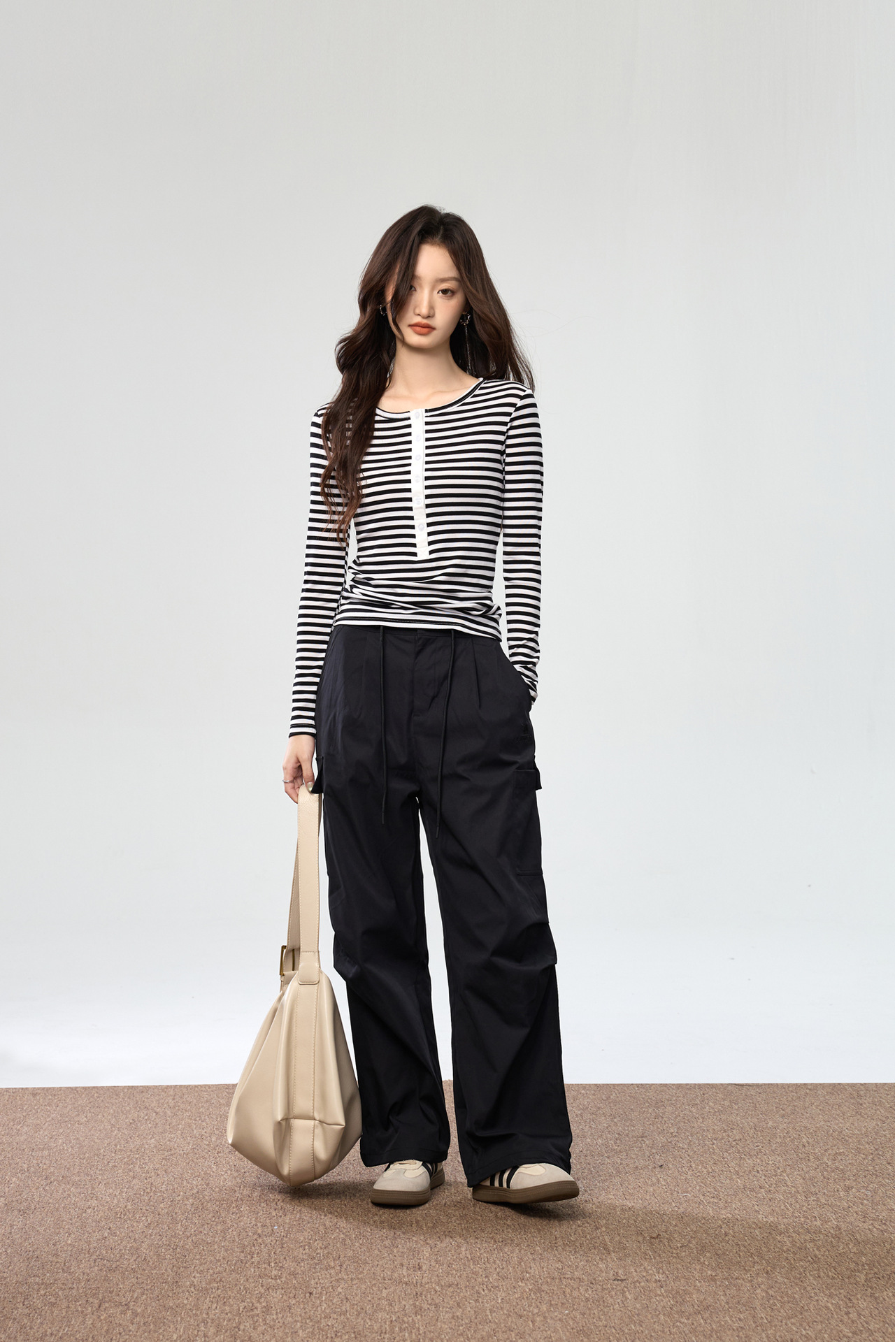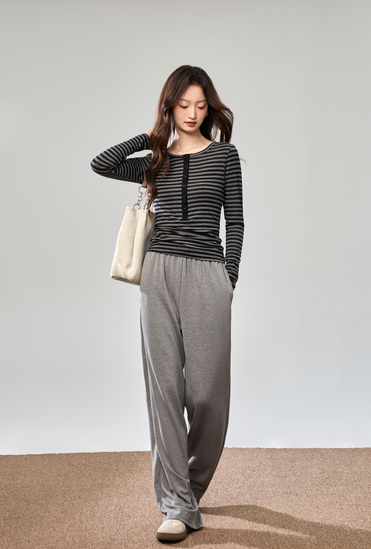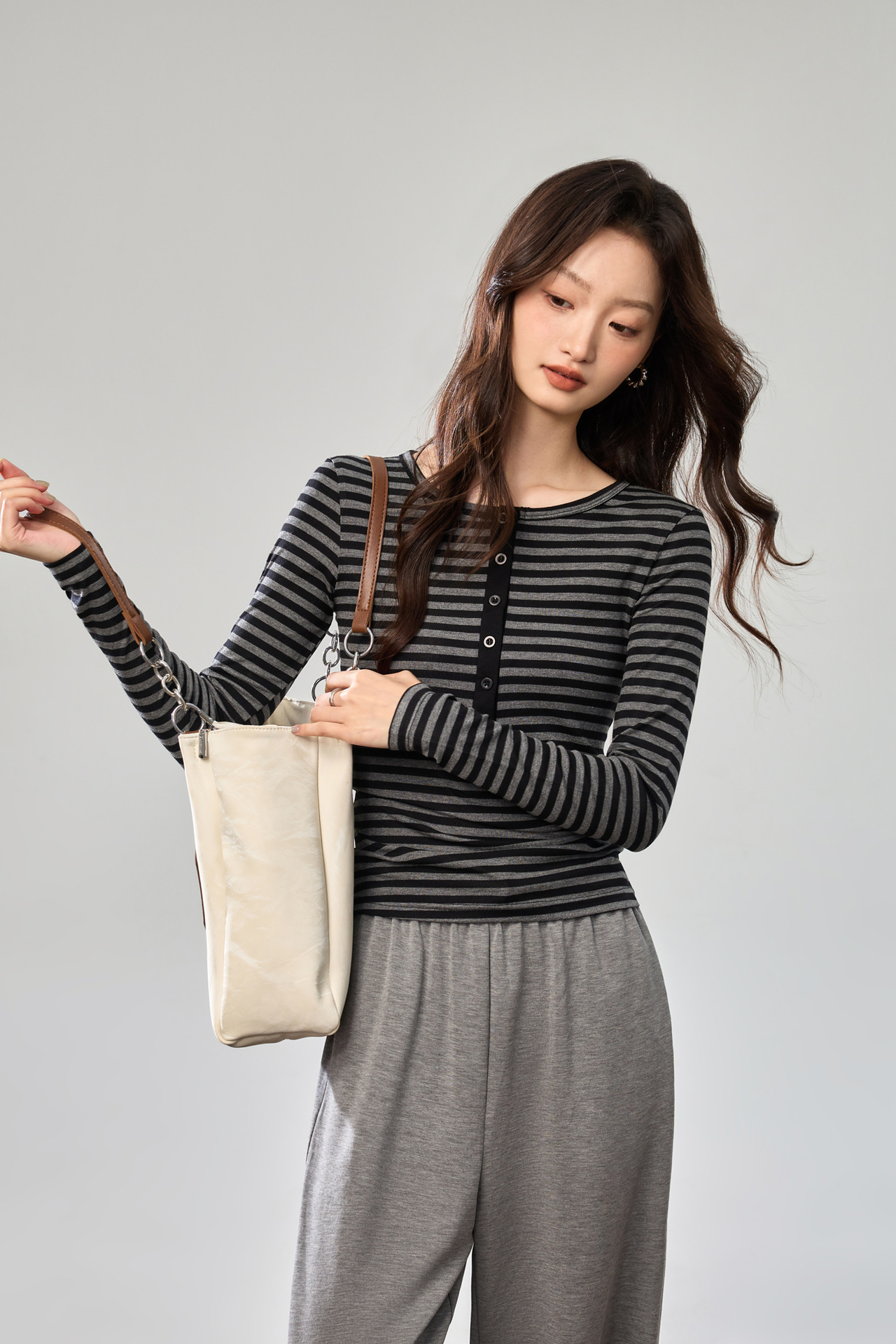 #Tencel Lyocell #Temperament High Sense Black and White Striped Long Sleeve T-Shirt Women's Autumn New Crew Neck Button Top