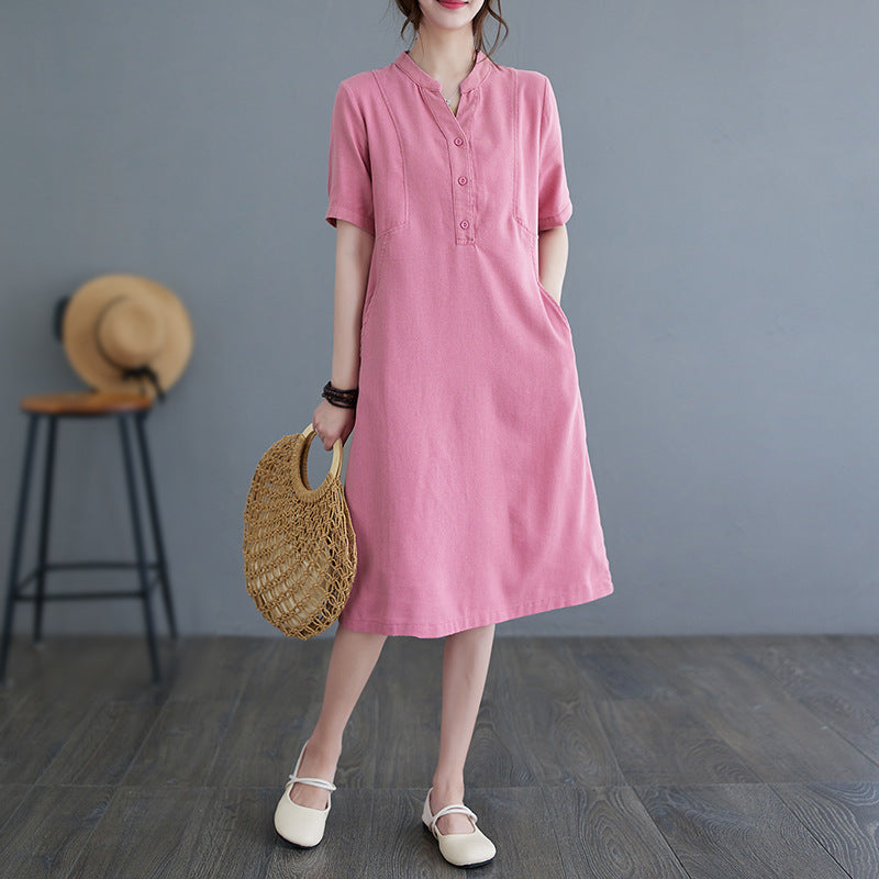 The real shot is in the summer of 2025, the new literary and loose solid color cotton and linen V-neck short-sleeved dress for women's medium and long 1685 #