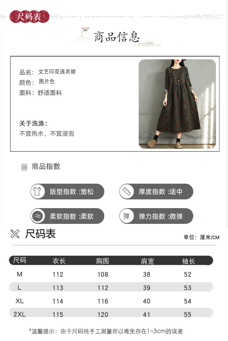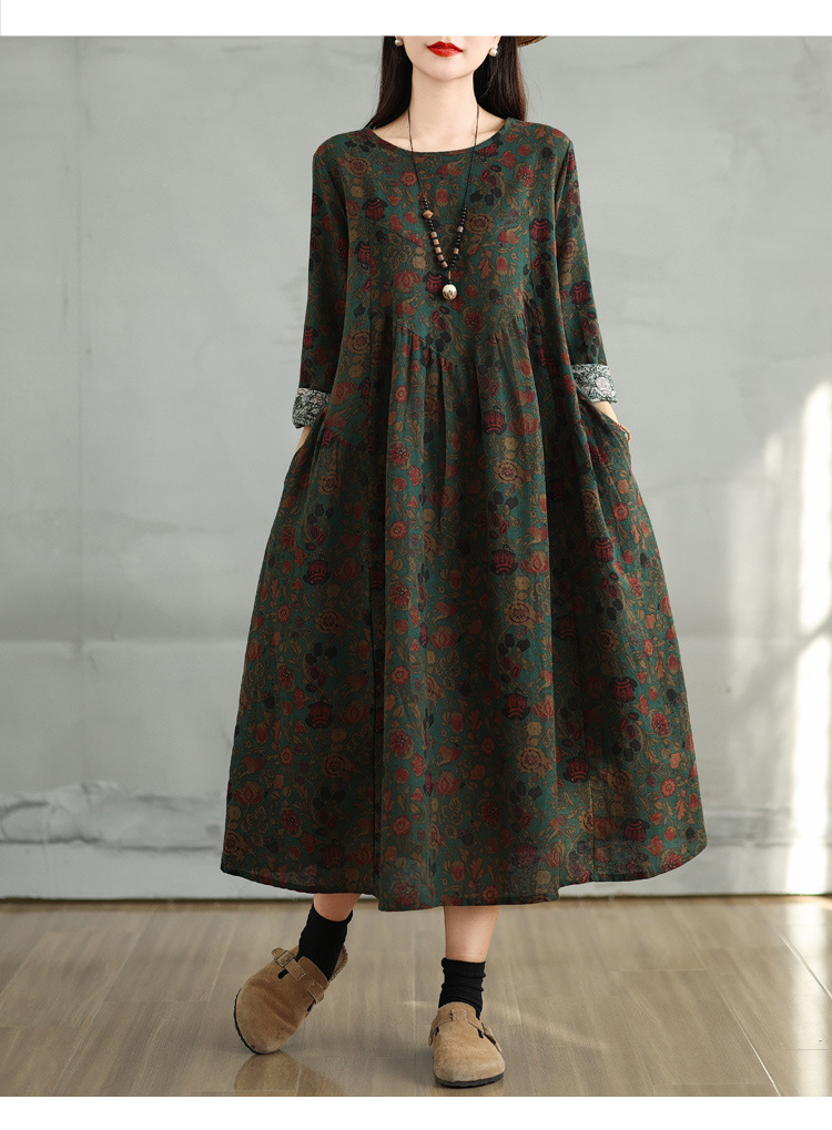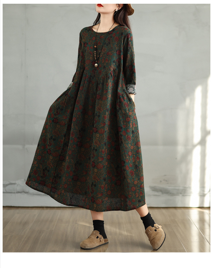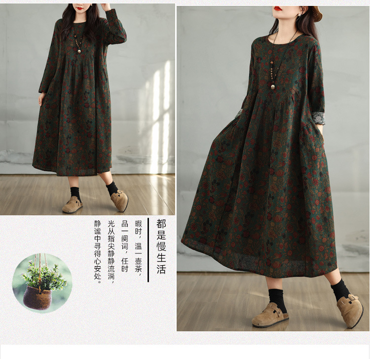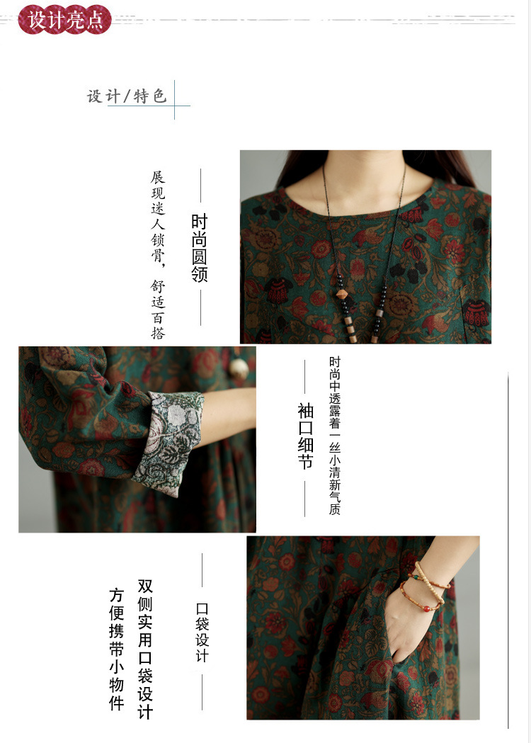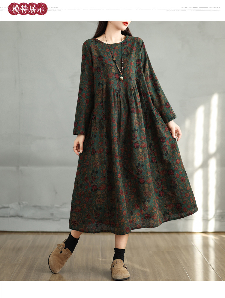 The real shot is the new cotton and linen printed long-sleeved dress in the spring of 2025. Women's loose large-size thin splicing A-shaped skirt