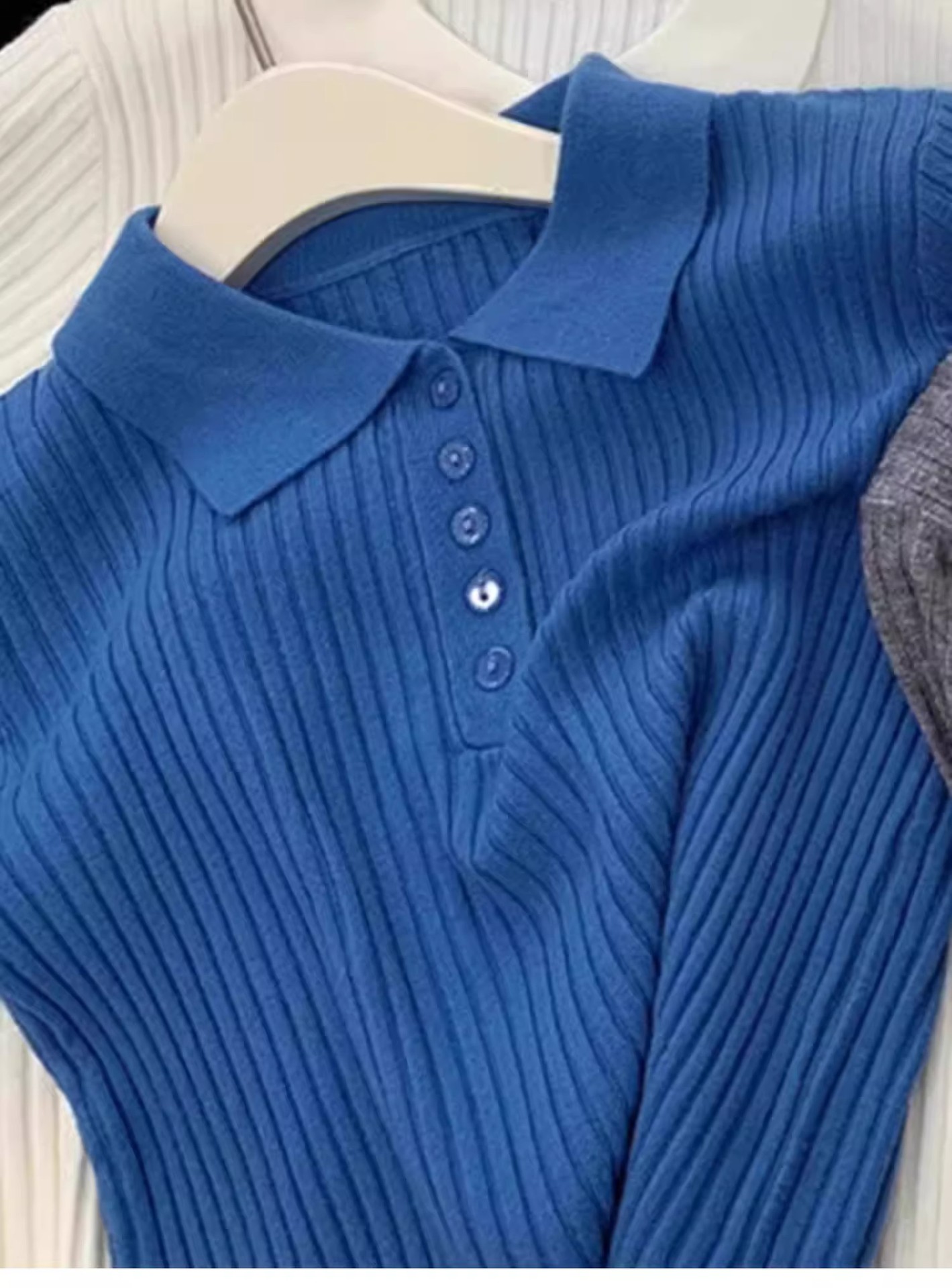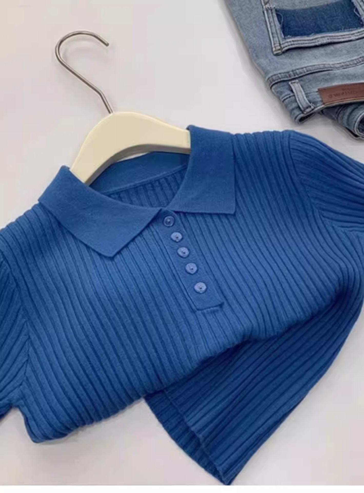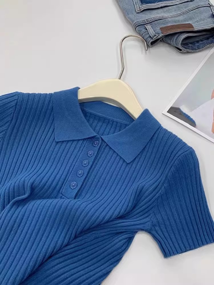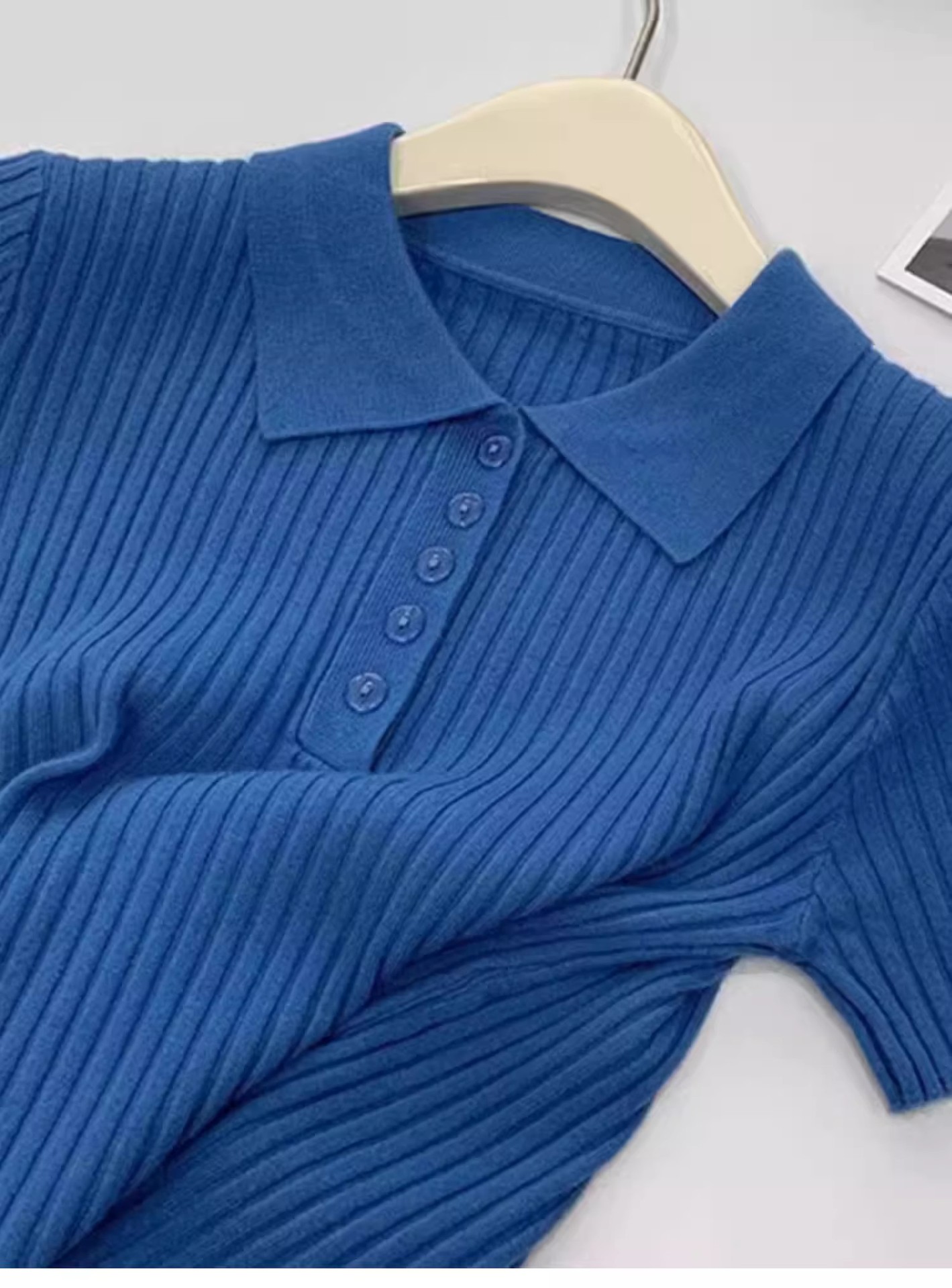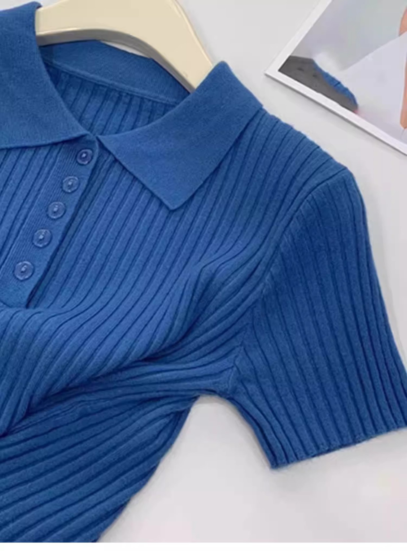 This year's popular polo collar blue knitted short-sleeved T-shirt women's 2025 new slim slim and slim foreign age-reducing top