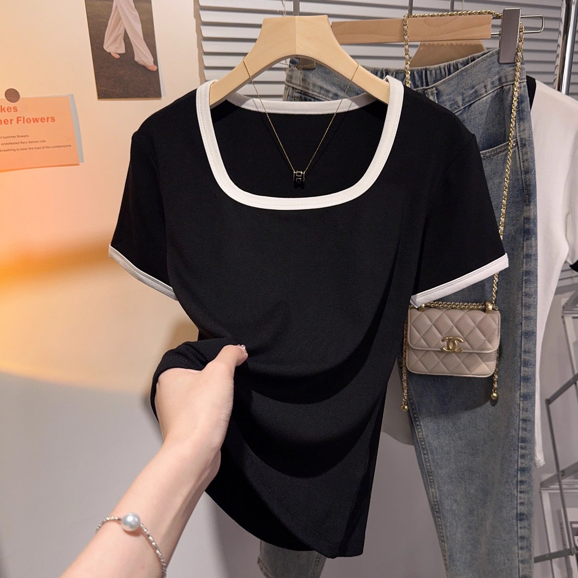 Threaded versatile short-sleeved square-neck contrasting T-shirt women's design sense niche temperament black slim-fitting summer top bottoming shirt