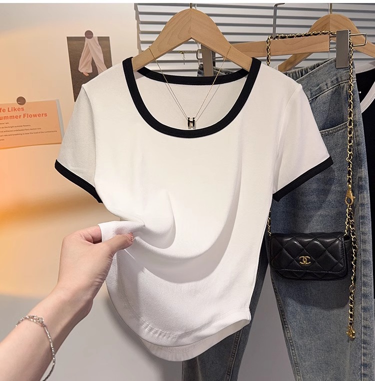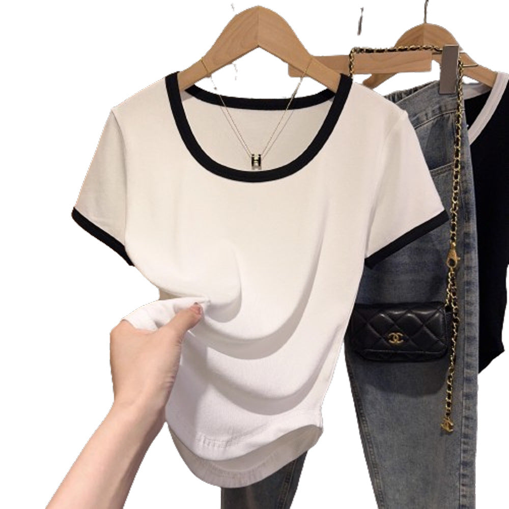 U-neck short-sleeved T-shirt women's 2025 new high-end design contrasting color splicing bottoming shirt slim-fitting versatile white top
