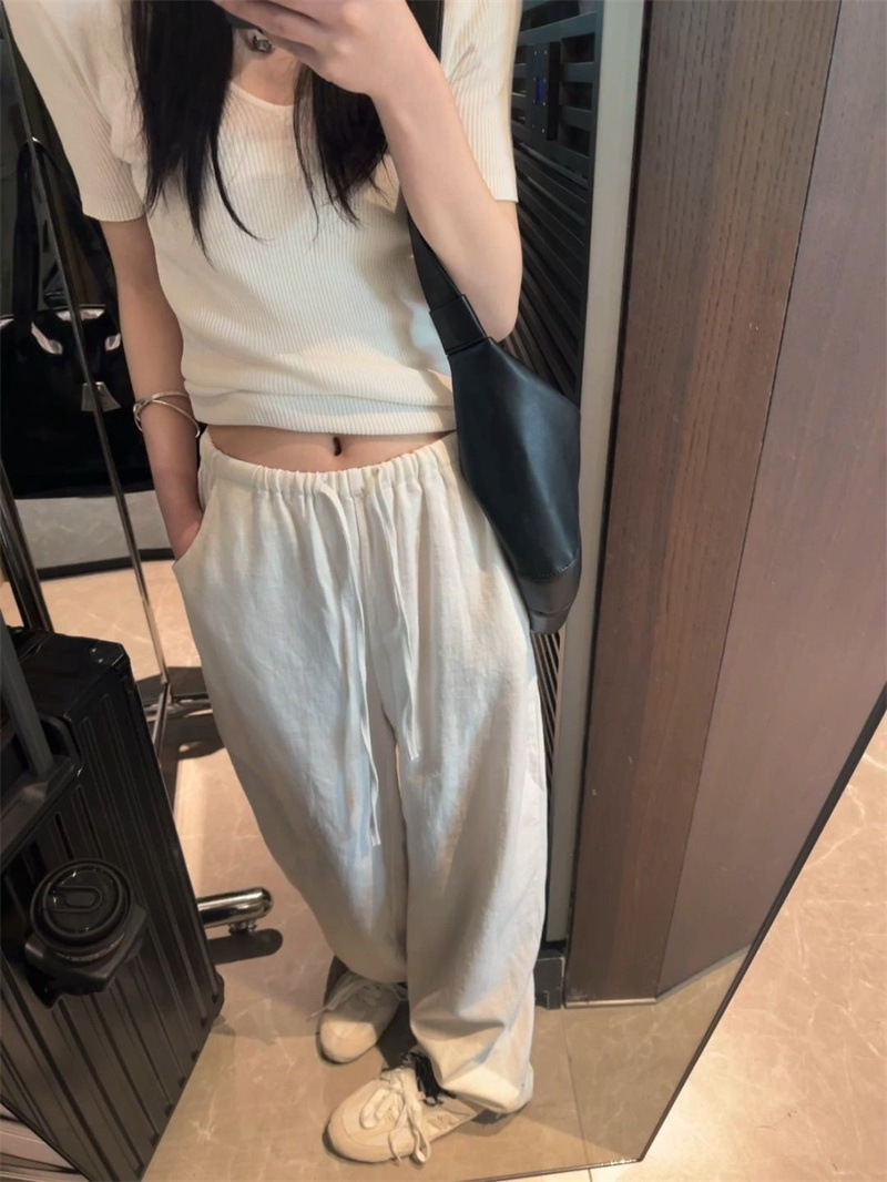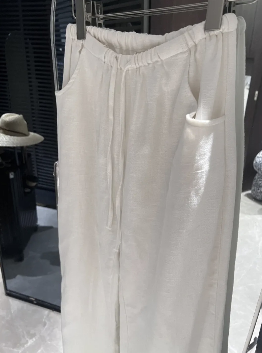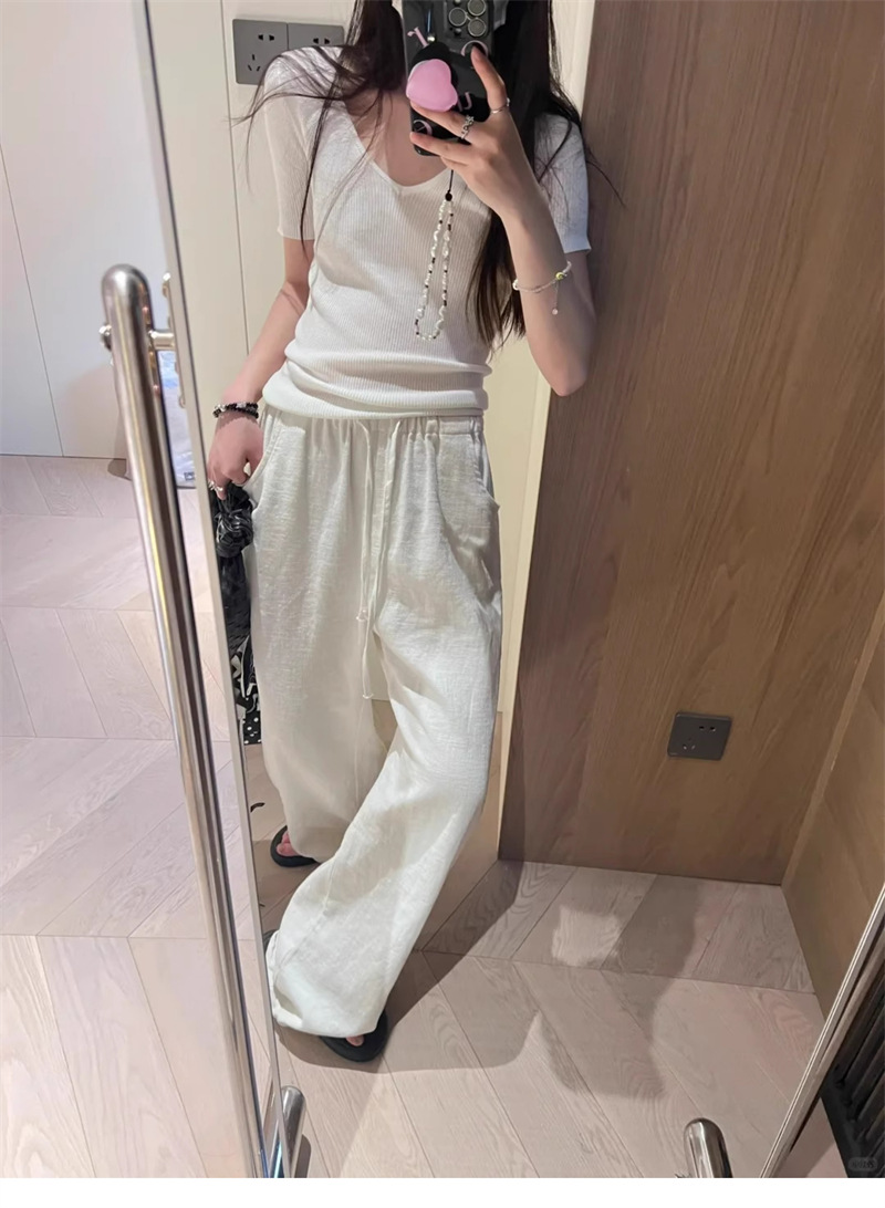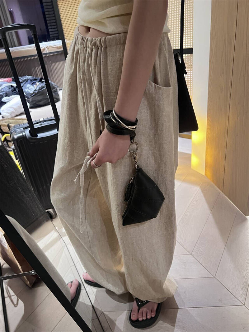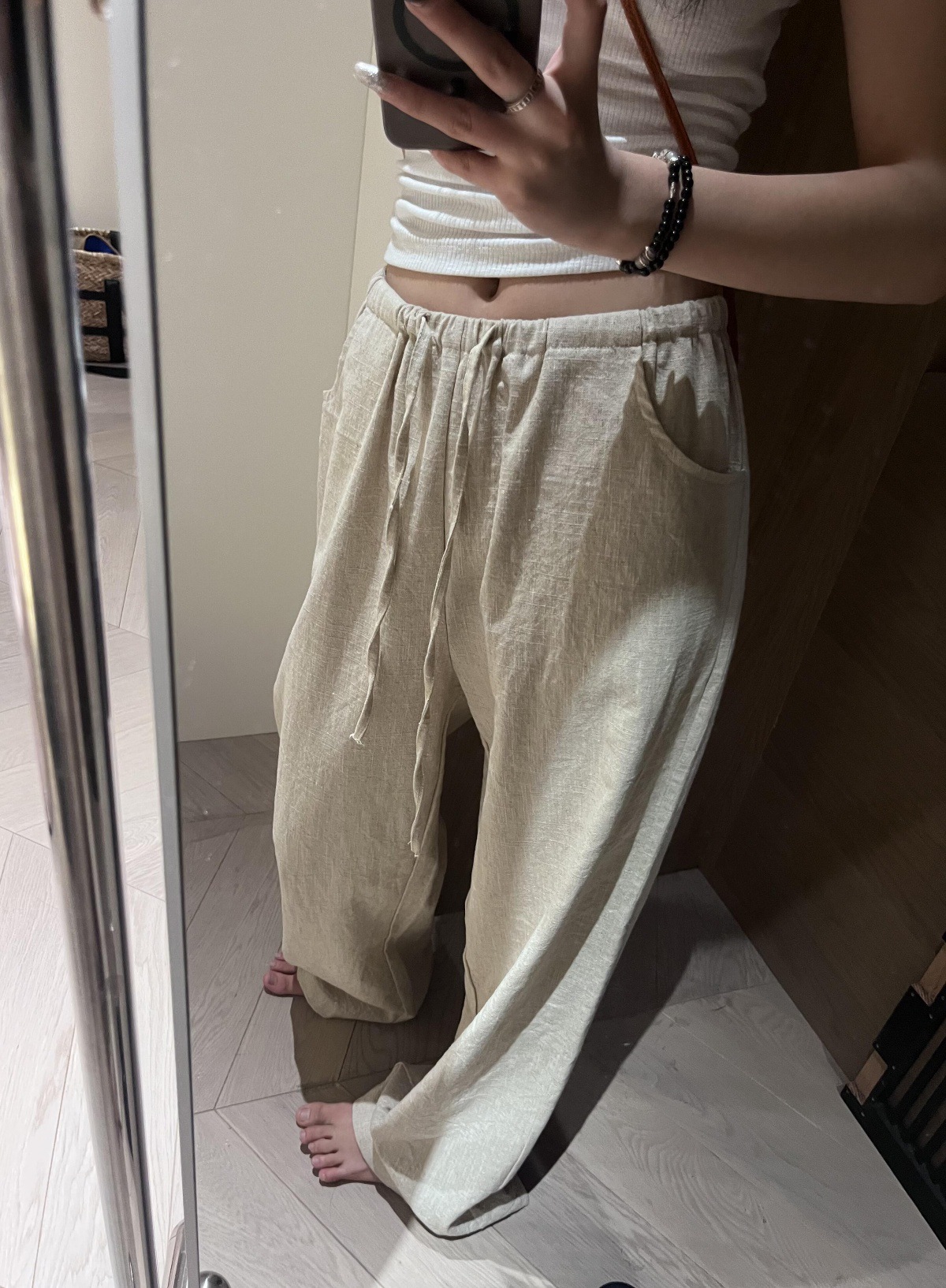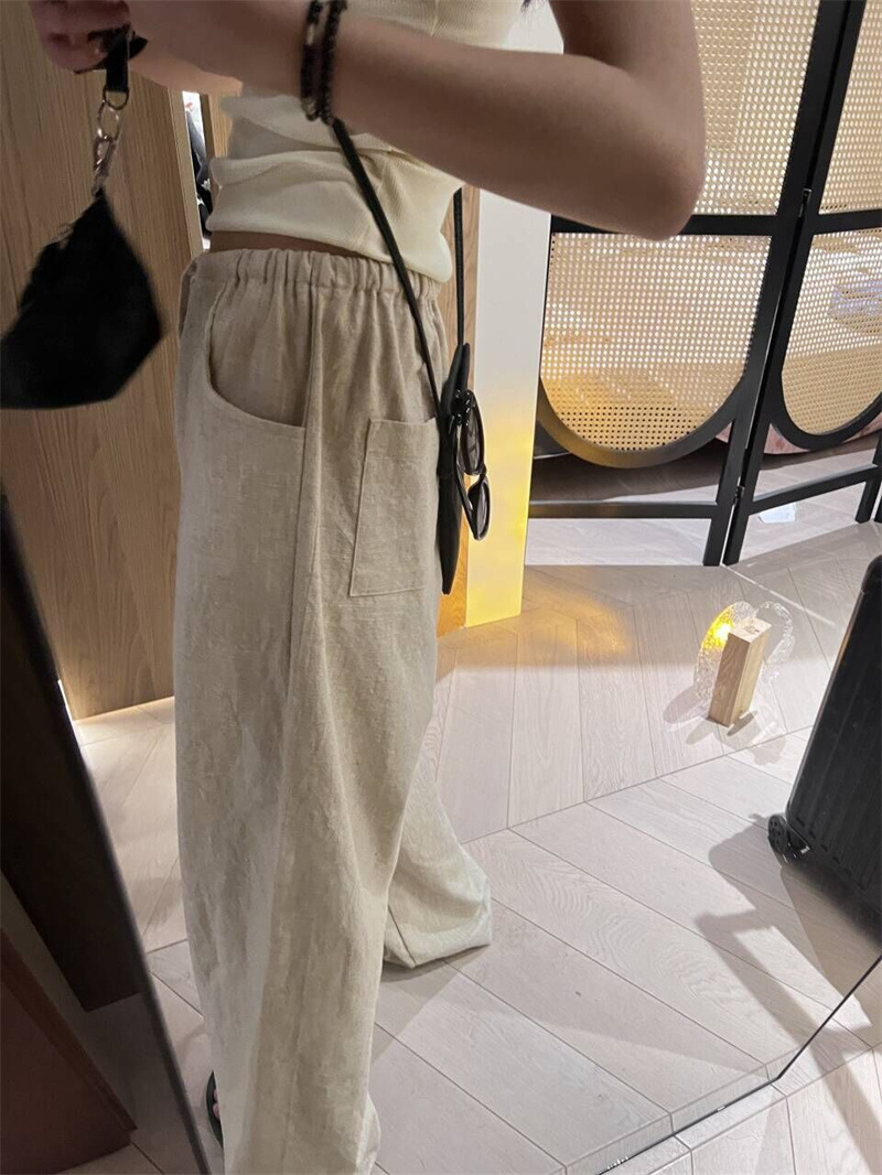 Washed ramie pants 2025 summer elastic waist drawstring casual cotton and linen wide-leg pants women's old money wind thin linen pants