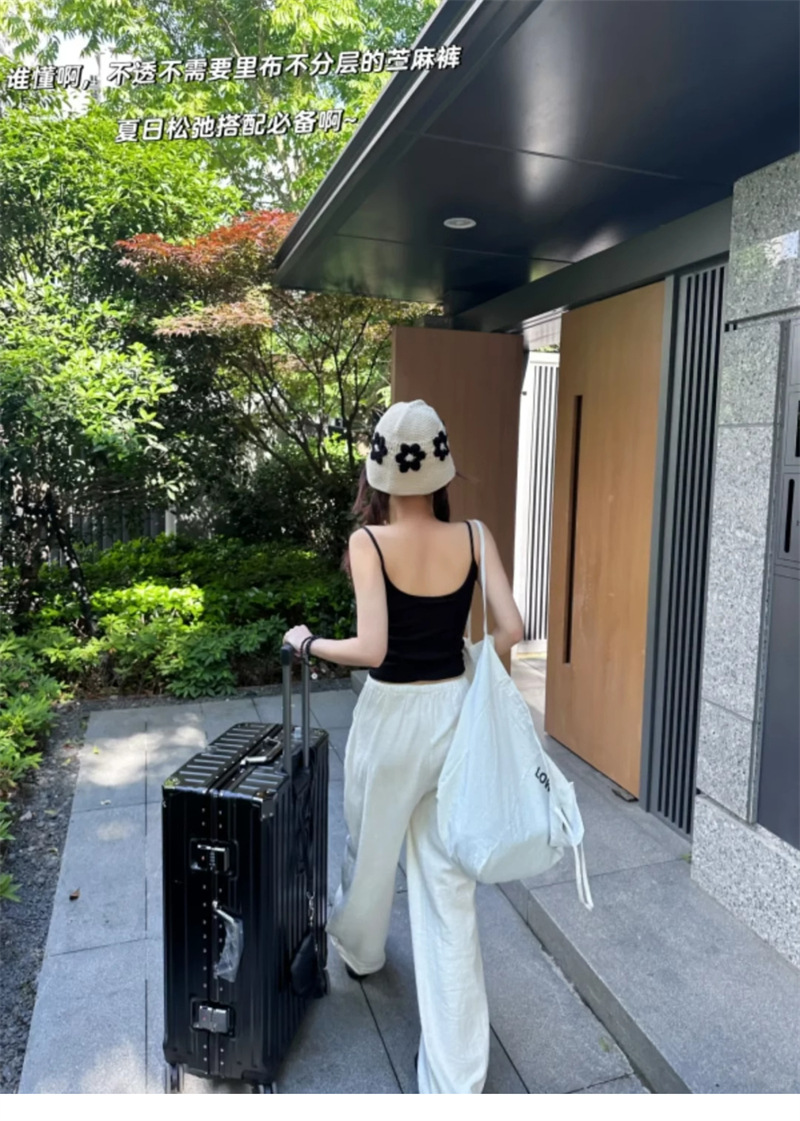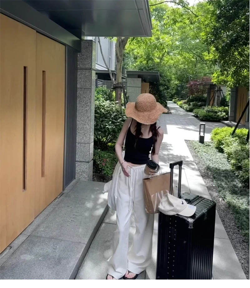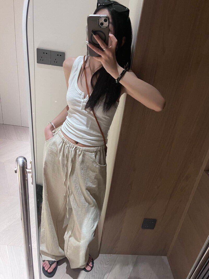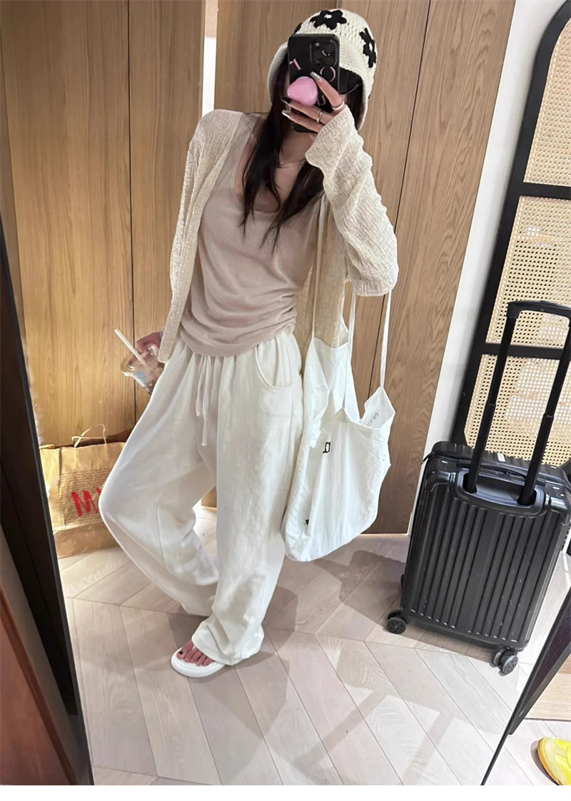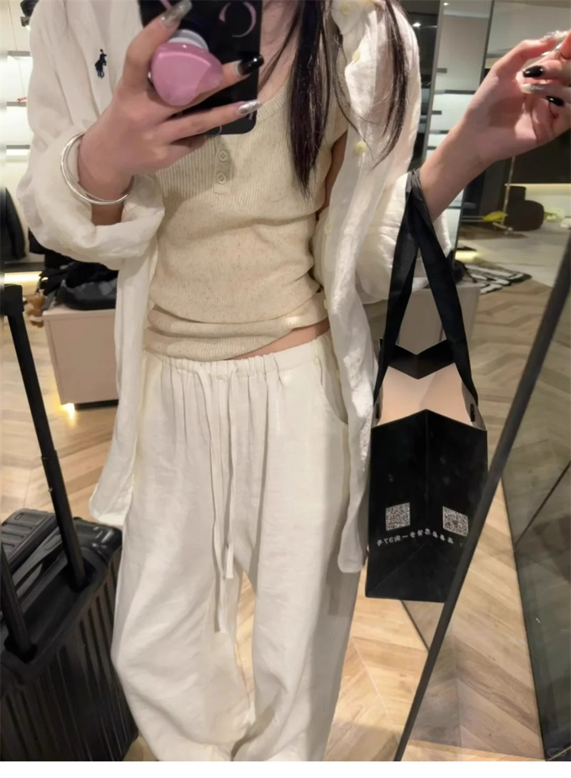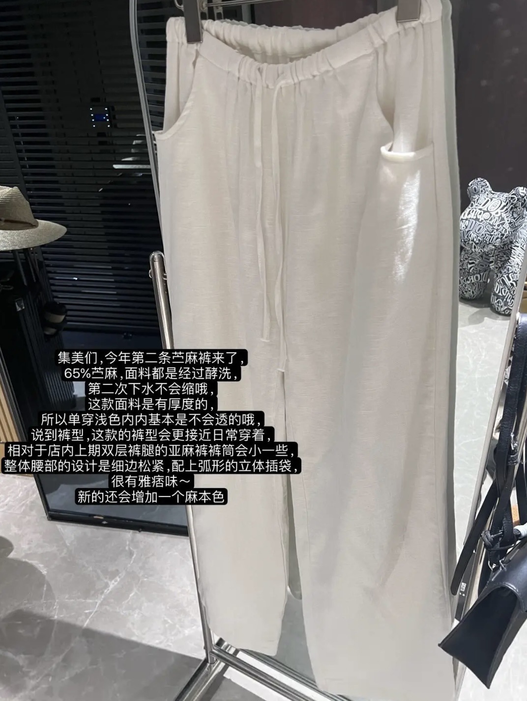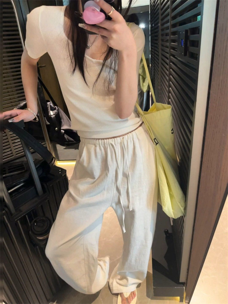 Washed ramie pants 2025 summer elastic waist drawstring casual cotton and linen wide-leg pants women's old money wind thin linen pants