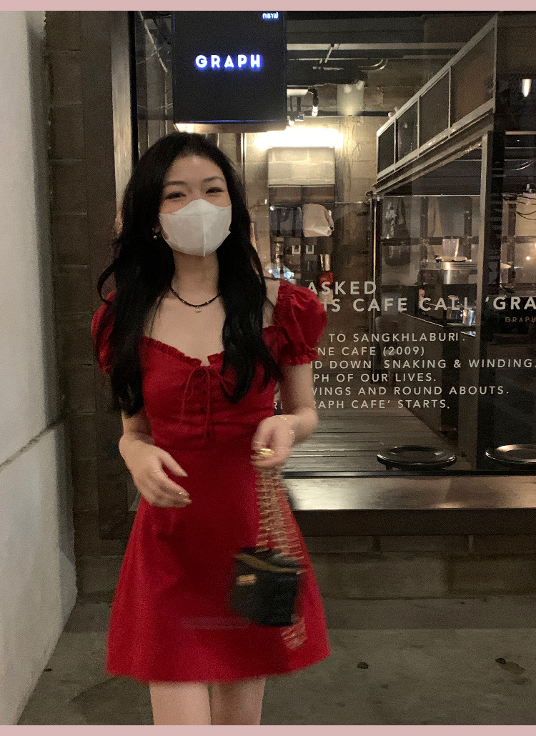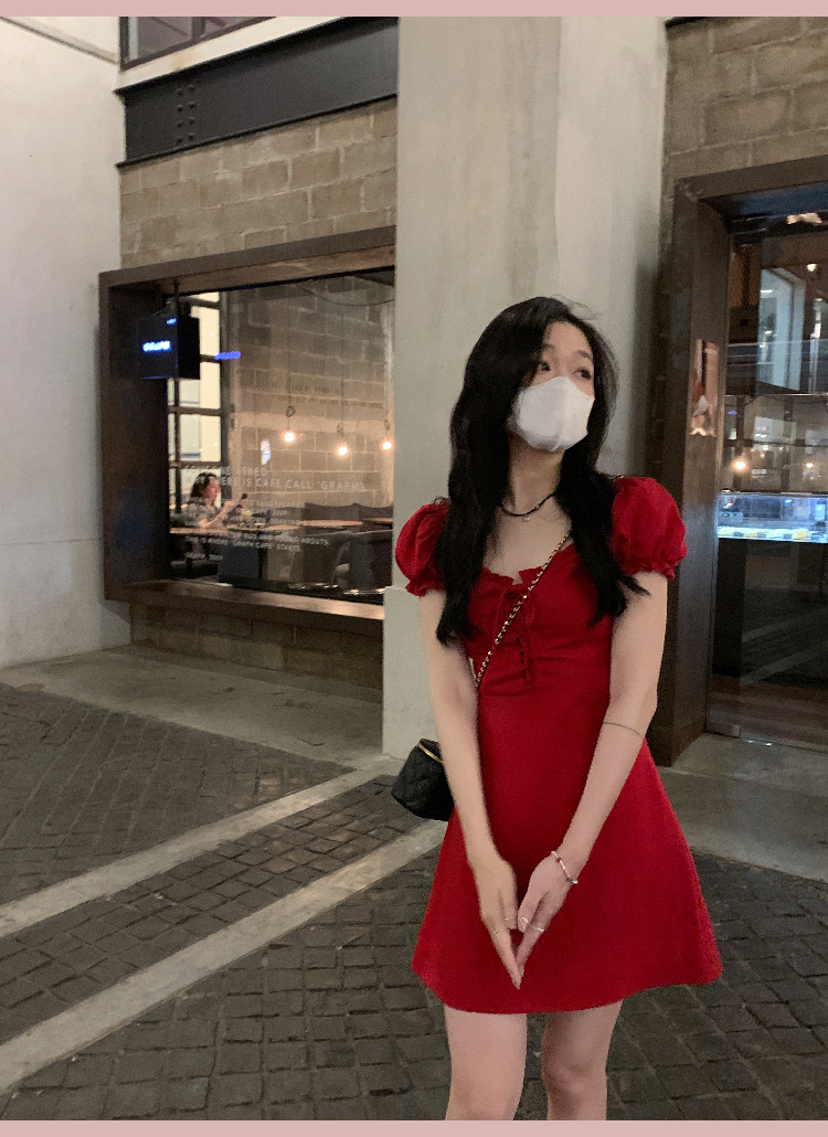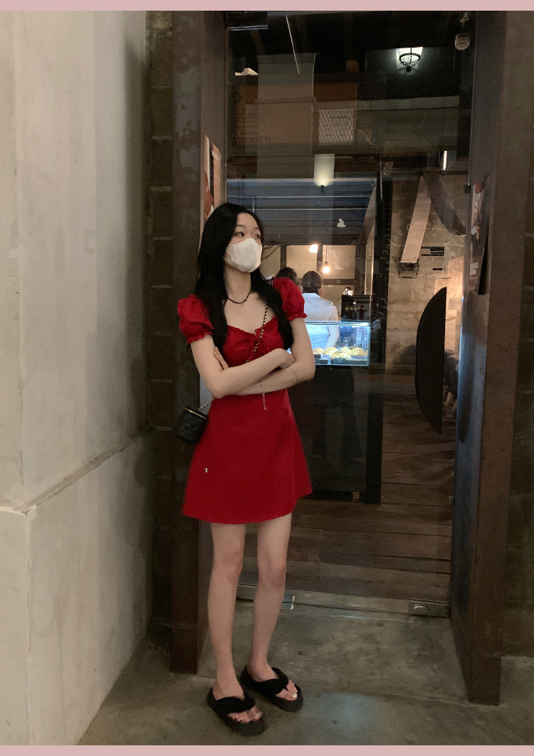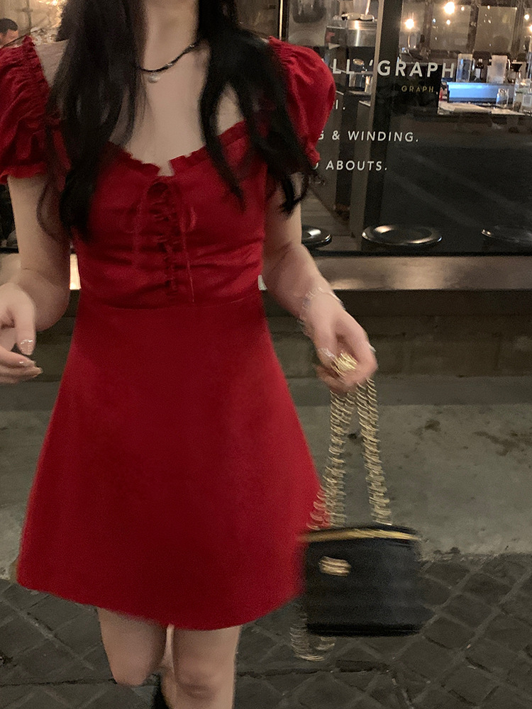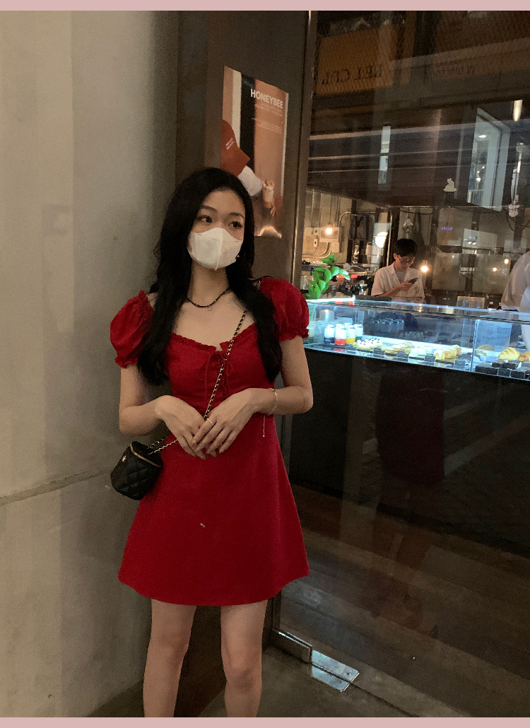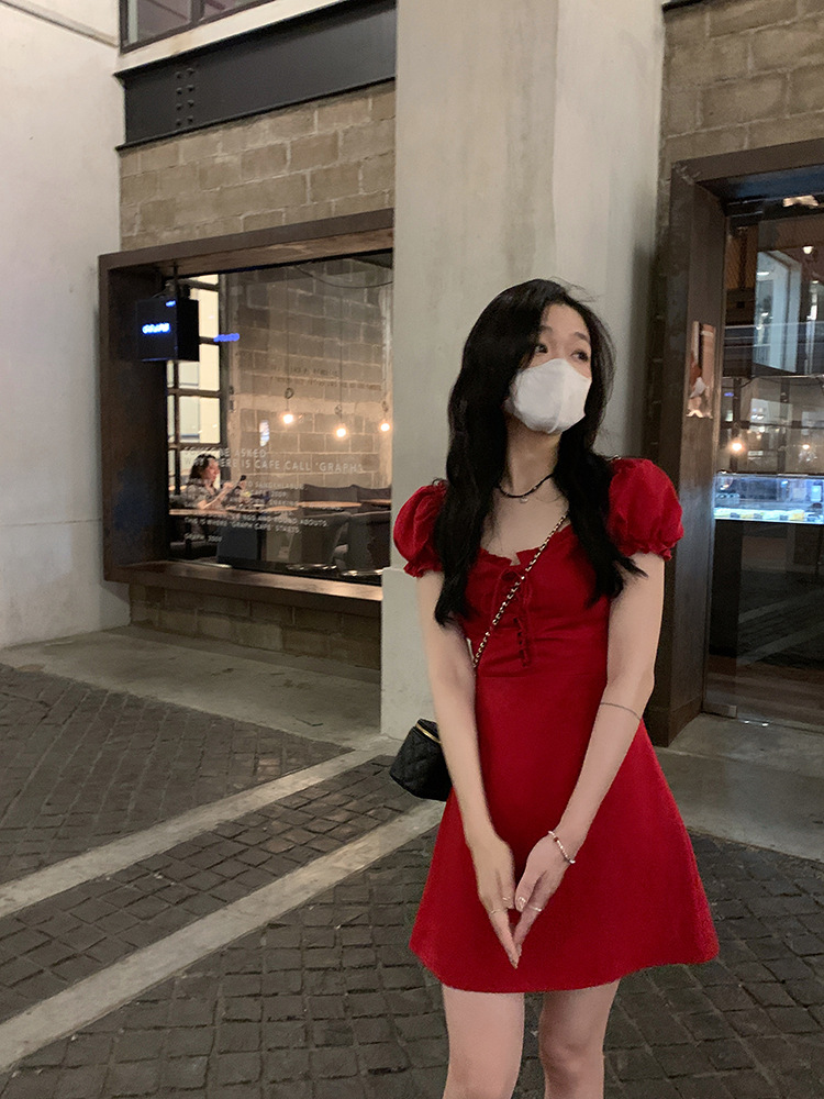 White and red square neck puff sleeve dress women's summer platycodon French design sense waist slimming A-line skirt