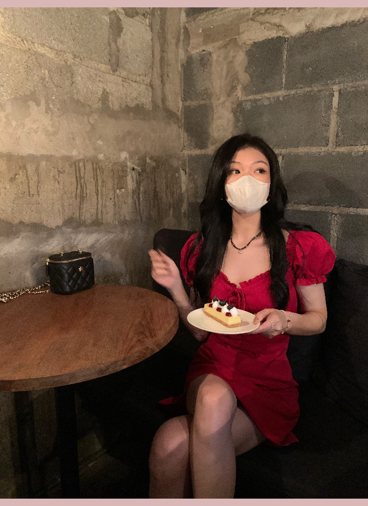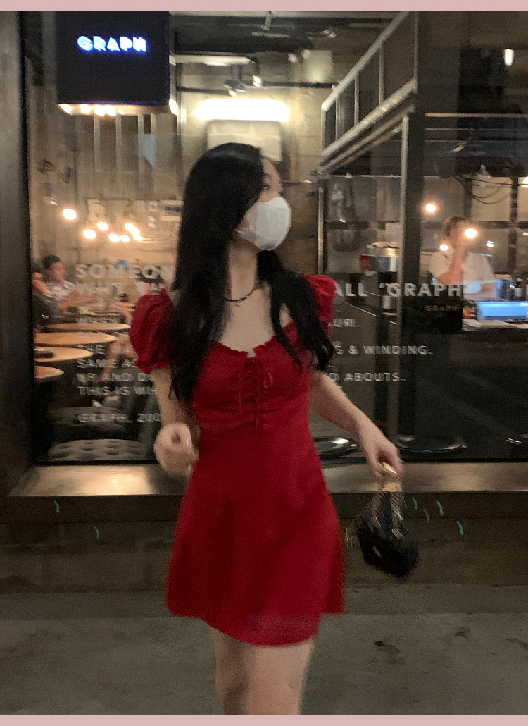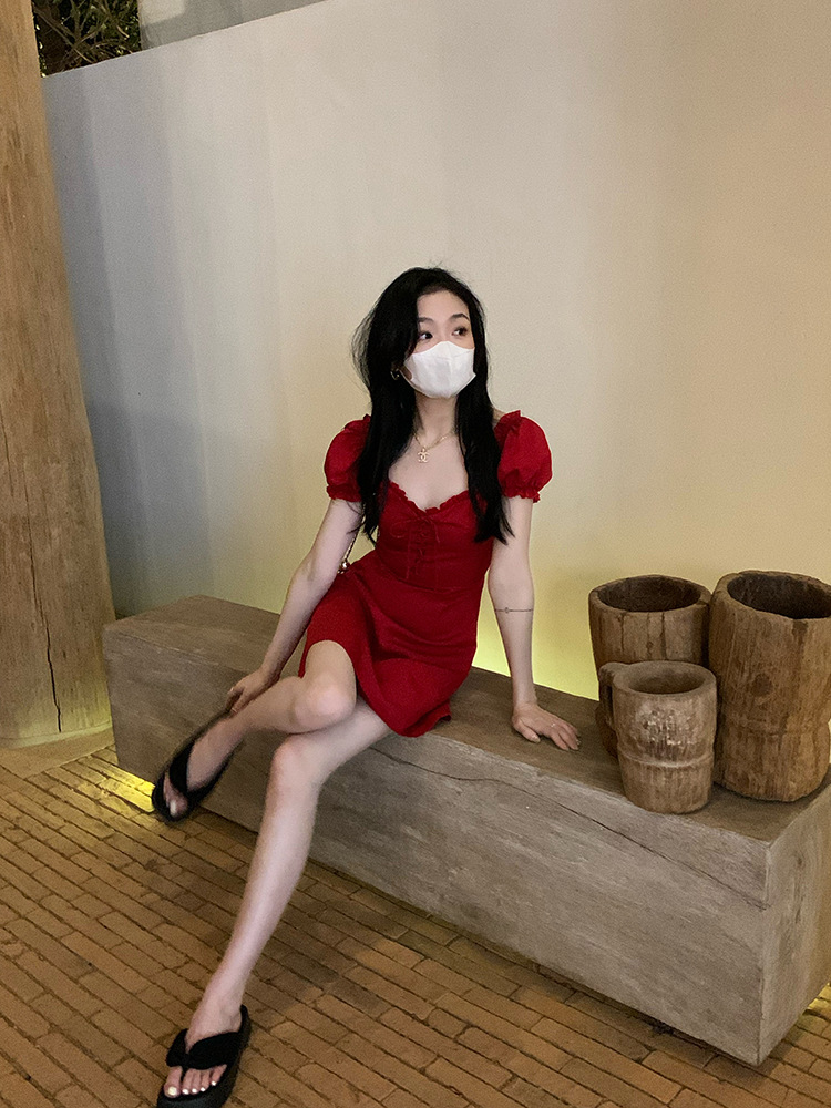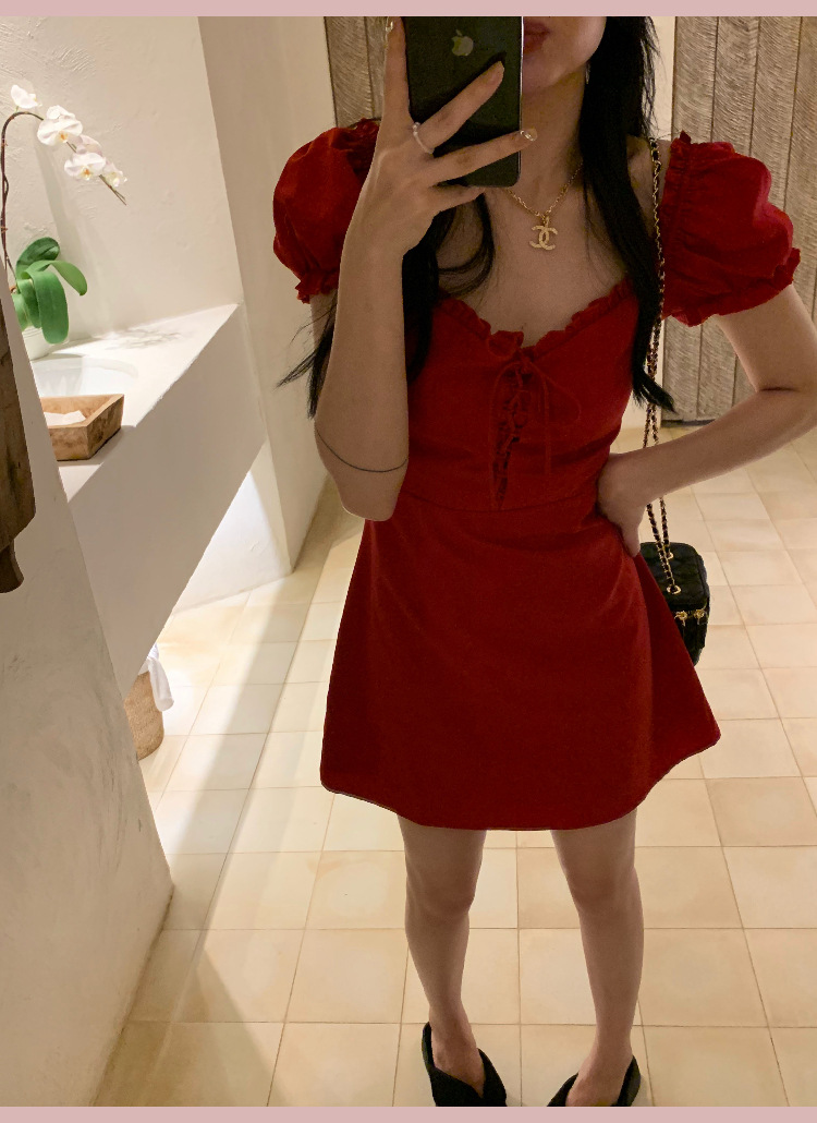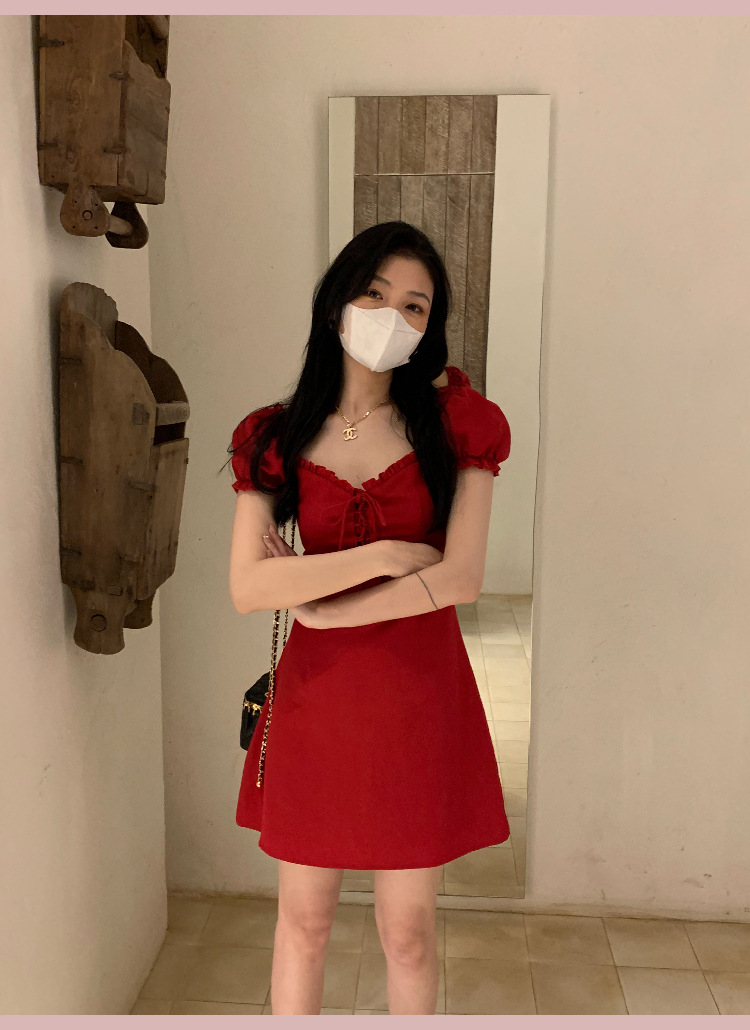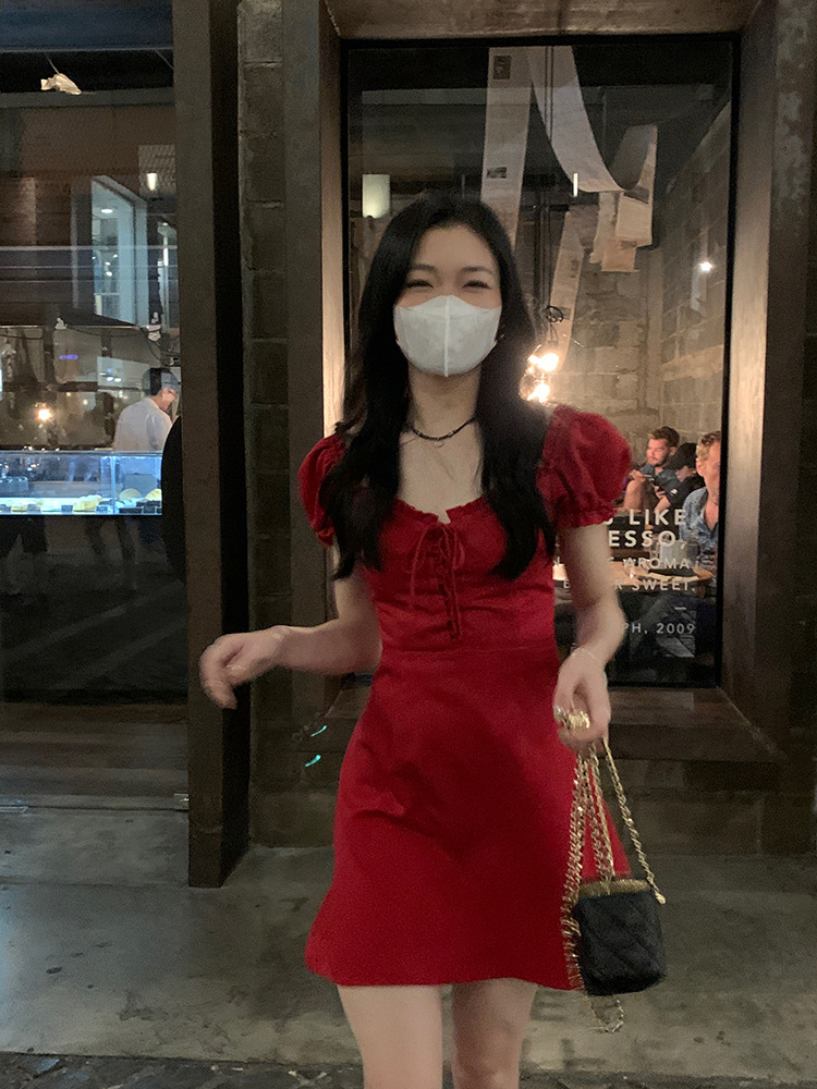 White and red square neck puff sleeve dress women's summer platycodon French design sense waist slimming A-line skirt