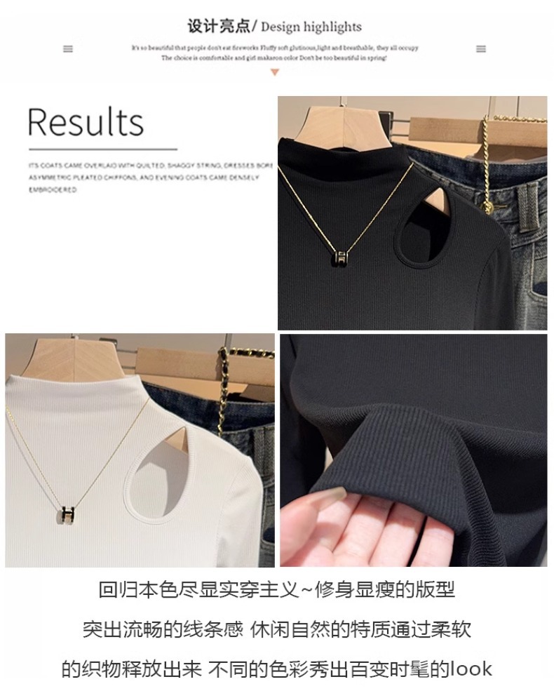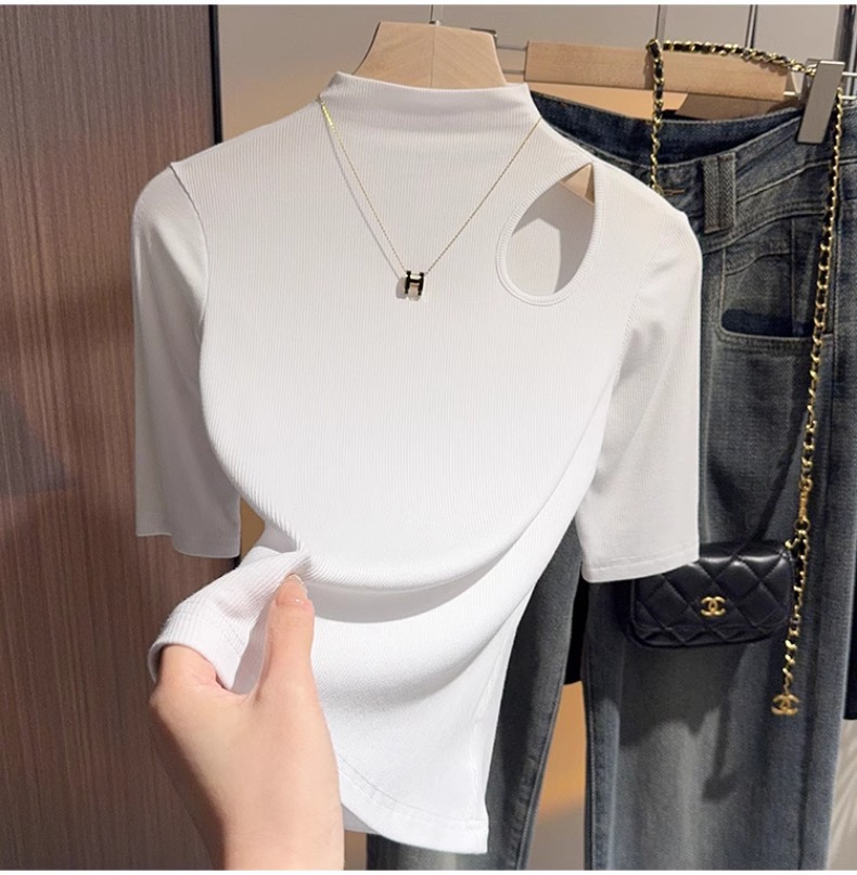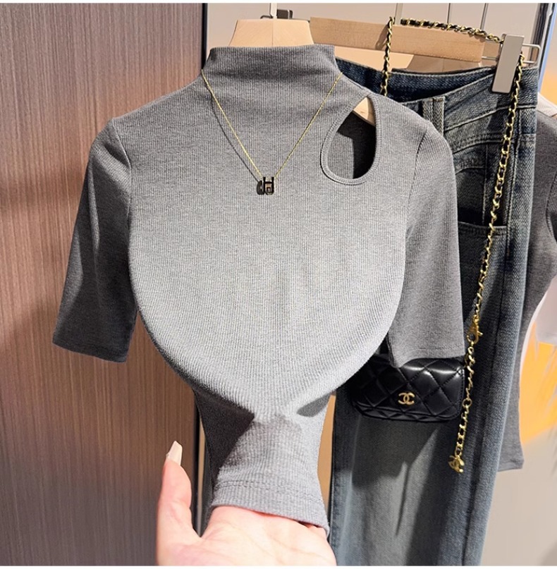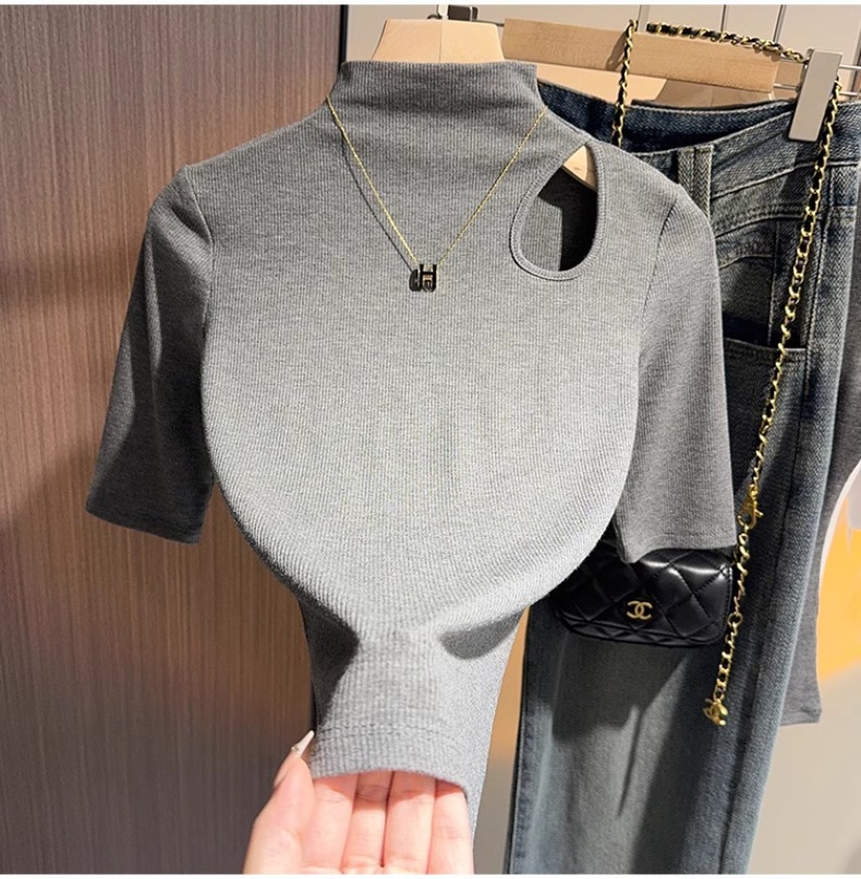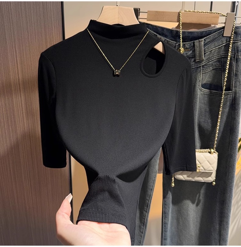 White hollow semi-turtleneck five-quarter-sleeved t-shirt bottoming shirt women's spring and autumn foreign style inner design middle-sleeved top
