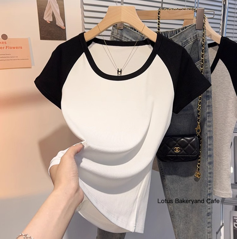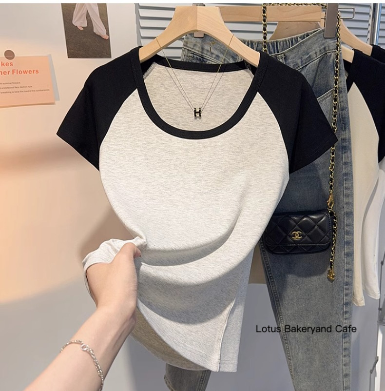White low-neck slim short-sleeved T-shirt women's summer 2025 new bottoming shirt u-neck contrasting color versatile top