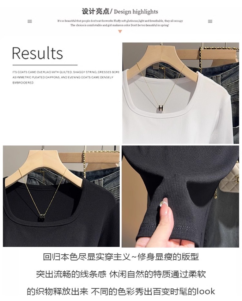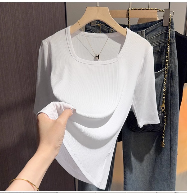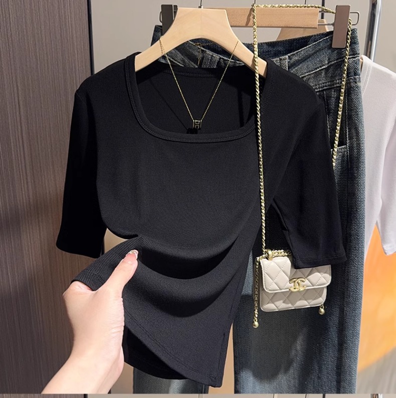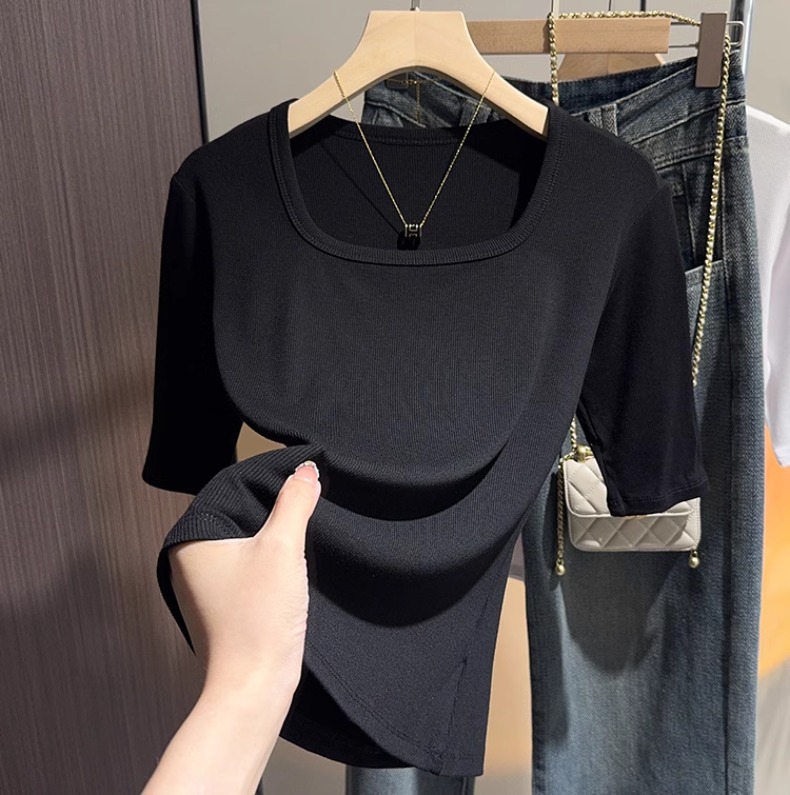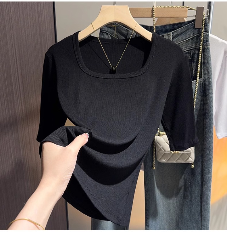 White threaded knitted square neck five-quarter-sleeved t-shirt women's 2025 summer new slim-fit medium-sleeved bottoming versatile top