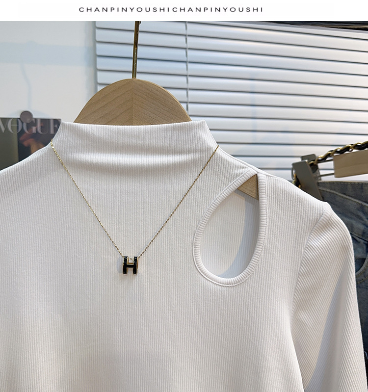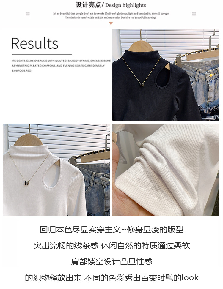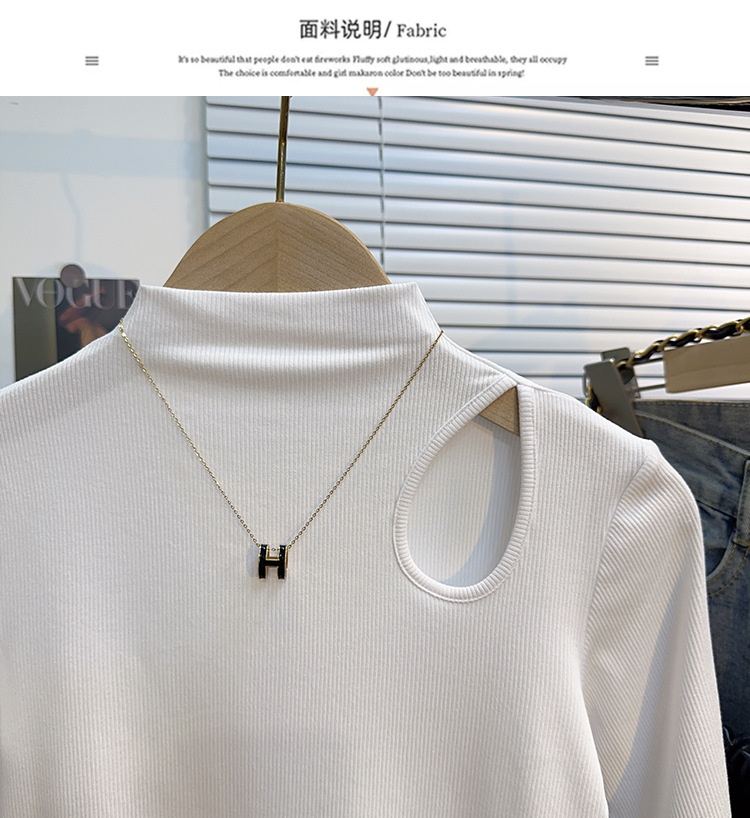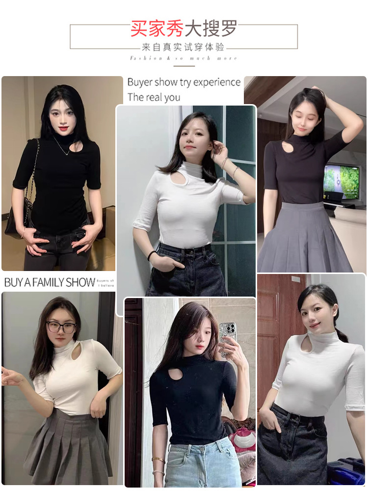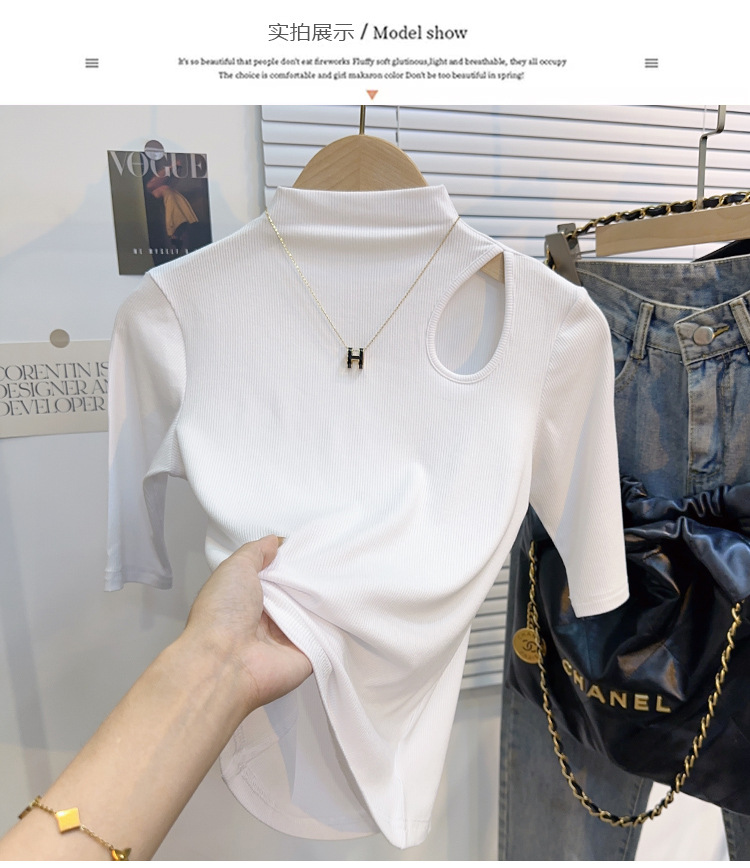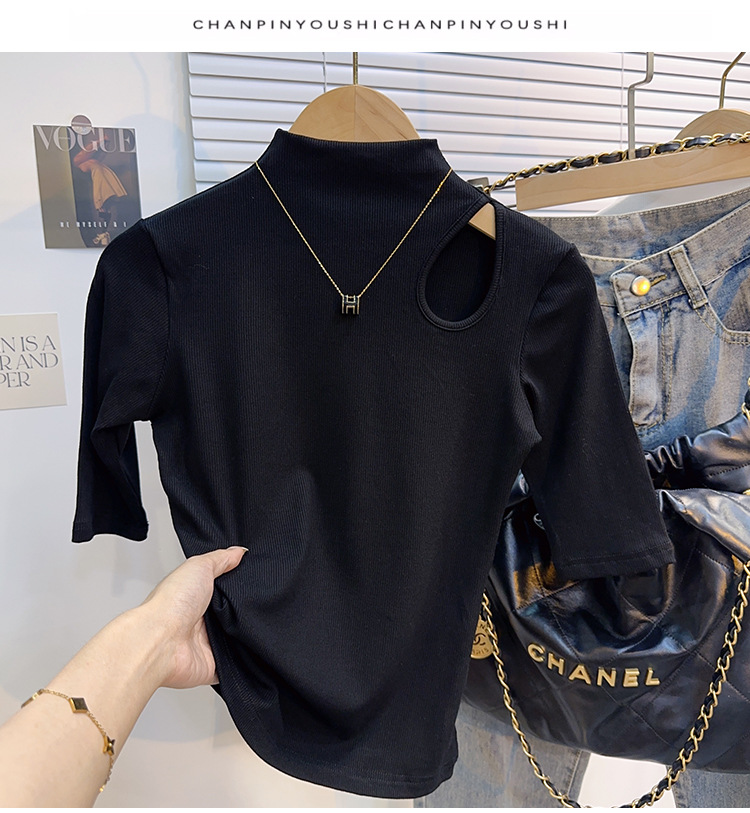 White threaded medium-sleeved t-shirt semi-turtleneck bottoming shirt women's spring, autumn and winter 2025 new five-quarter-sleeved hollow top