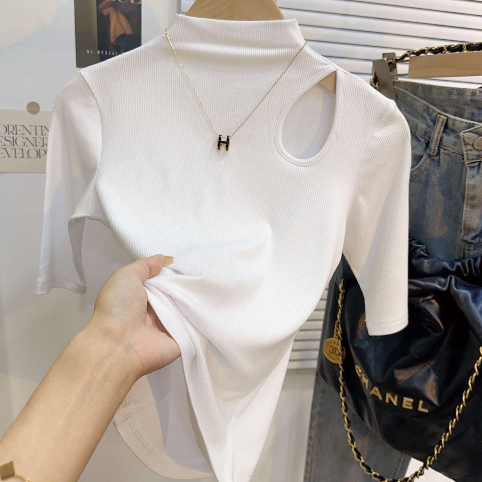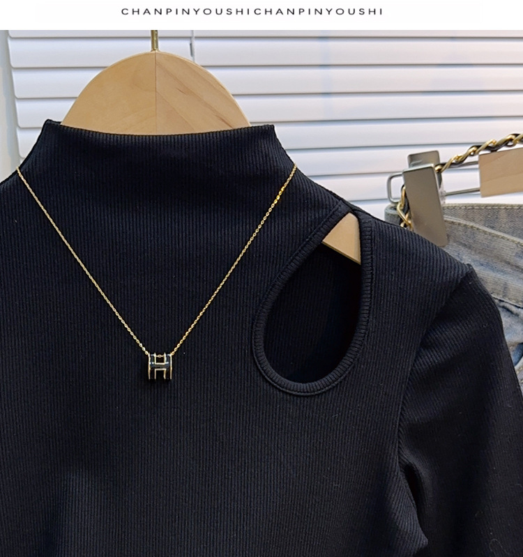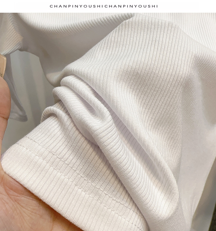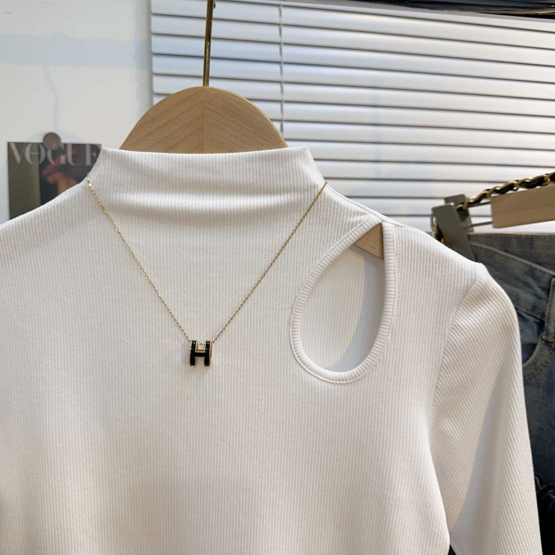 White threaded medium-sleeved t-shirt semi-turtleneck bottoming shirt women's spring, autumn and winter 2025 new five-quarter-sleeved hollow top