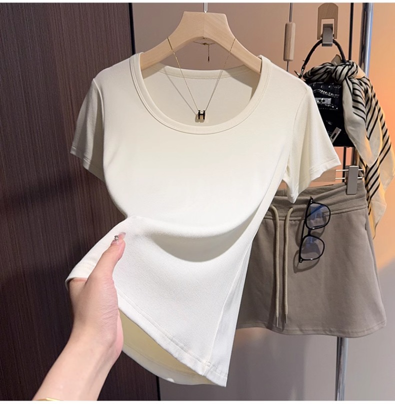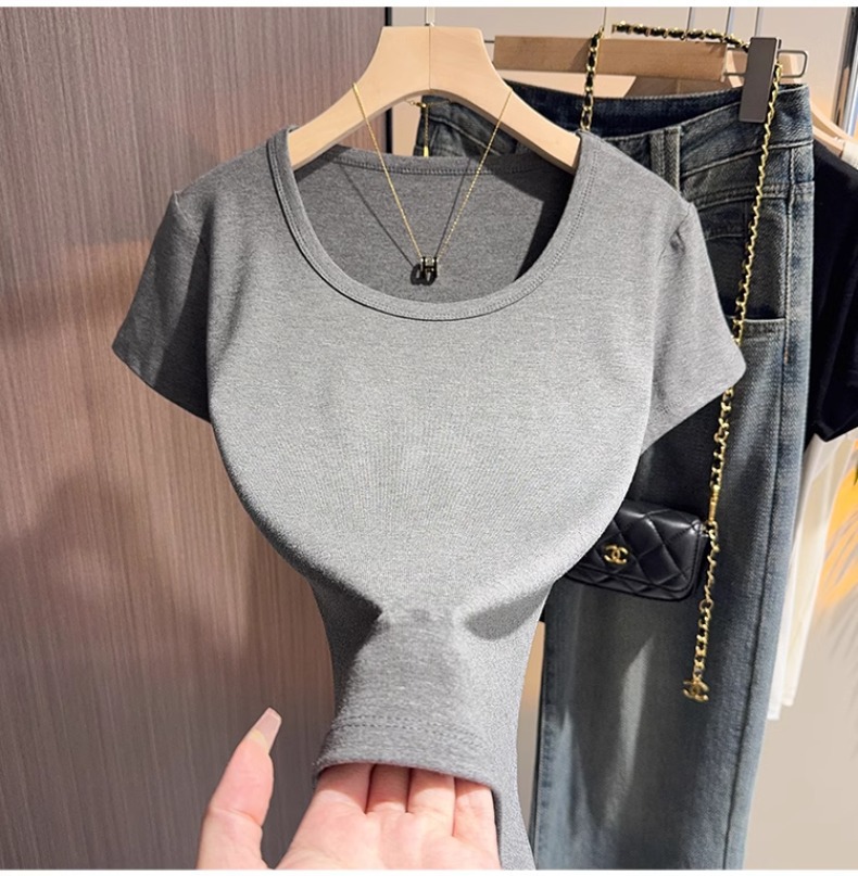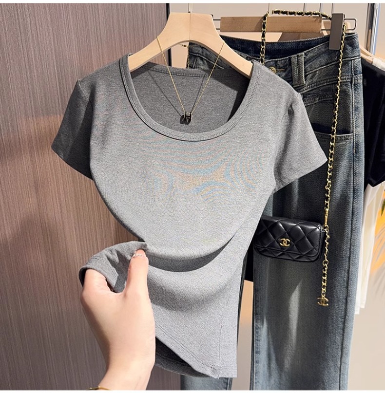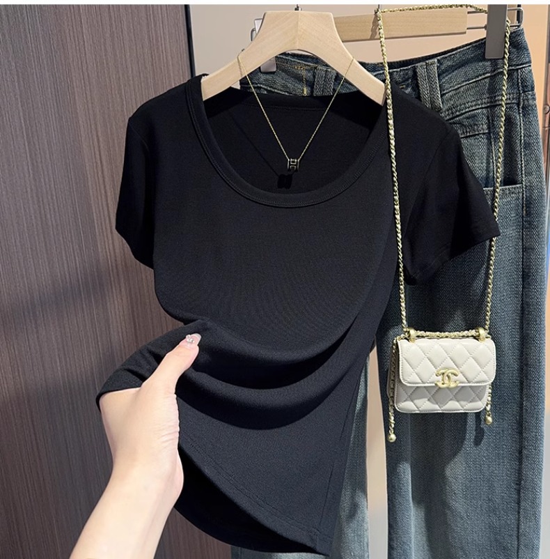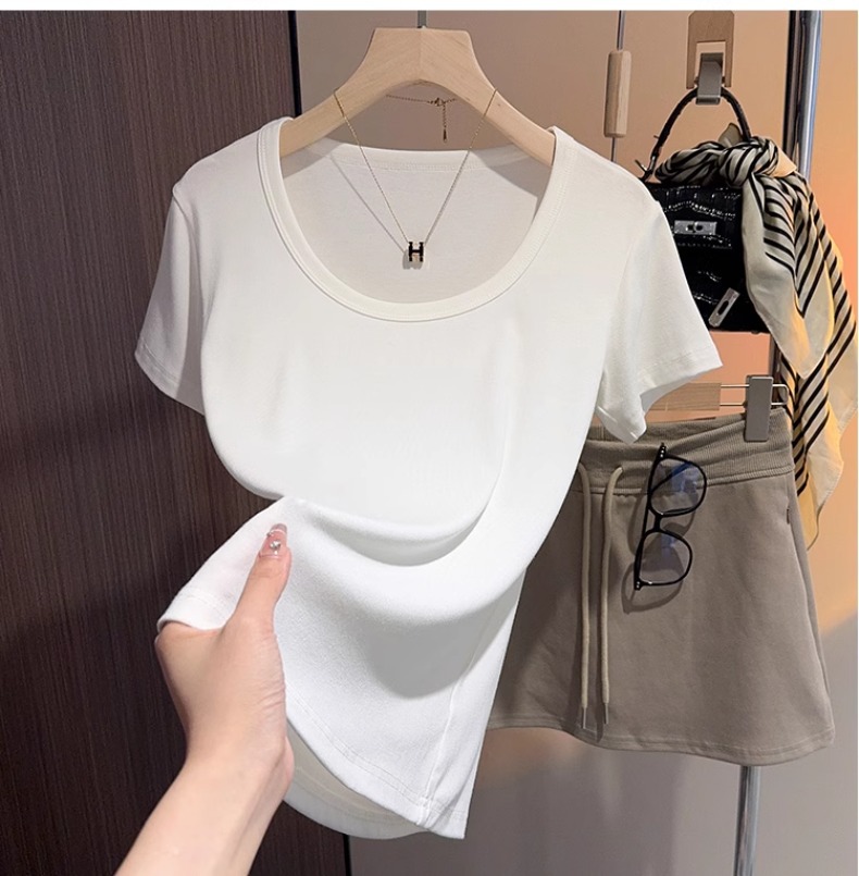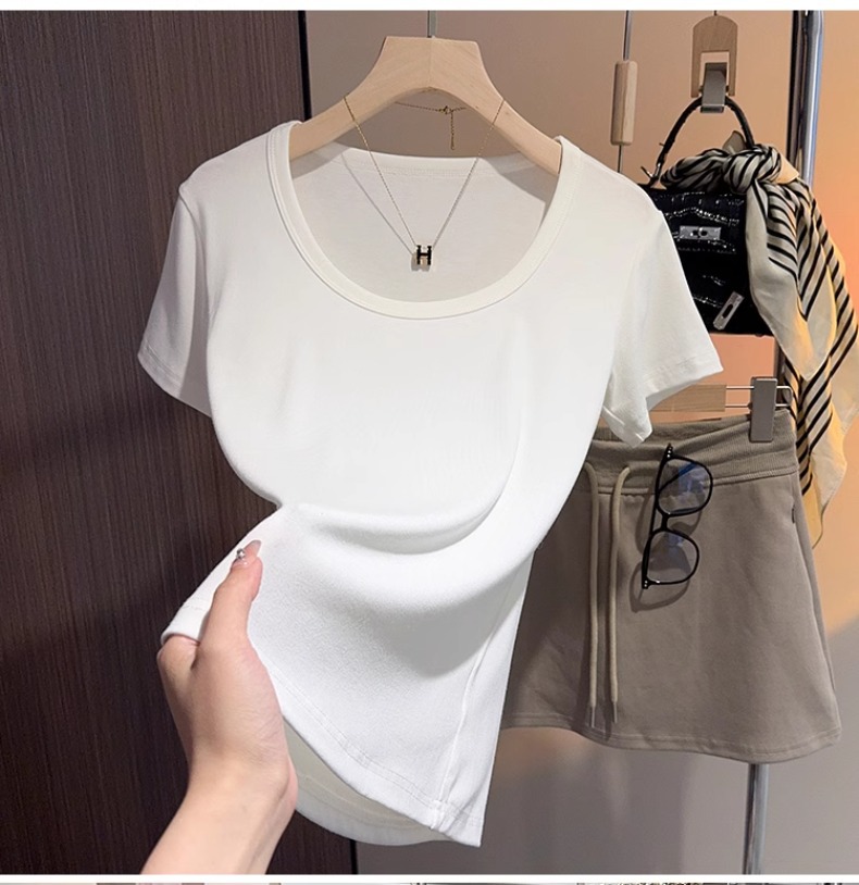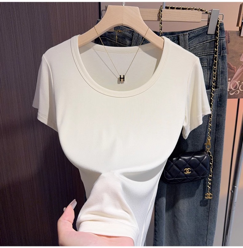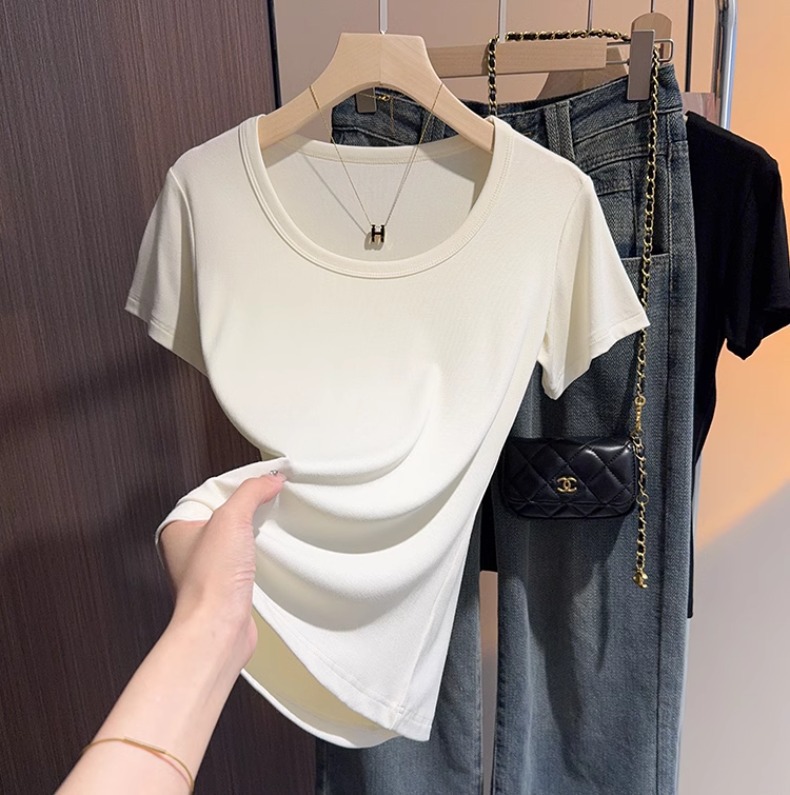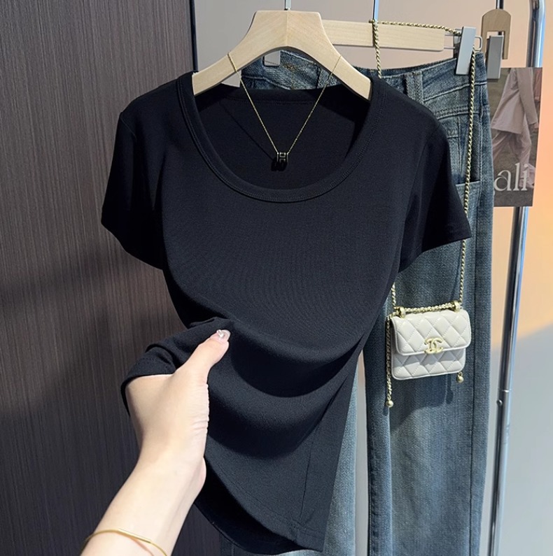 White u-neck short-sleeved t-shirt women's summer 2025 new threaded versatile tight and thin inner bottoming shirt and outer top