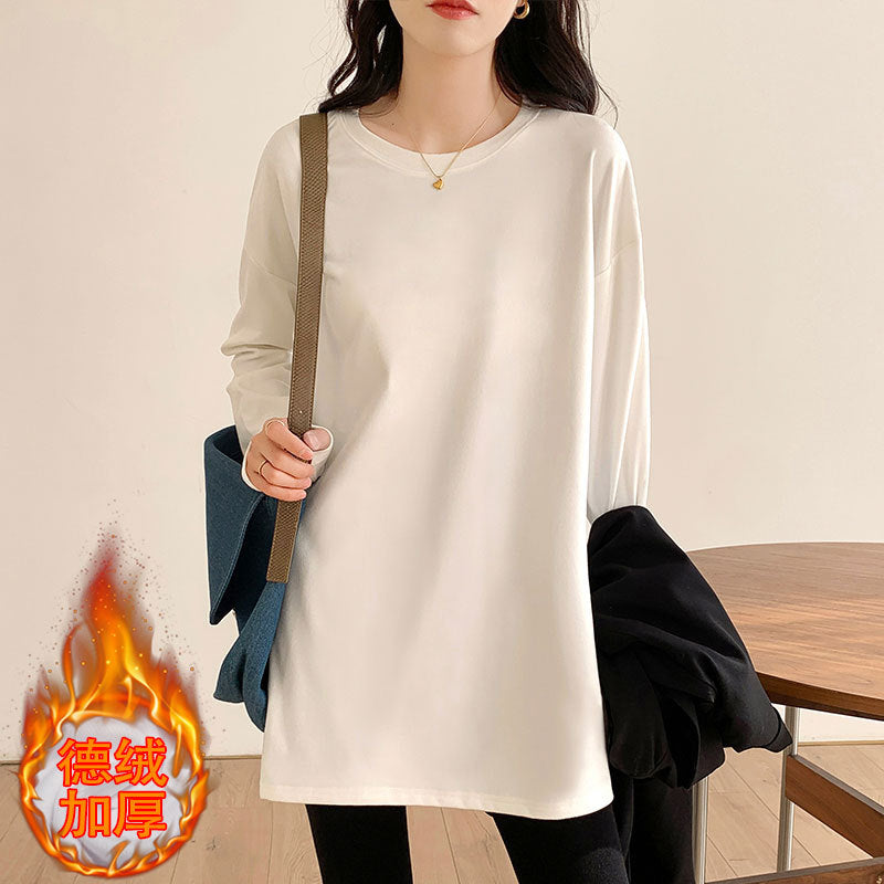 White velvet thickened bottoming shirt for women's autumn and winter long butt cover loose U-shaped hem with long-sleeved T-shirt tide