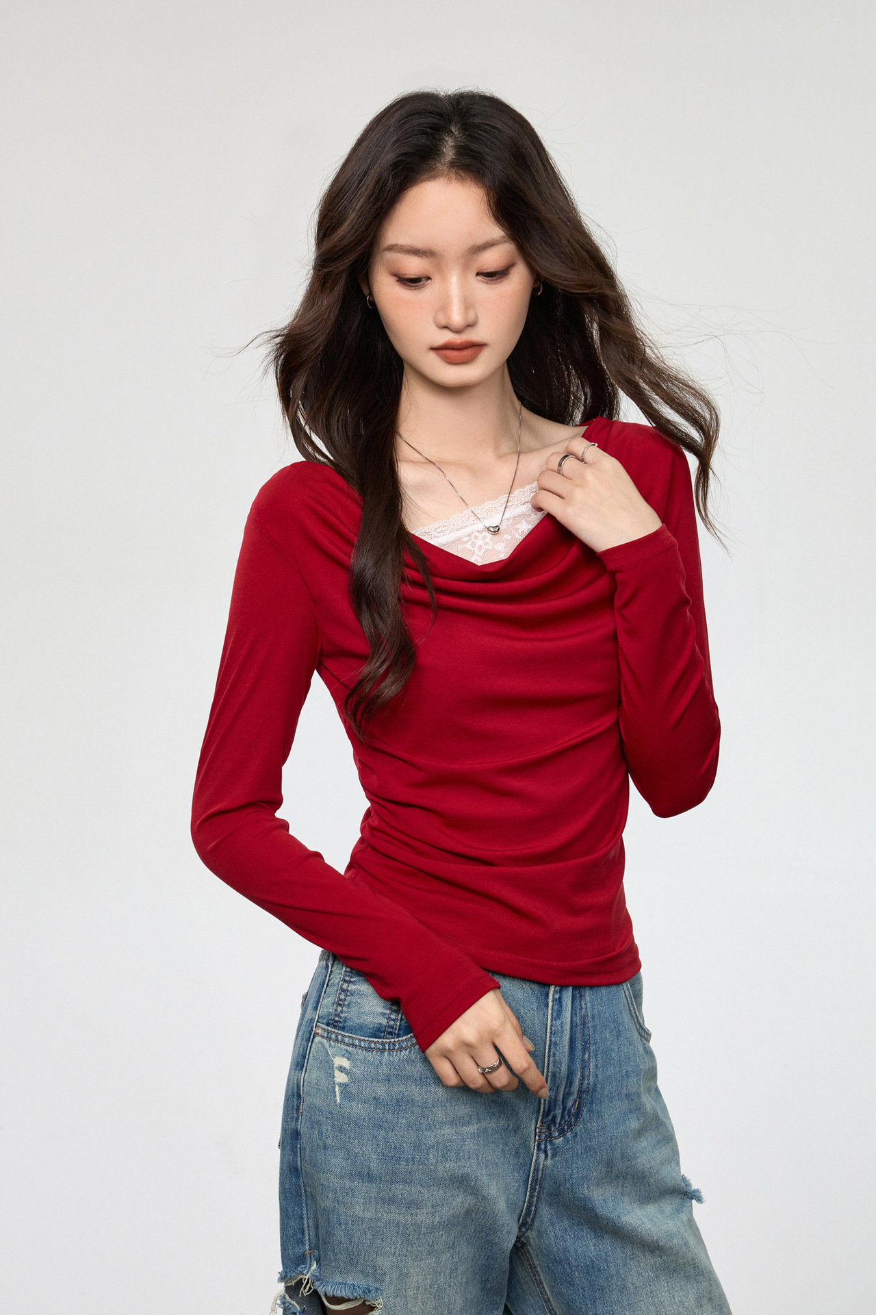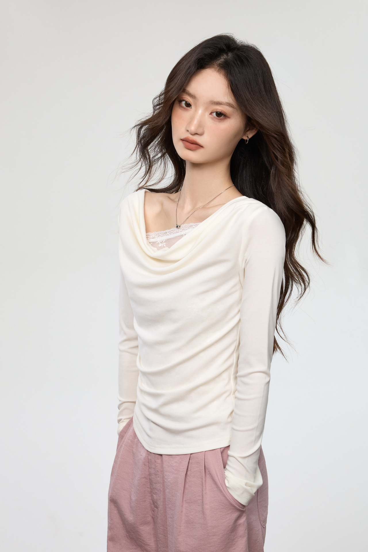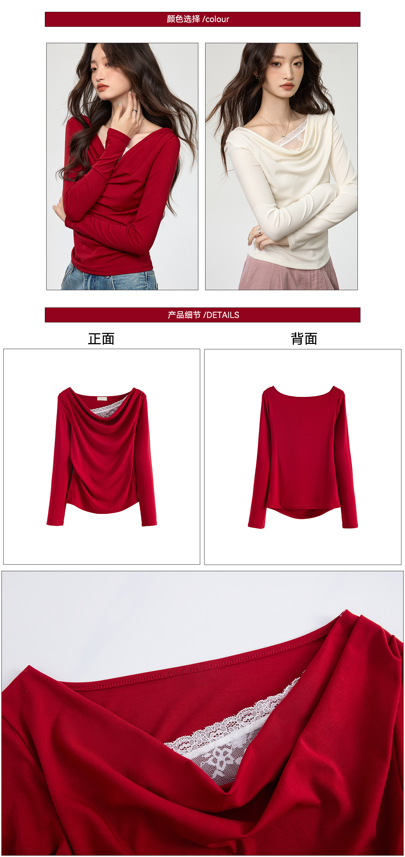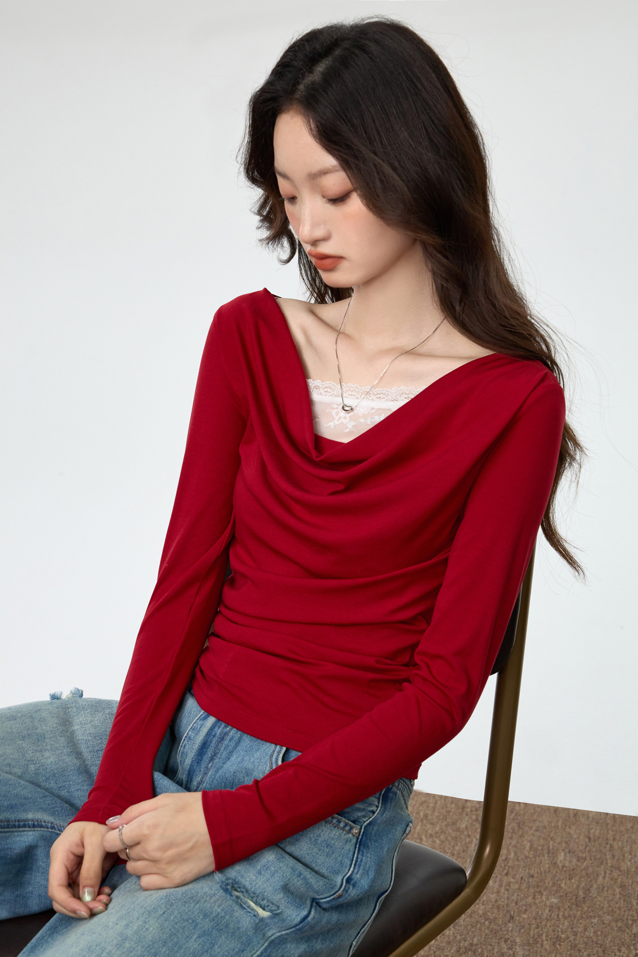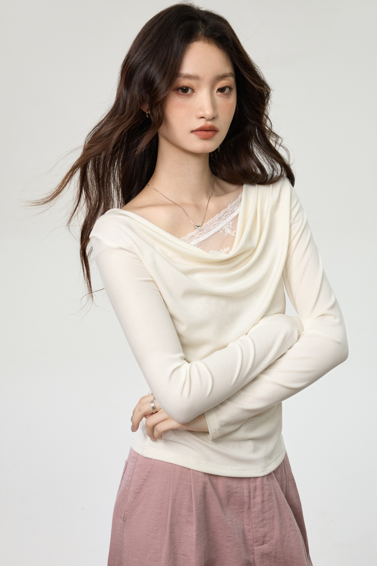 天丝莱赛尔 荡领拼接蕾丝花边假两件长袖t恤女修身褶皱早秋款上衣