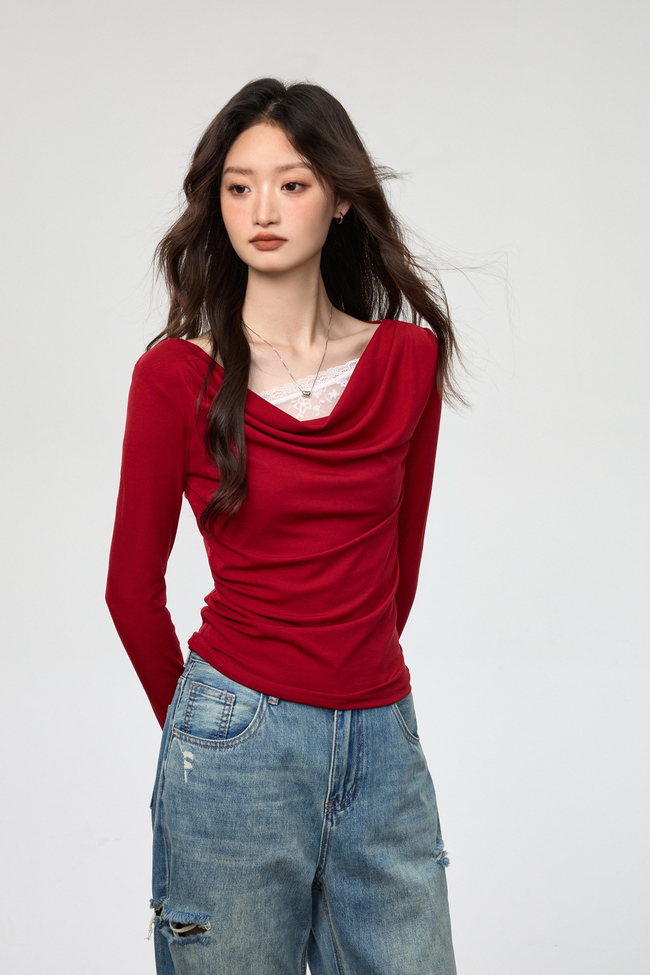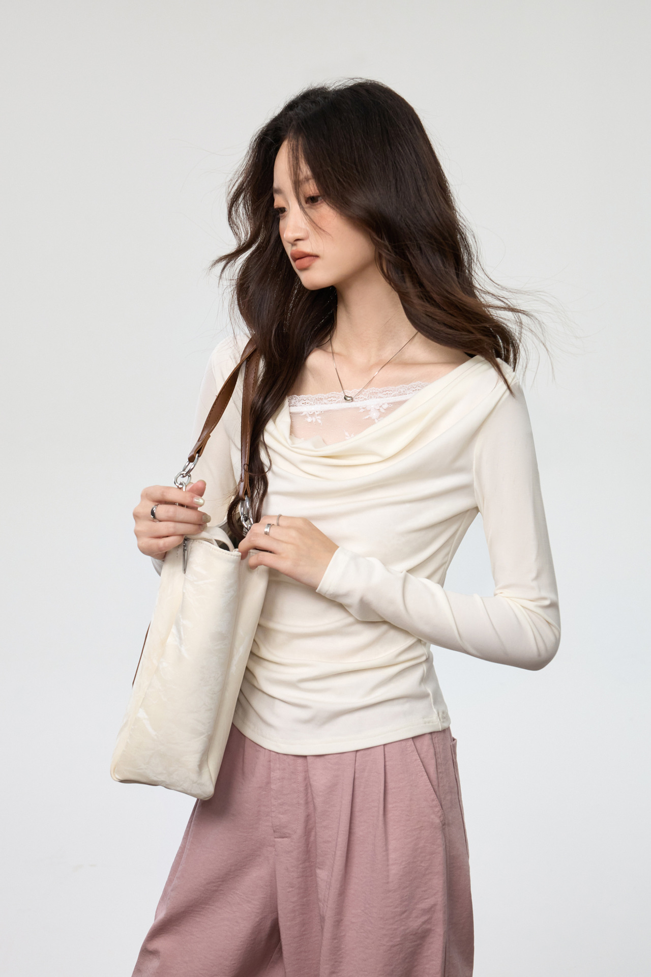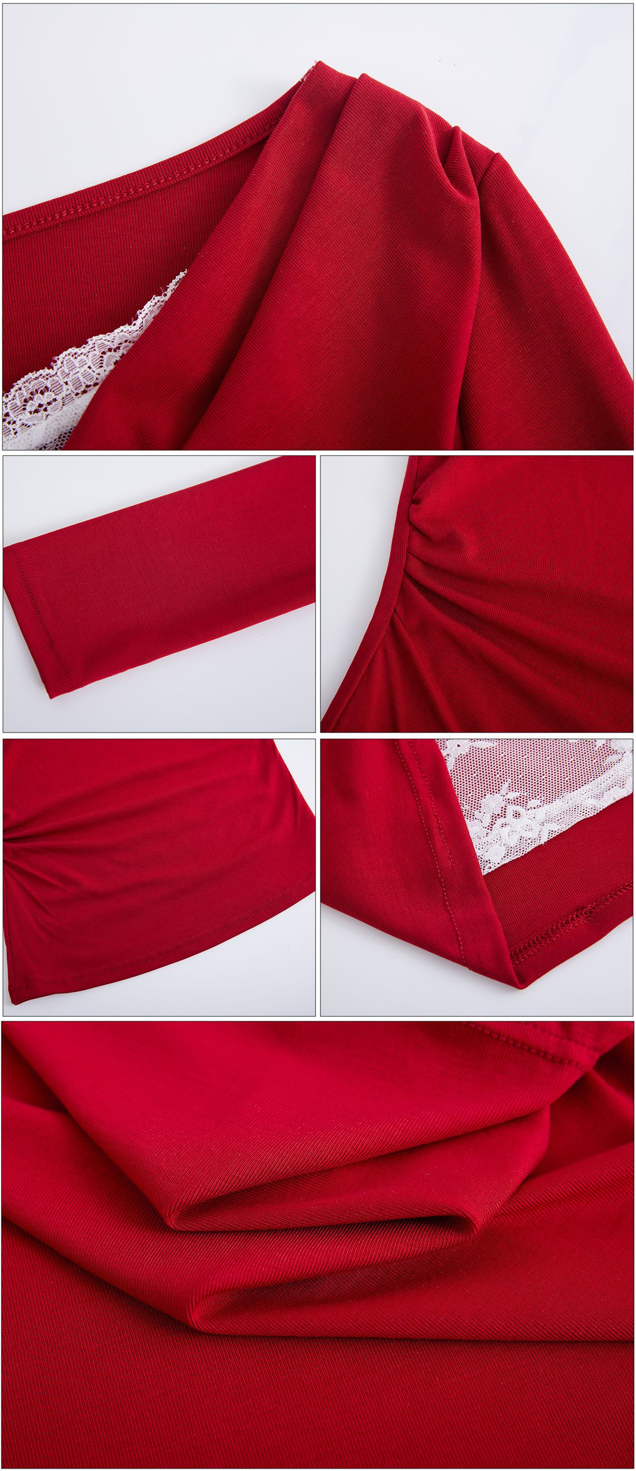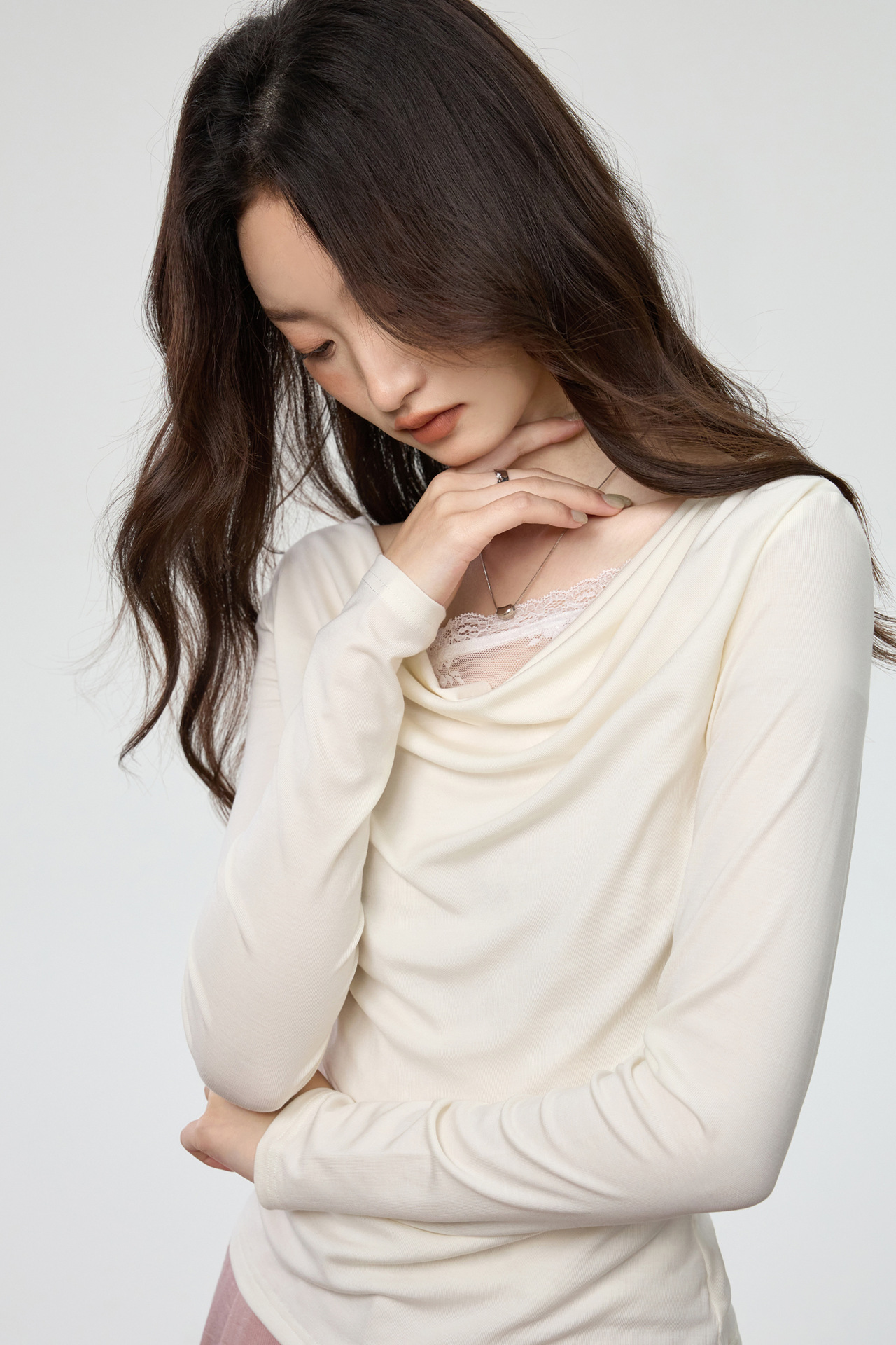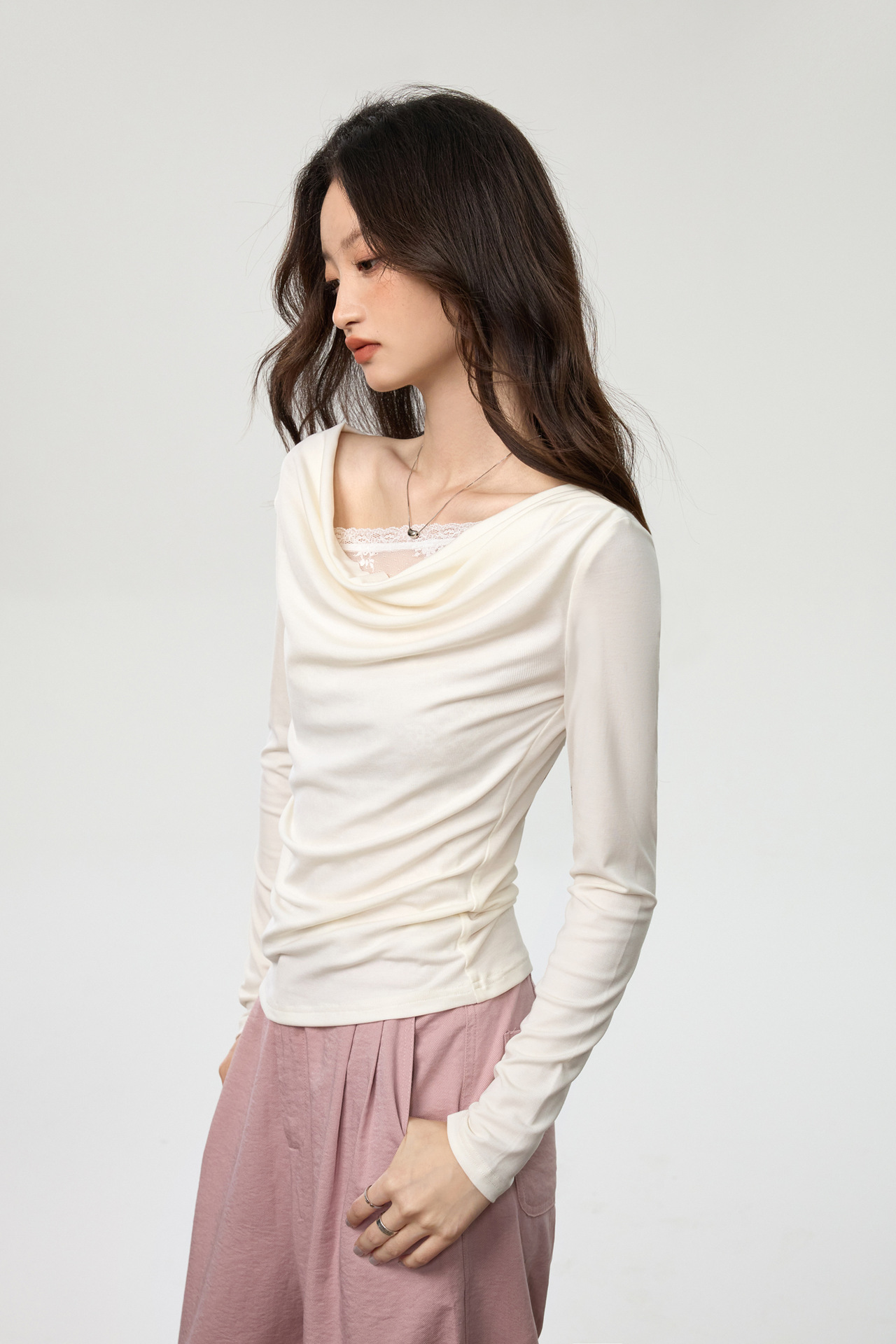 天丝莱赛尔 荡领拼接蕾丝花边假两件长袖t恤女修身褶皱早秋款上衣