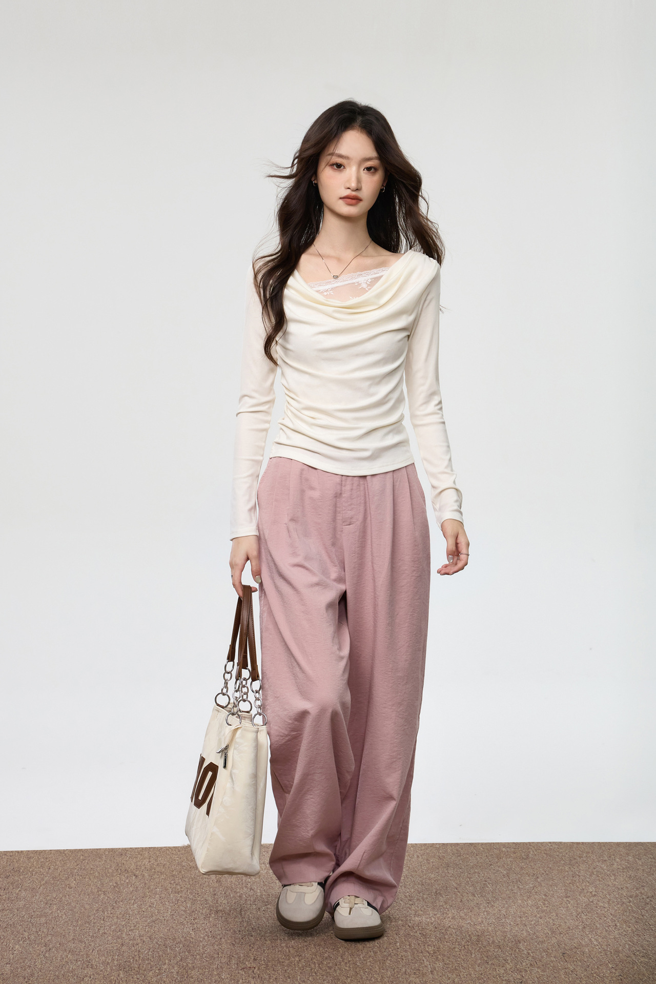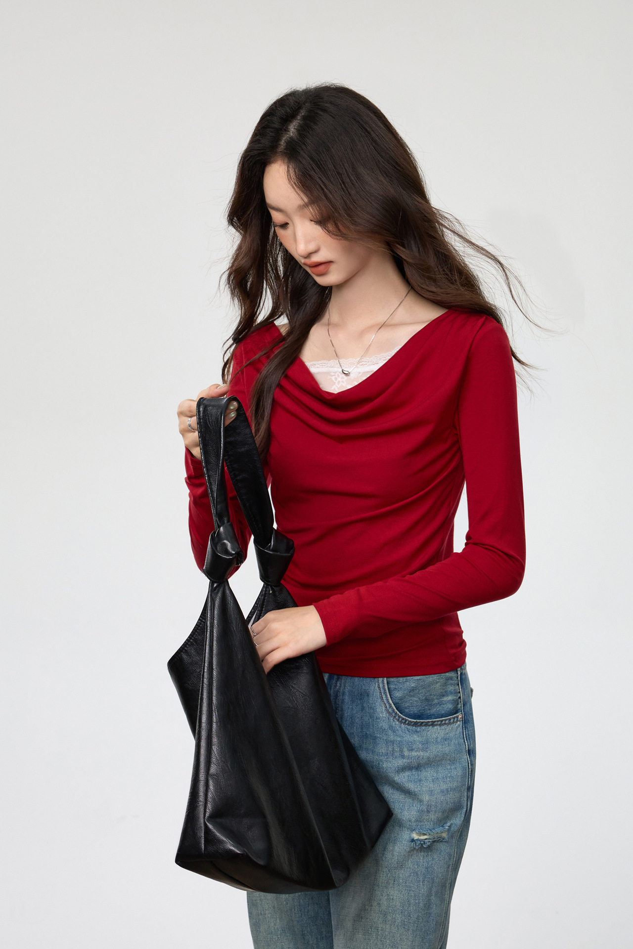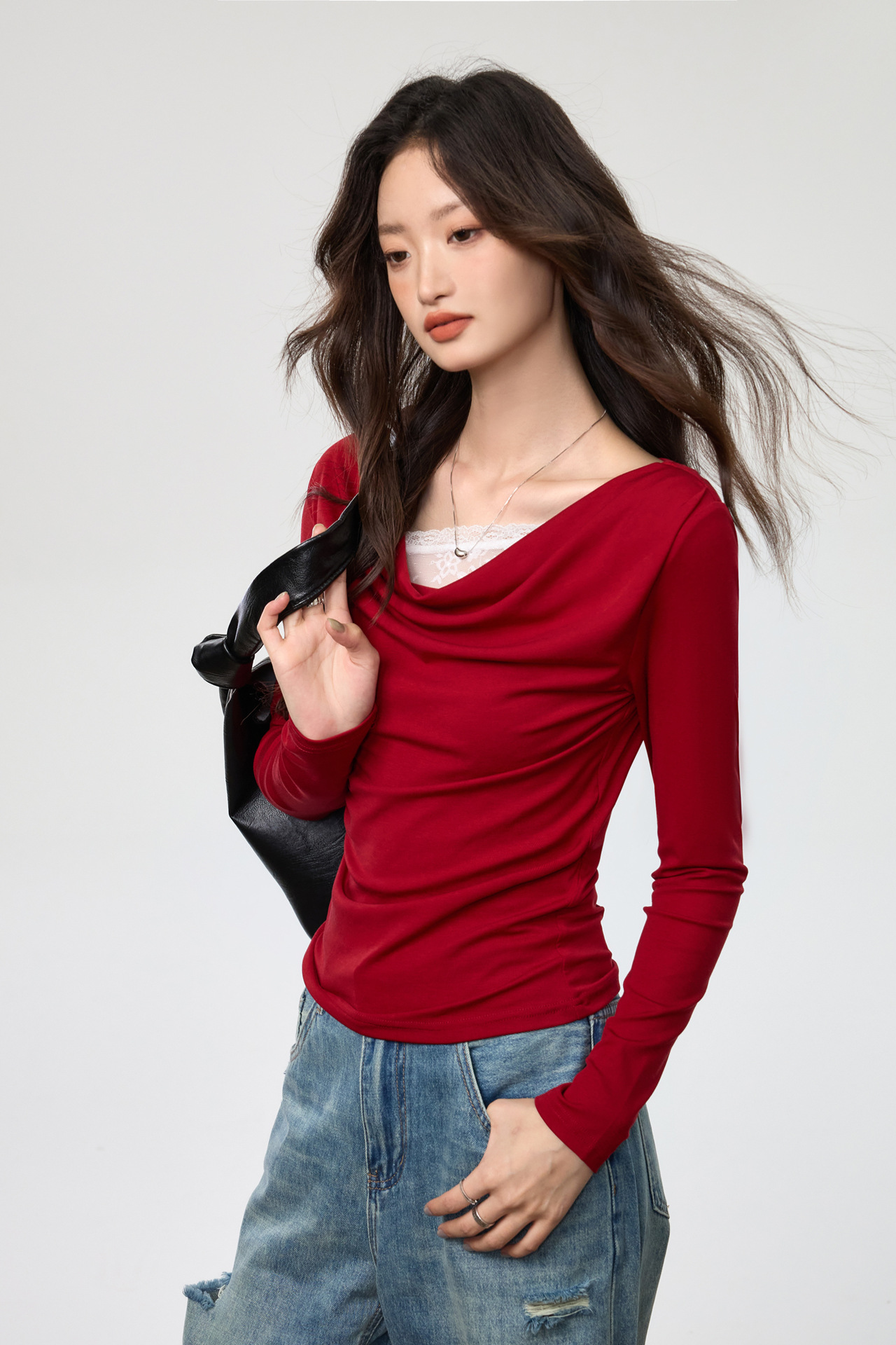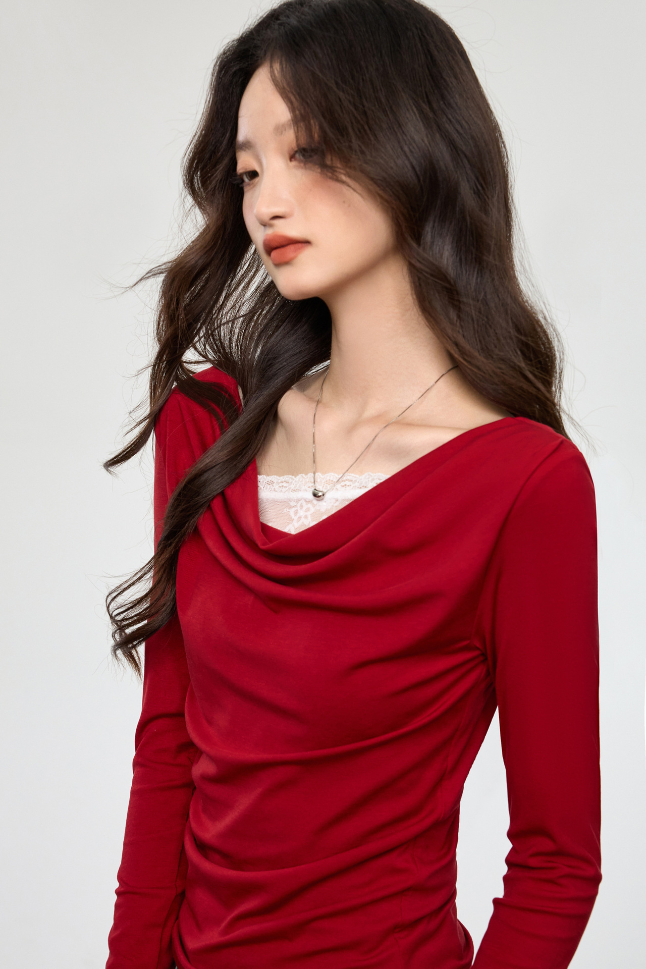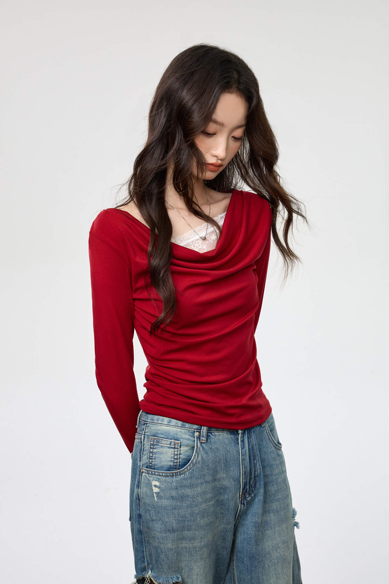 天丝莱赛尔 荡领拼接蕾丝花边假两件长袖t恤女修身褶皱早秋款上衣
