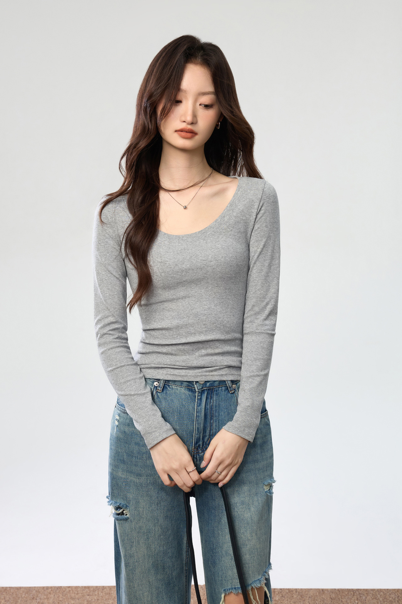 精梳纯棉打底衫女秋新款洋气U领长袖t恤修身百搭简约纯色内搭上衣