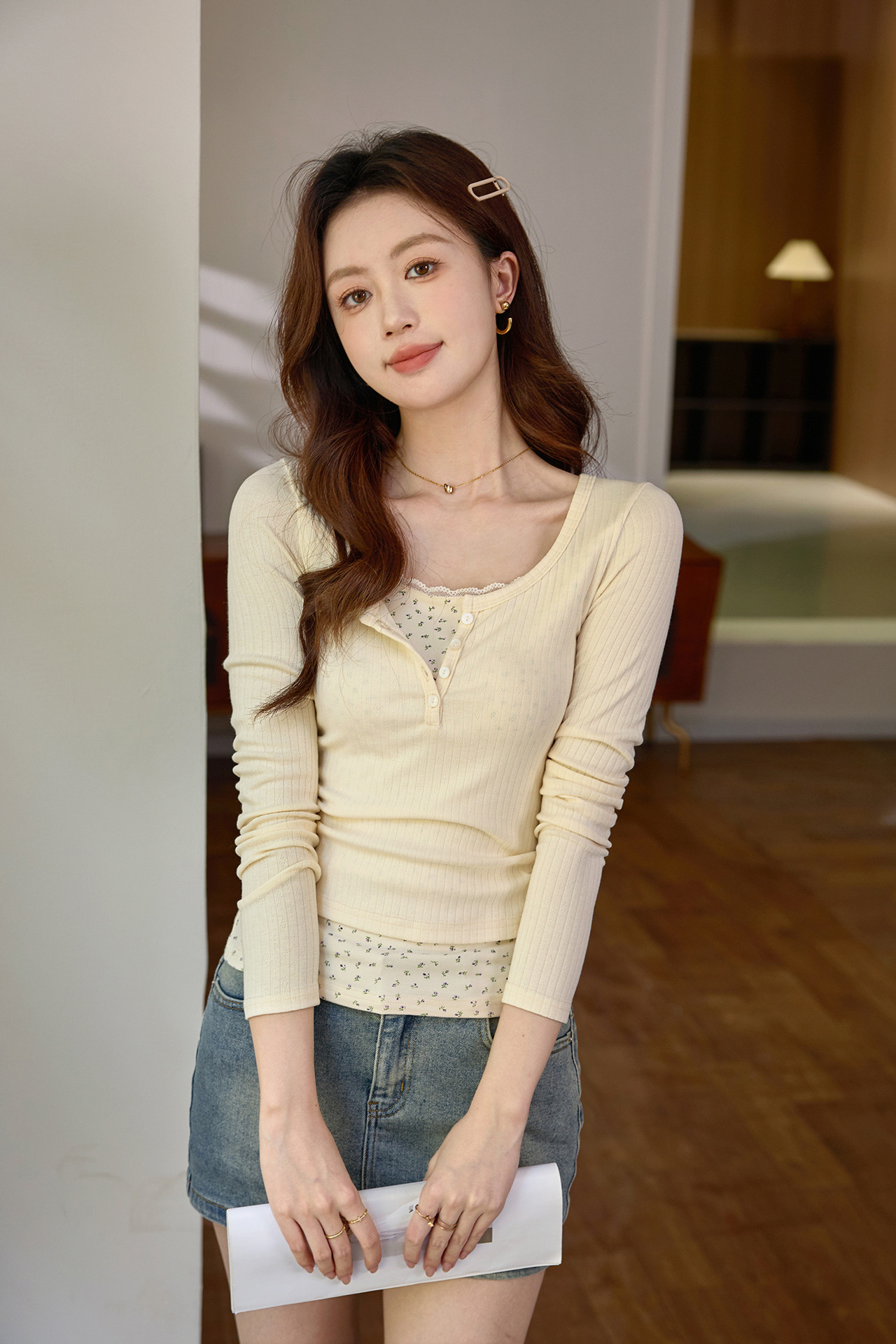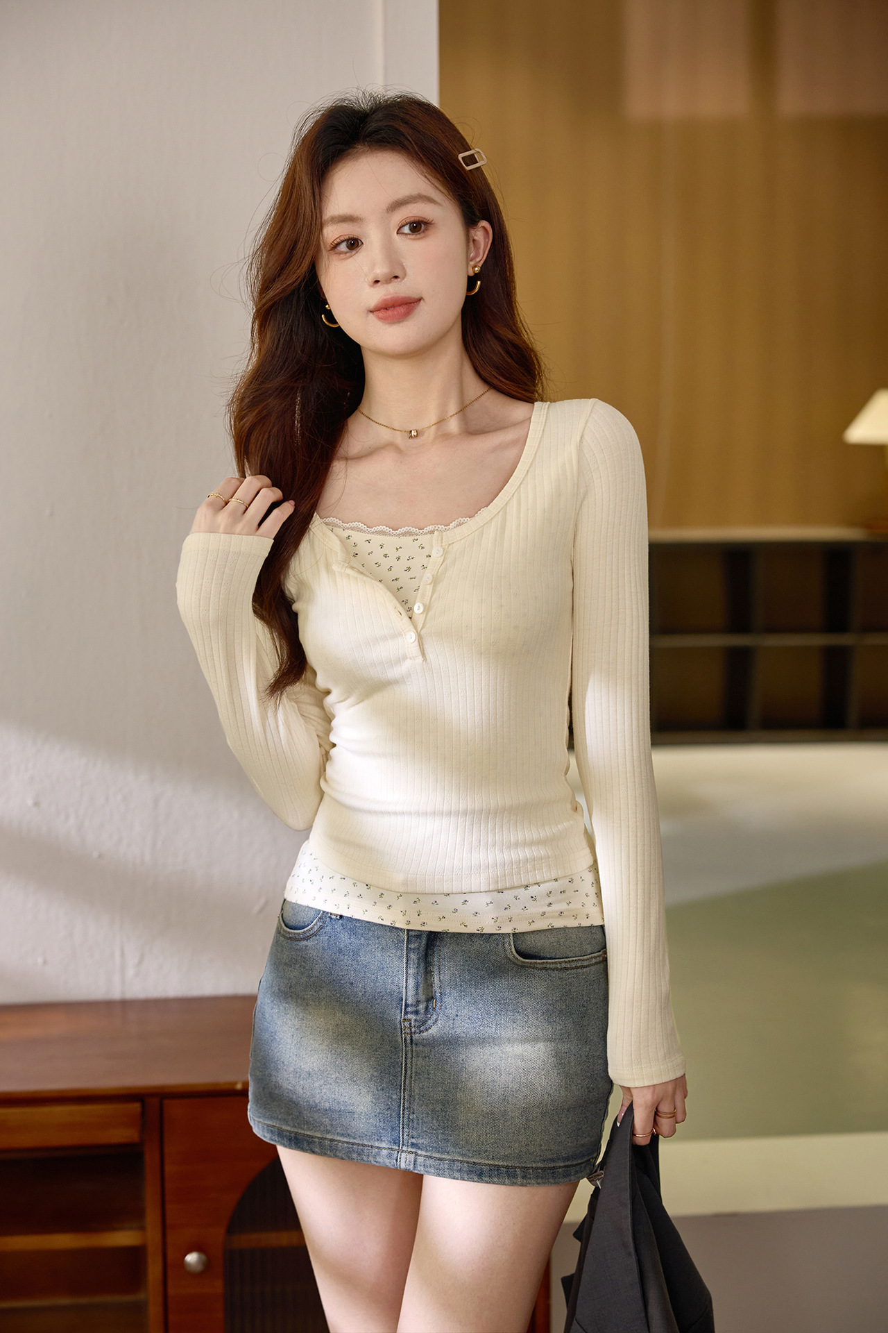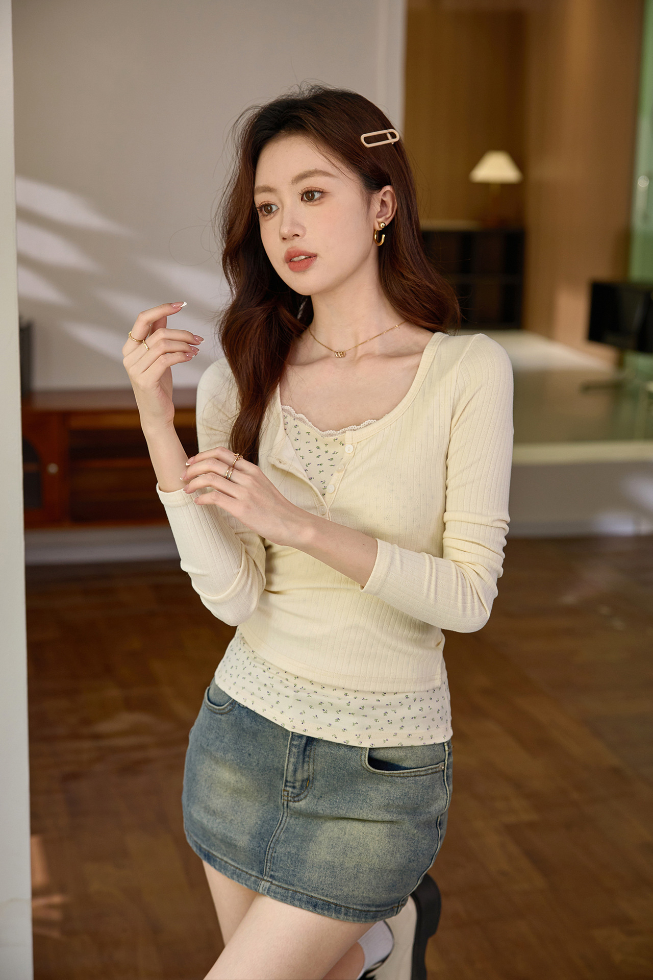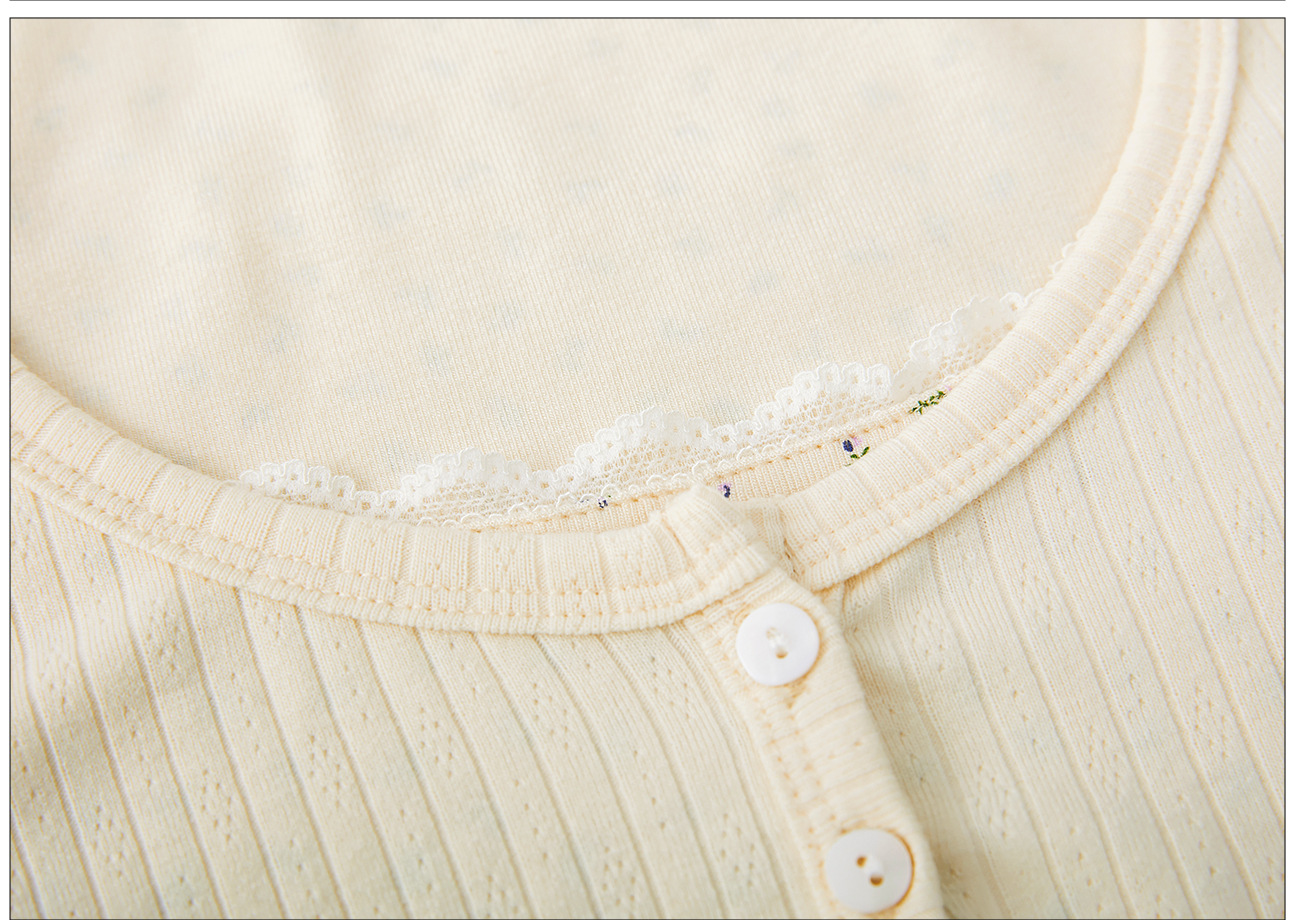 #Excellent selection #Fake two-piece splicing floral lace edge long-sleeved T-shirt women's design sense foreign style retro top