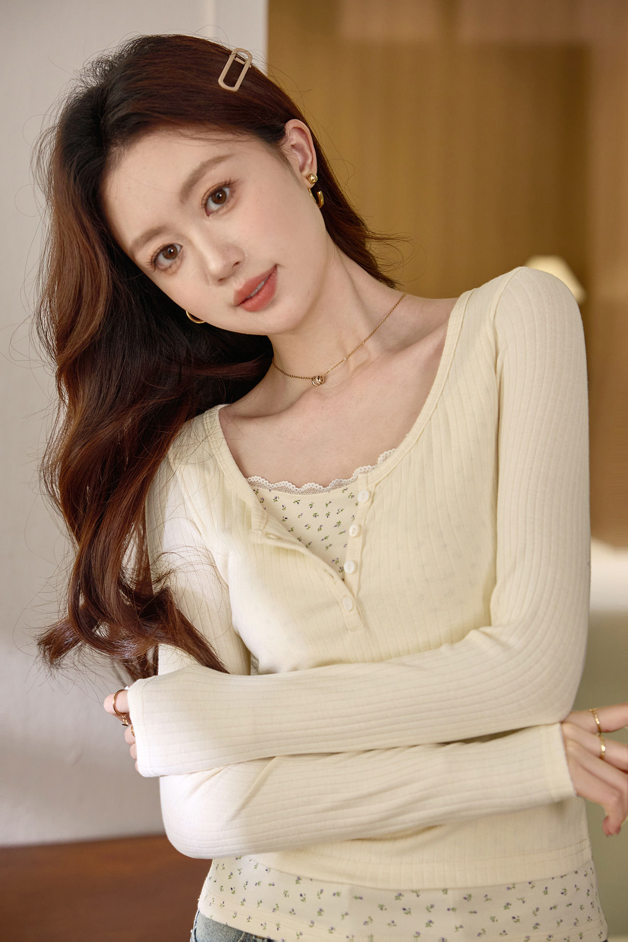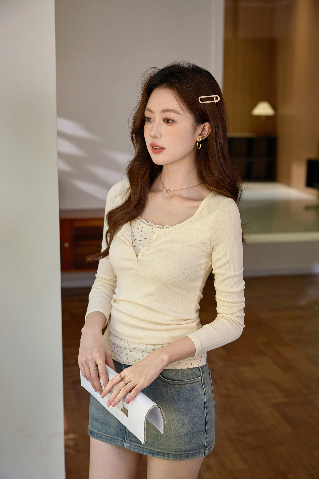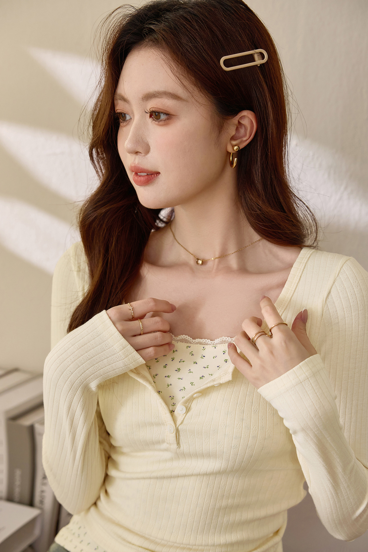 #Excellent selection #Fake two-piece splicing floral lace edge long-sleeved T-shirt women's design sense foreign style retro top